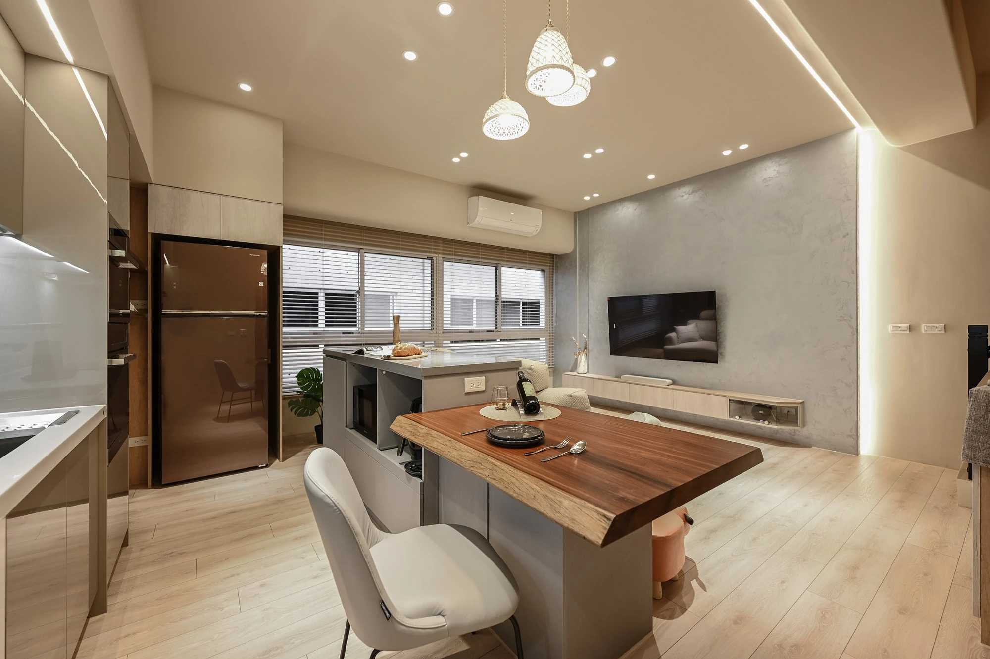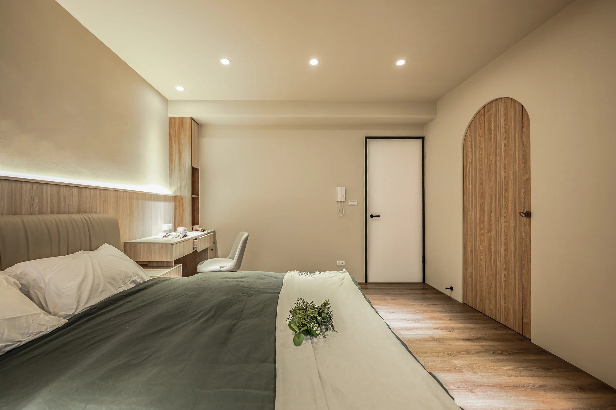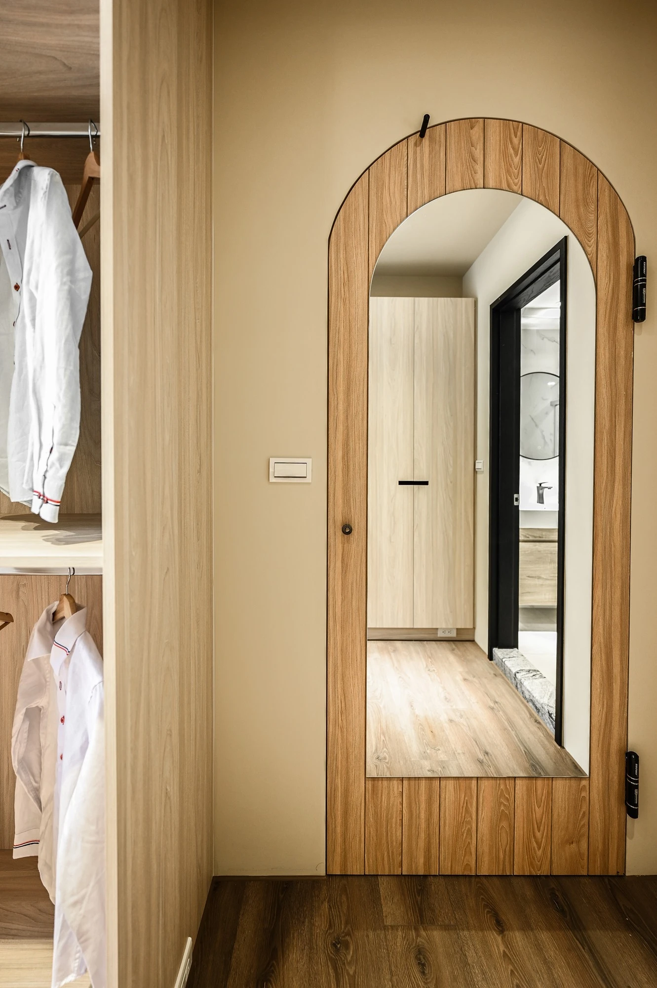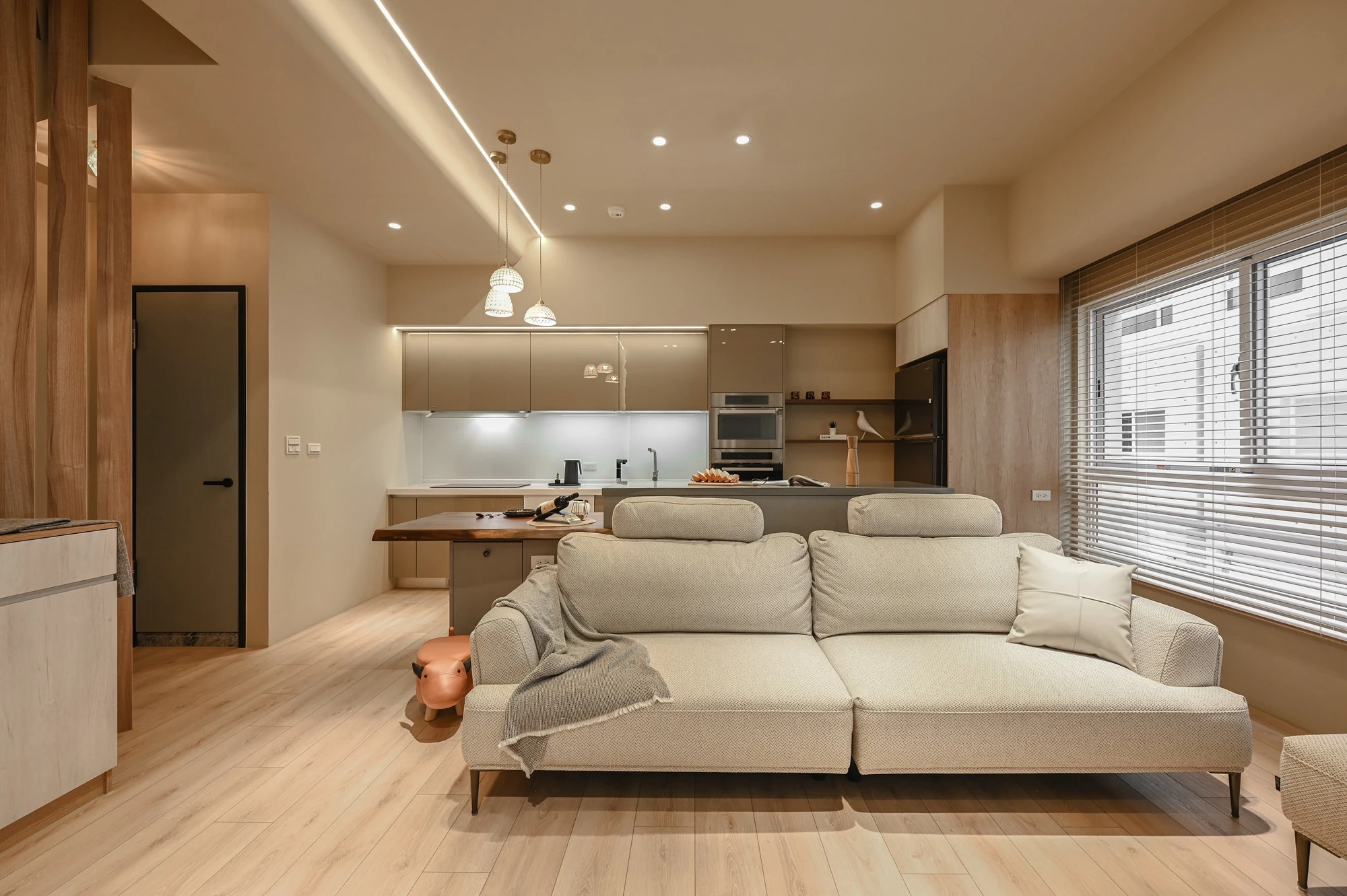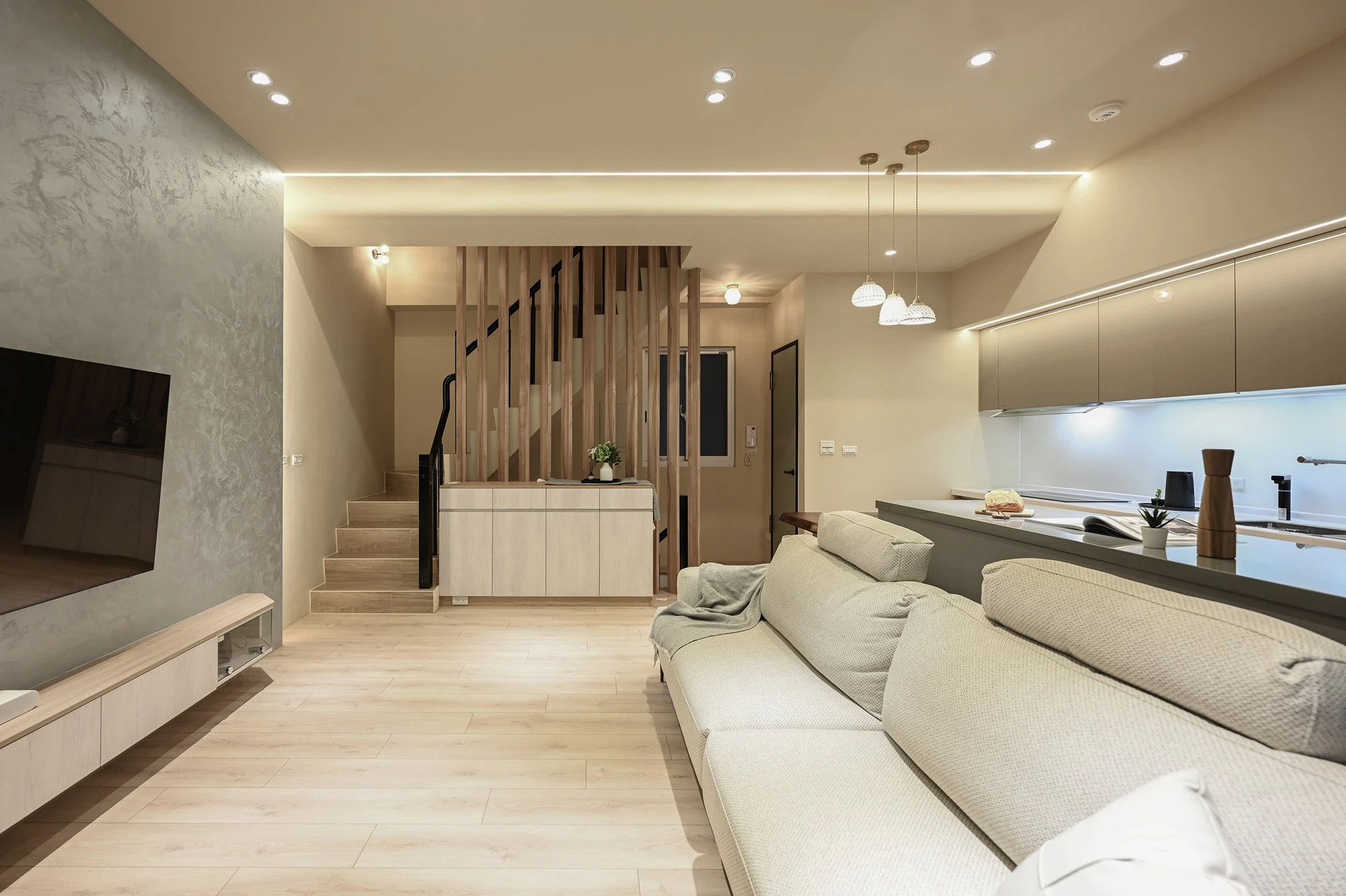 新成屋的案例美宅,我們以北歐風的溫柔底蘊作為設計起點,揉合自然材質與柔和光感,描繪一幅簡約卻細膩的居家風景,步入玄關,映入眼簾的是格柵牆設計,兼具視覺引導與空間分界,讓家的第一印象簡約而有層次;開放式餐廚空間延展了空間尺度,讓料理與日常交流自然流動,明亮、開放且富有溫度。空間中穿插的弧形門框與造型鏡面,柔化線條語彙,也成為串連視覺的藝術節奏,臥室以床頭線燈勾勒靜謐光影,搭配暖色調牆面與溫潤木地板,營造出放鬆療癒的私領域氛圍,精品級的衛浴空間和理石花紋鋪陳細節質感,在每個轉身之處,都藏著生活的細節品味,這不只是空間的打造,更是生活美學的實踐。
