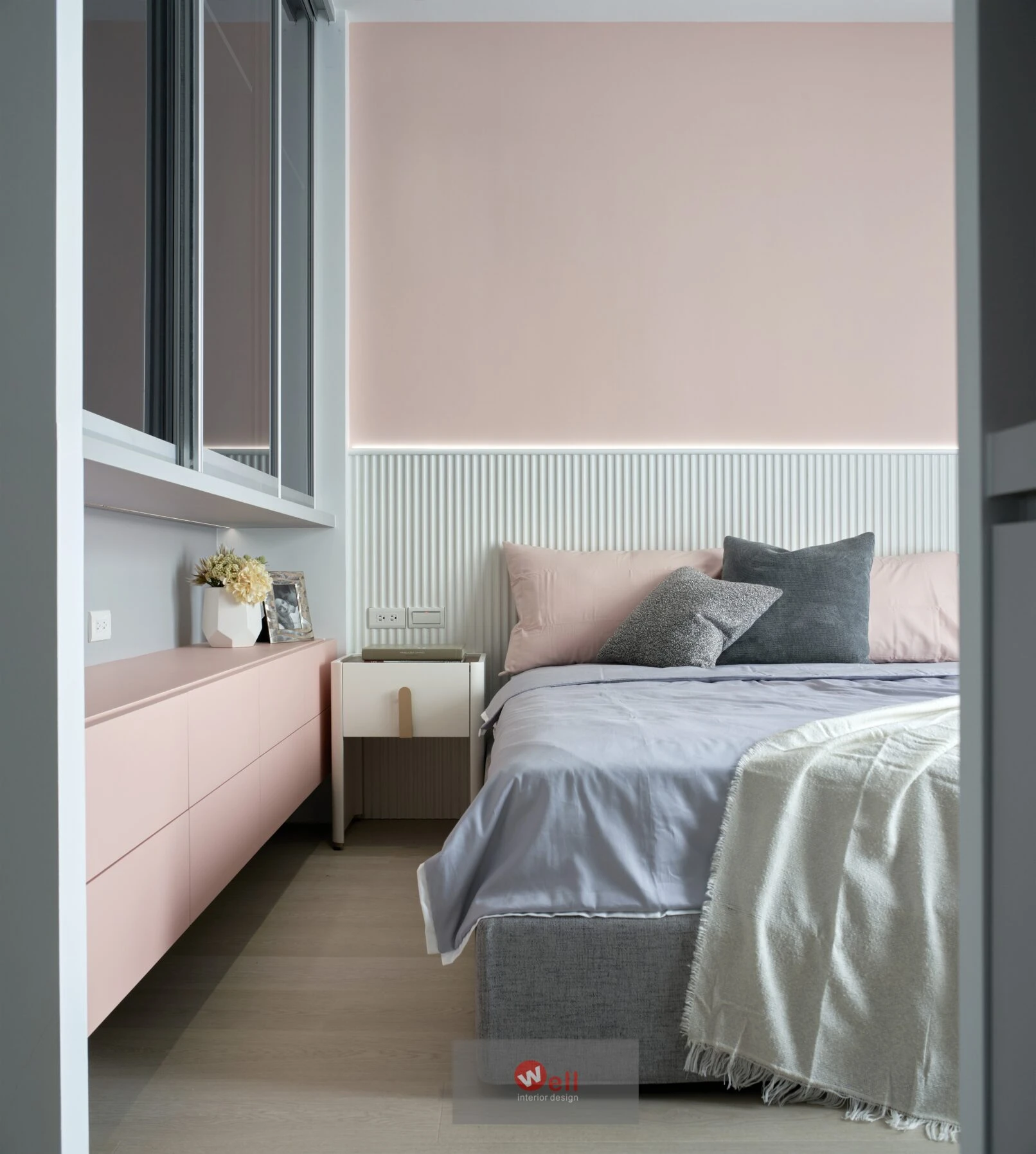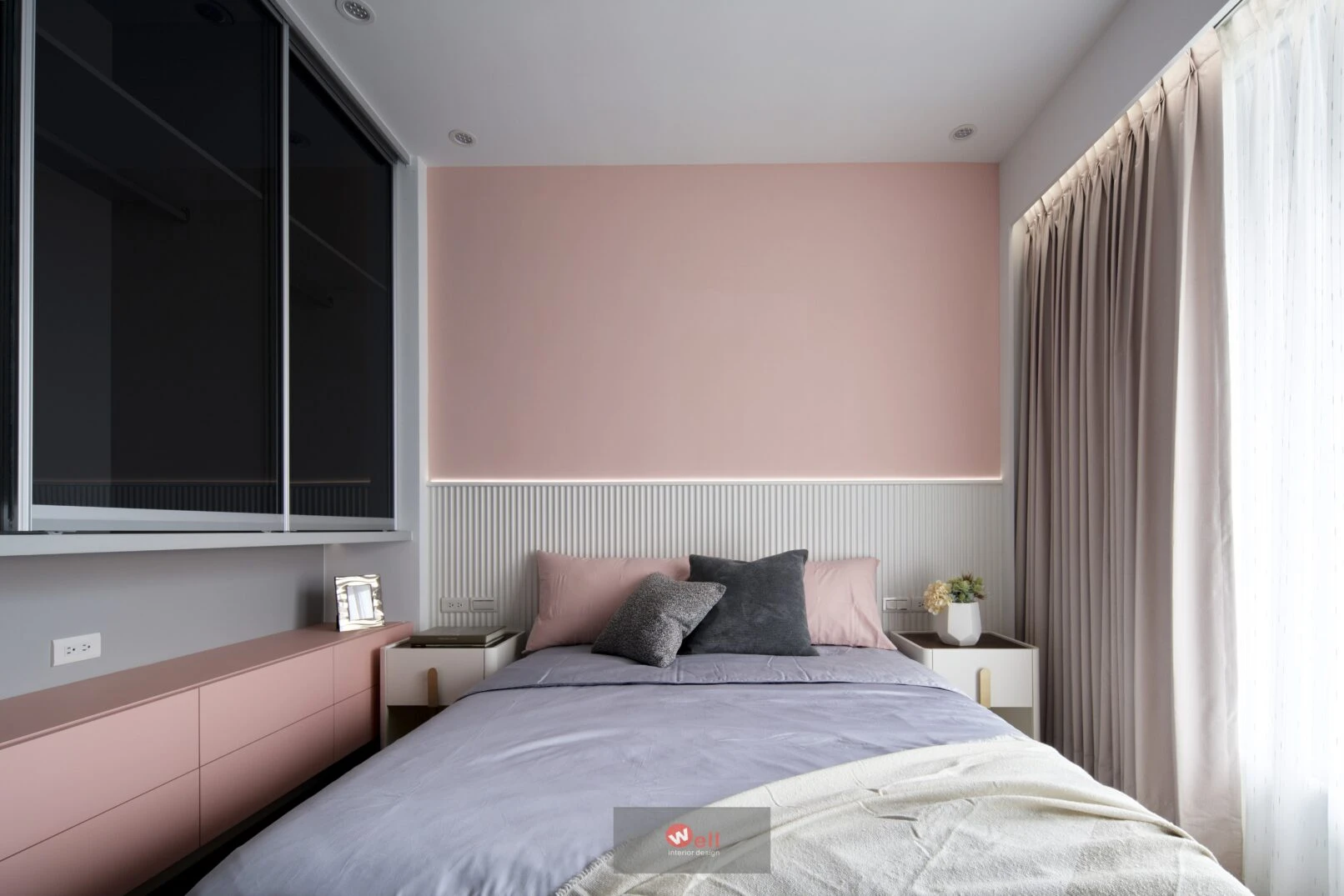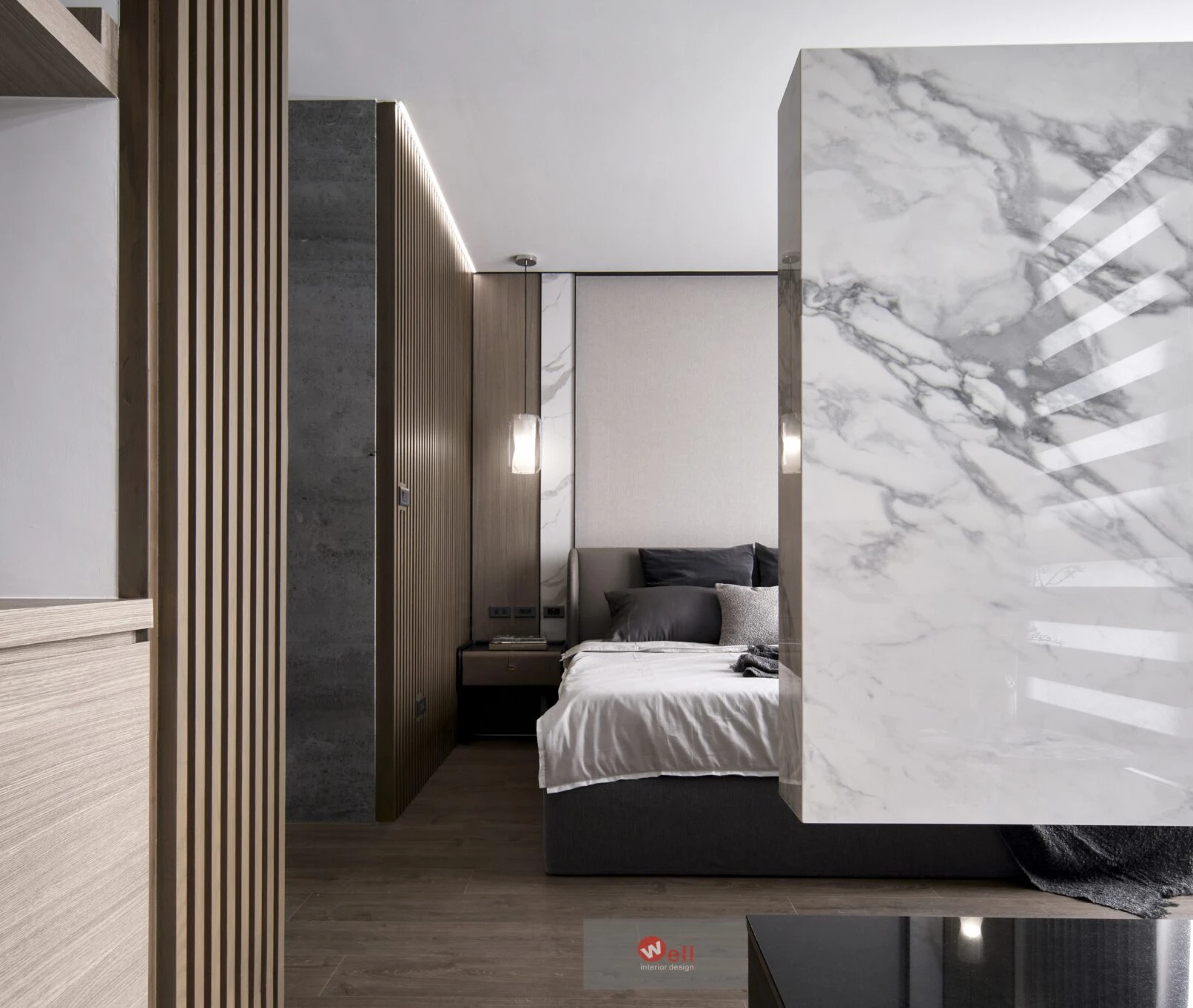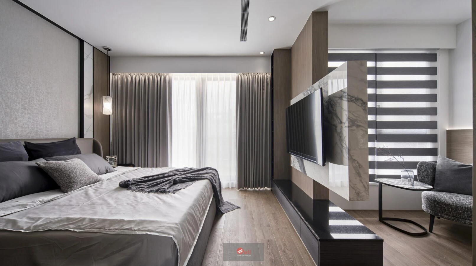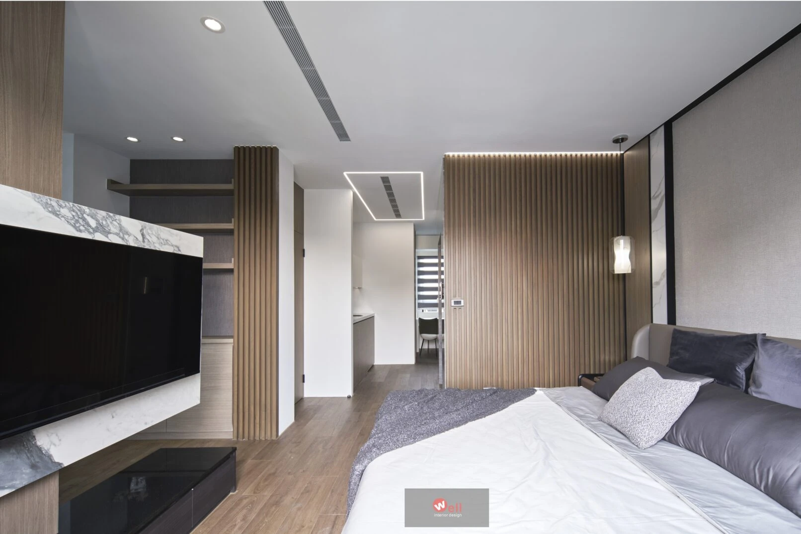 四樓全層為主臥專用:入口門旁貼心設置茶水吧,床尾處另以電視半牆,靈活界定一方多功能區,為未來五到十年的階段變化預留彈性。