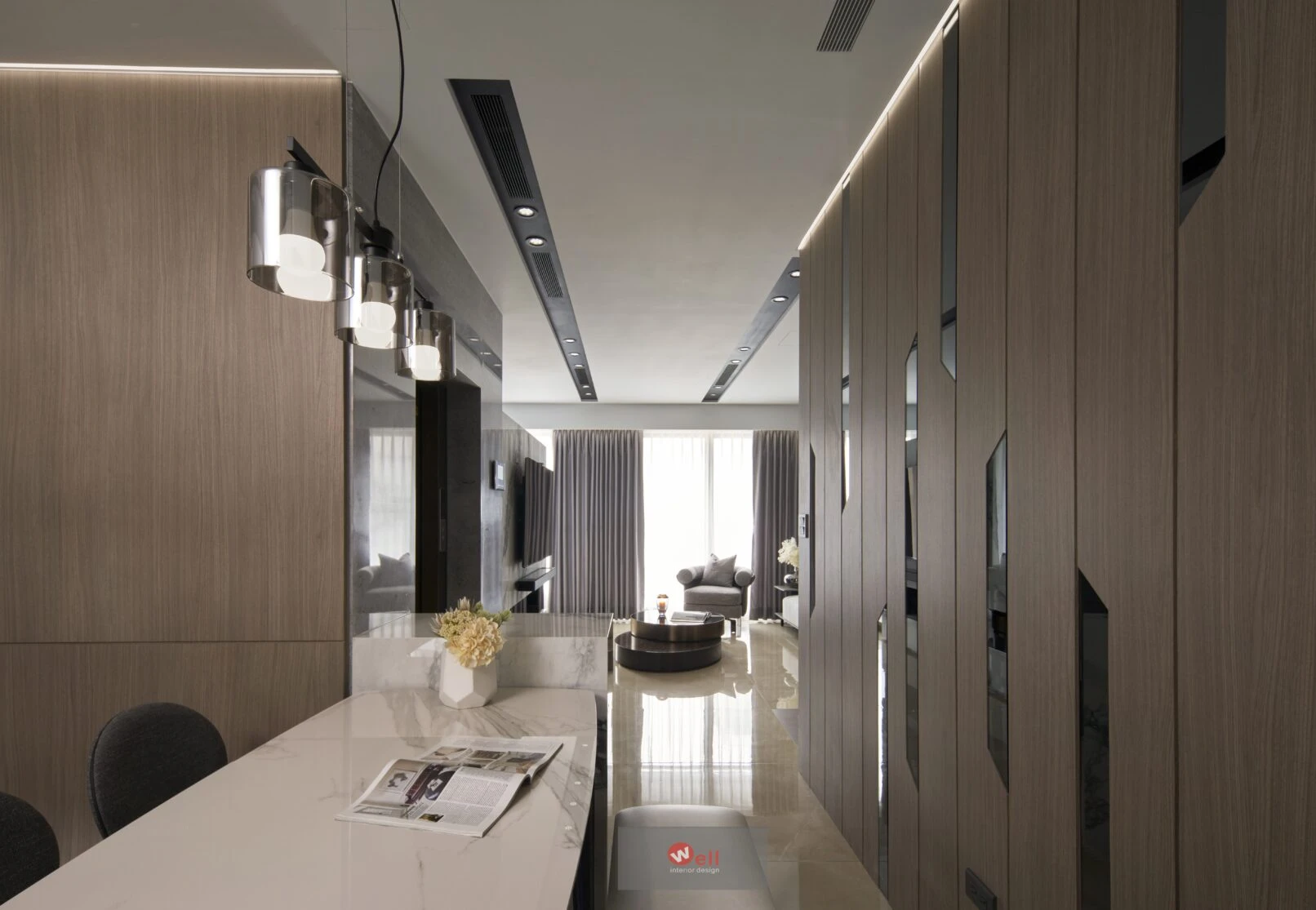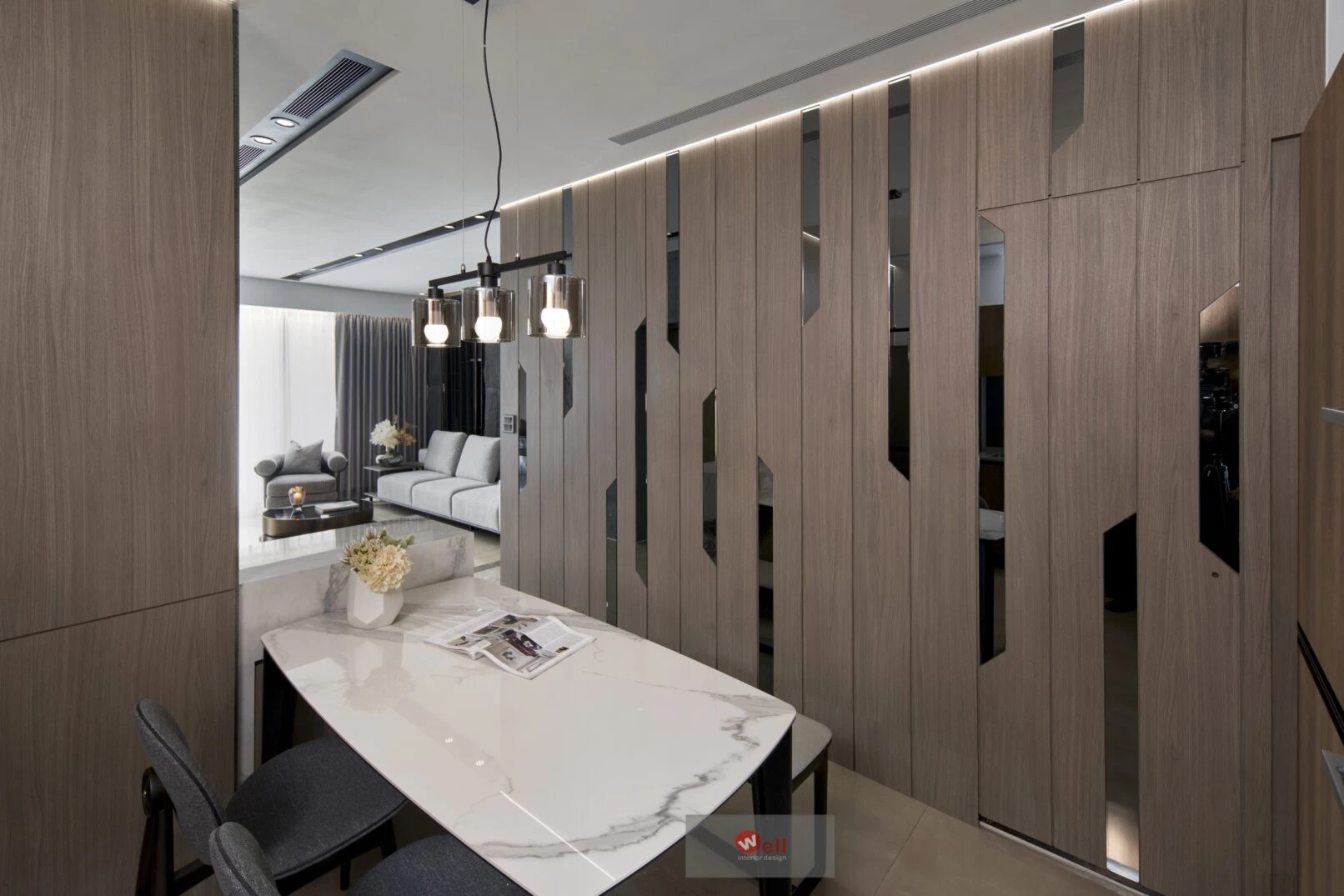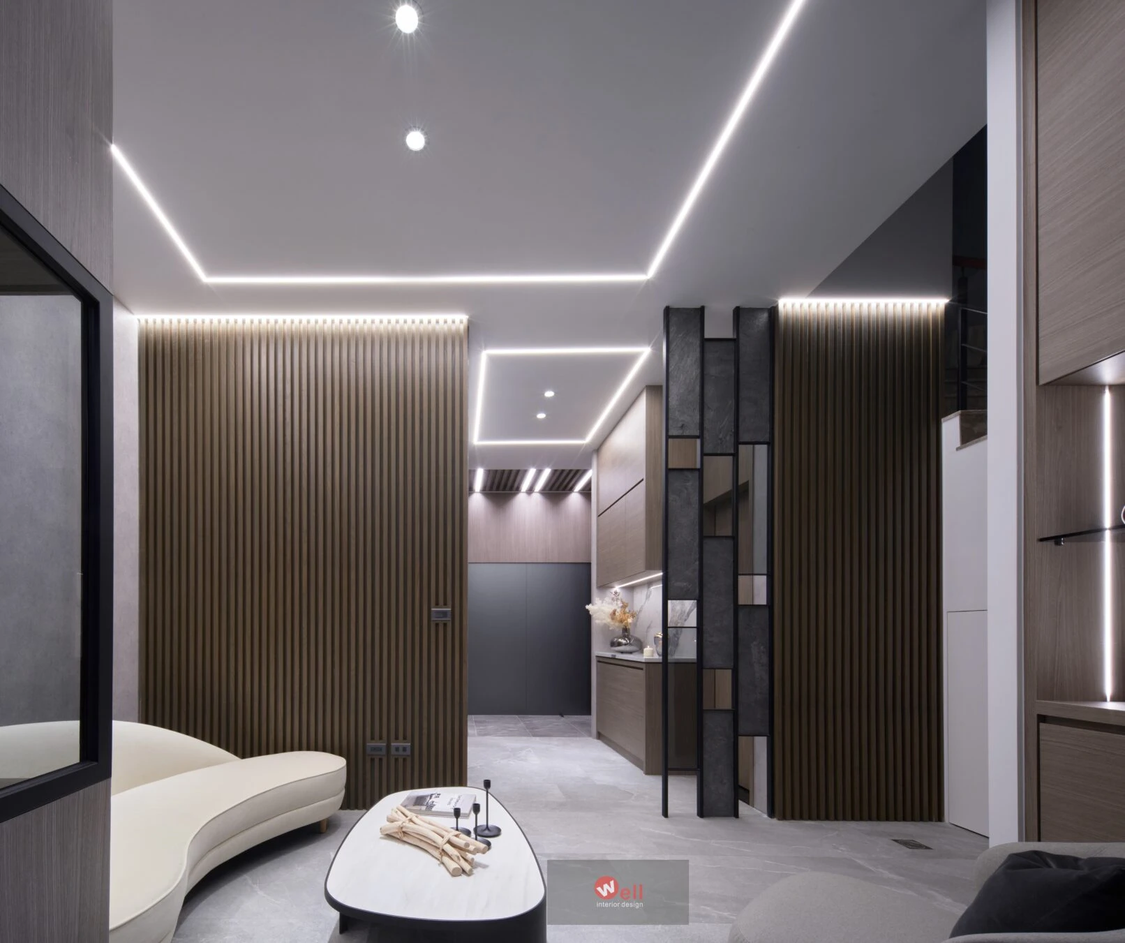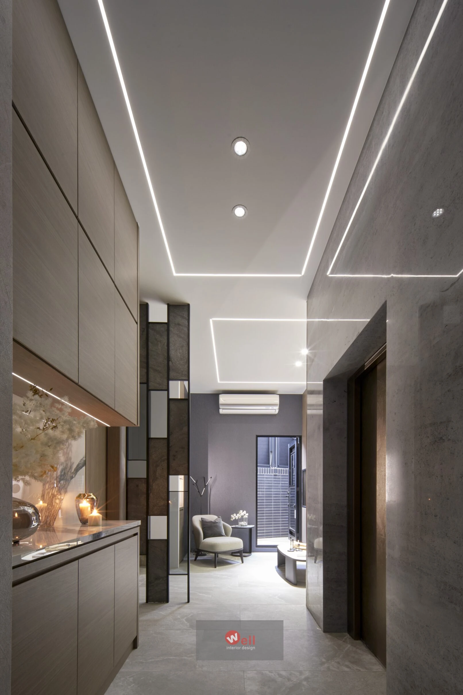 初期依據委託方作息、成員需求,逐層安排獨立機能場域,包括一、二層公區和三層以上私領域;其中又以一樓導入微型精品飯店概念的迎賓Lobby暨休閒廳別具巧思,其次是透過精湛異材質搭配、沈穩演色和精準比例,不僅賦予居宅舒緩、療癒的親自然氛圍,更擷取俐落線性語彙,以分割、組接、排列、燈帶、空調迴風等型態植入空間三維,而宅中多處兼顧審美、養護省力且實用的造型連續面,例如二樓客廳自電視牆經電梯口至高餐檯、餐桌的聚落式佈局,除了劃分客廳與書房的電視牆兩面可用,由電梯口右側定位的餐檯、長桌陣列,加上另一側整合浴室入口的灰鏡木質牆反射光影,都讓餐廚共享的空間感明顯放大,相對關係也更為自在親暱,甚至順勢消弭中段梯間衍生的收束壓迫,極限優化空間尺度與效益。