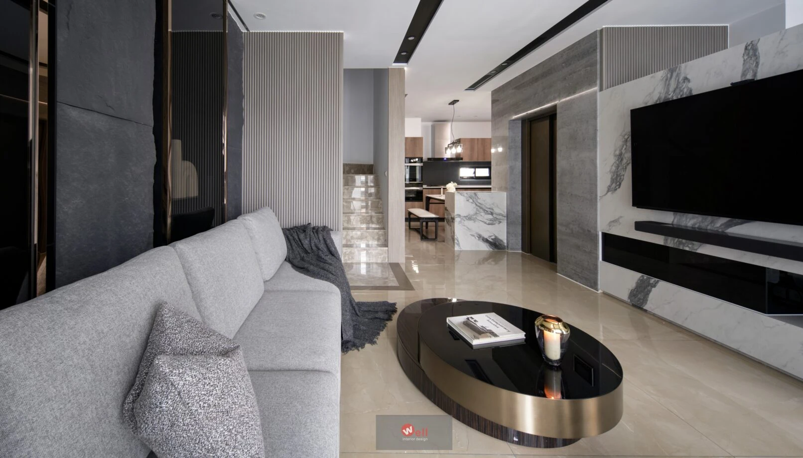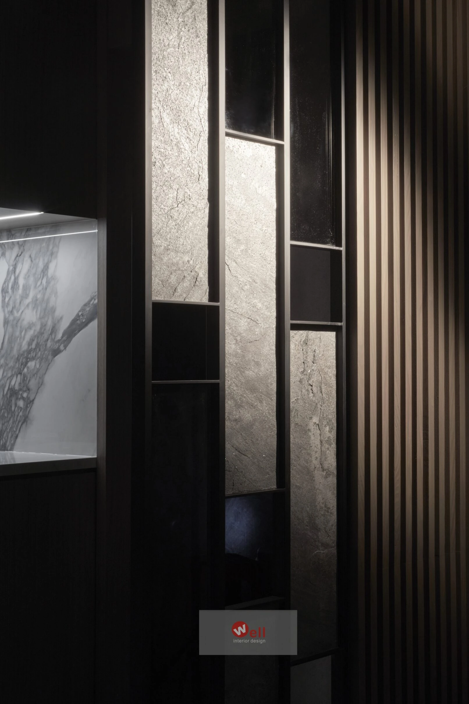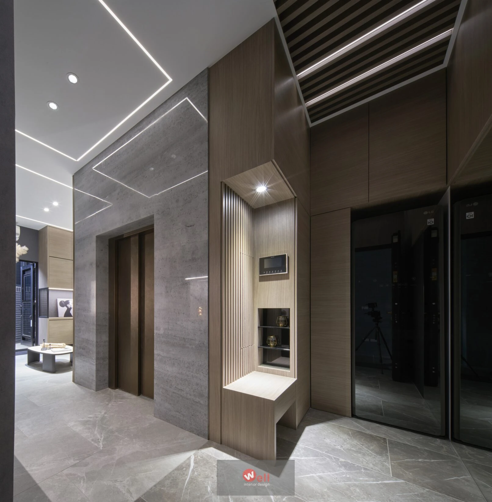 初期依據委託方作息、成員需求,逐層安排獨立機能場域,包括一、二層公區和三層以上私領域;其中又以一樓導入微型精品飯店概念的迎賓Lobby暨休閒廳別具巧思,其次是透過精湛異材質搭配、沈穩演色和精準比例,不僅賦予居宅舒緩、療癒的親自然氛圍,更擷取俐落線性語彙,以分割、組接、排列、燈帶、空調迴風等型態植入空間三維,而宅中多處兼顧審美、養護省力且實用的造型連續面,例如二樓客廳自電視牆經電梯口至高餐檯、餐桌的聚落式佈局,除了劃分客廳與書房的電視牆兩面可用,由電梯口右側定位的餐檯、長桌陣列,加上另一側整合浴室入口的灰鏡木質牆反射光影,都讓餐廚共享的空間感明顯放大,相對關係也更為自在親暱,甚至順勢消弭中段梯間衍生的收束壓迫,極限優化空間尺度與效益。