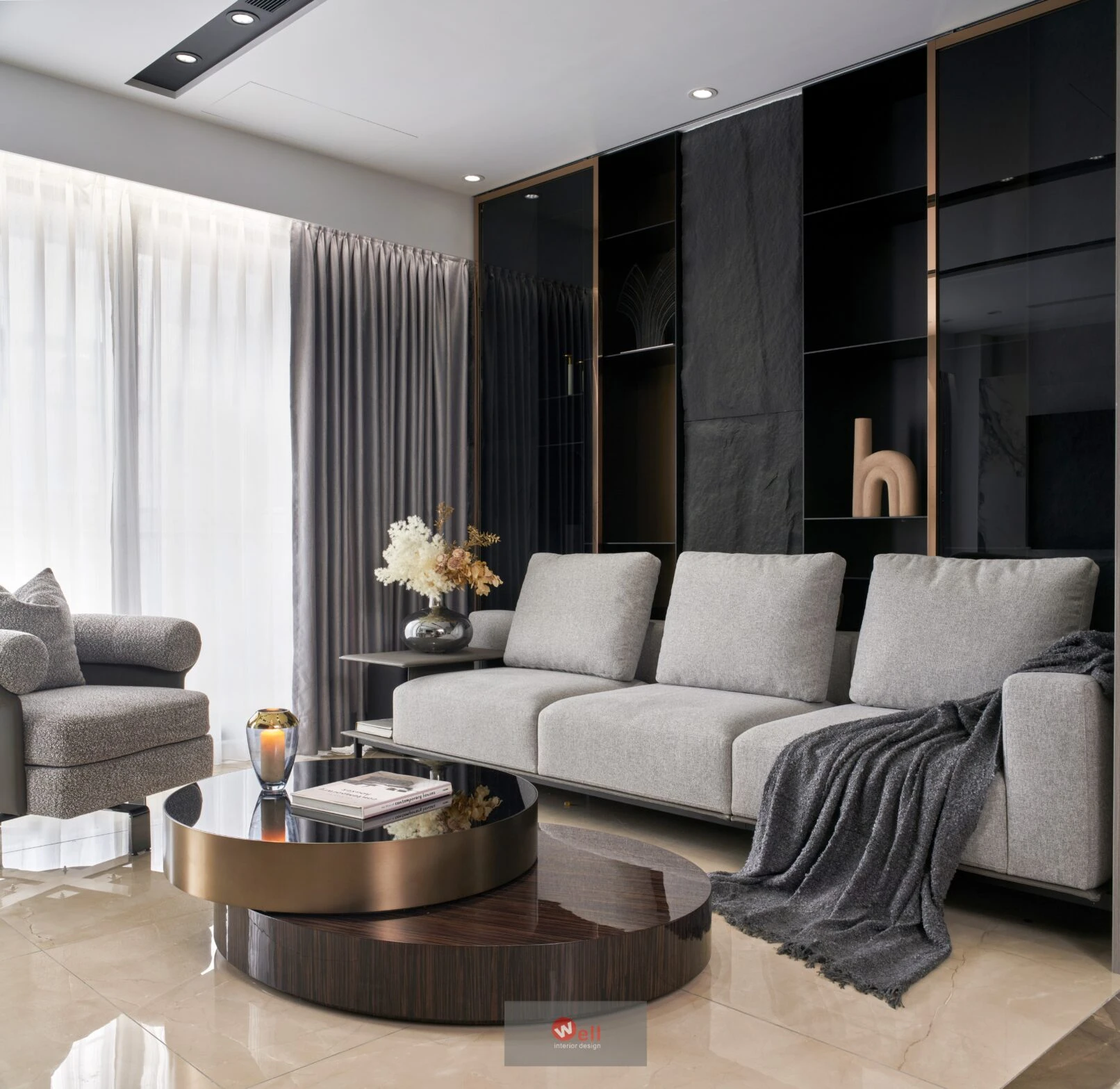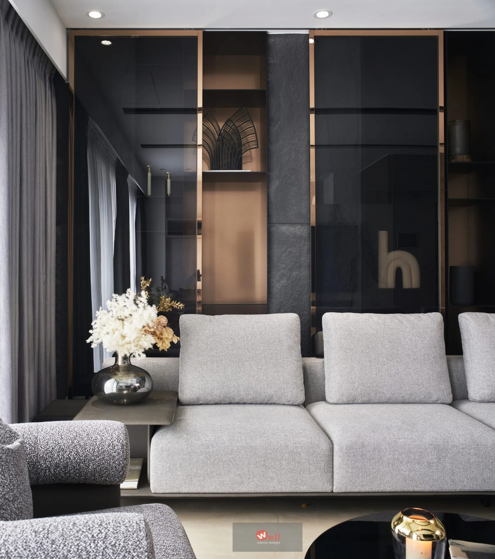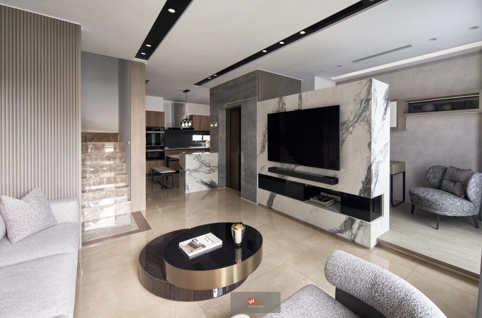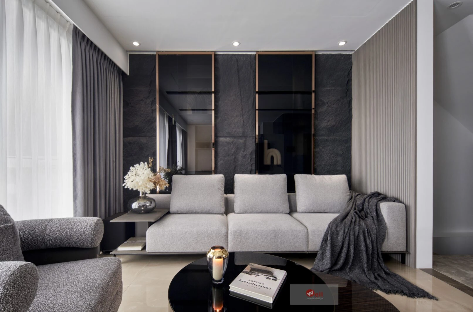 初期依據委託方作息、成員需求,逐層安排獨立機能場域,包括一、二層公區和三層以上私領域;其中又以一樓導入微型精品飯店概念的迎賓Lobby暨休閒廳別具巧思,其次是透過精湛異材質搭配、沈穩演色和精準比例,不僅賦予居宅舒緩、療癒的親自然氛圍,更擷取俐落線性語彙,以分割、組接、排列、燈帶、空調迴風等型態植入空間三維,而宅中多處兼顧審美、養護省力且實用的造型連續面,例如二樓客廳自電視牆經電梯口至高餐檯、餐桌的聚落式佈局,除了劃分客廳與書房的電視牆兩面可用,由電梯口右側定位的餐檯、長桌陣列,加上另一側整合浴室入口的灰鏡木質牆反射光影,都讓餐廚共享的空間感明顯放大,相對關係也更為自在親暱,甚至順勢消弭中段梯間衍生的收束壓迫,極限優化空間尺度與效益。