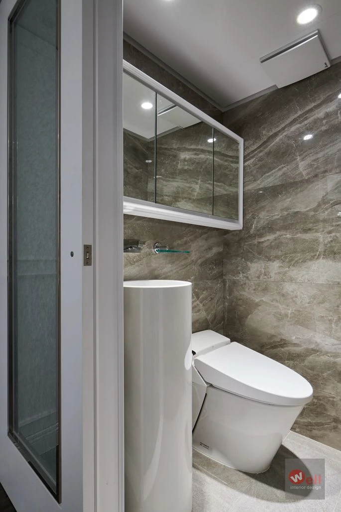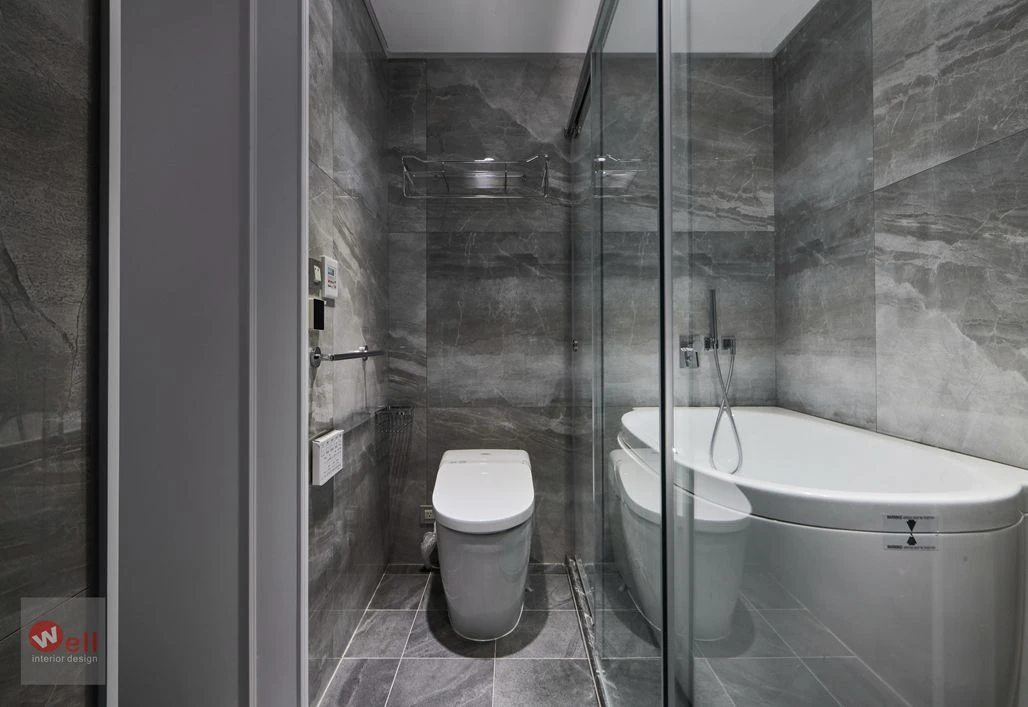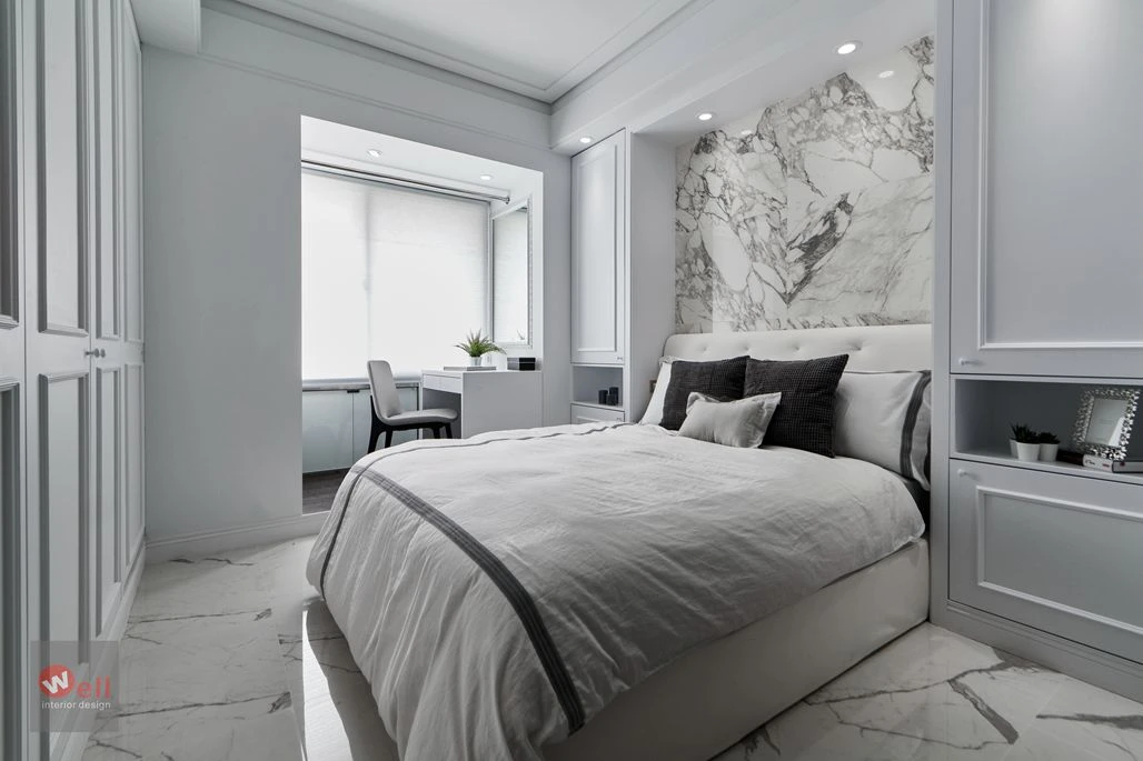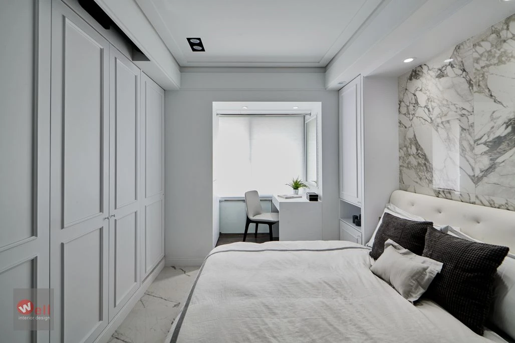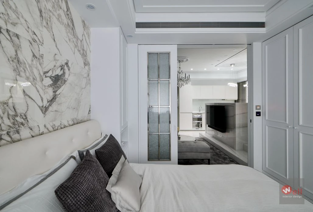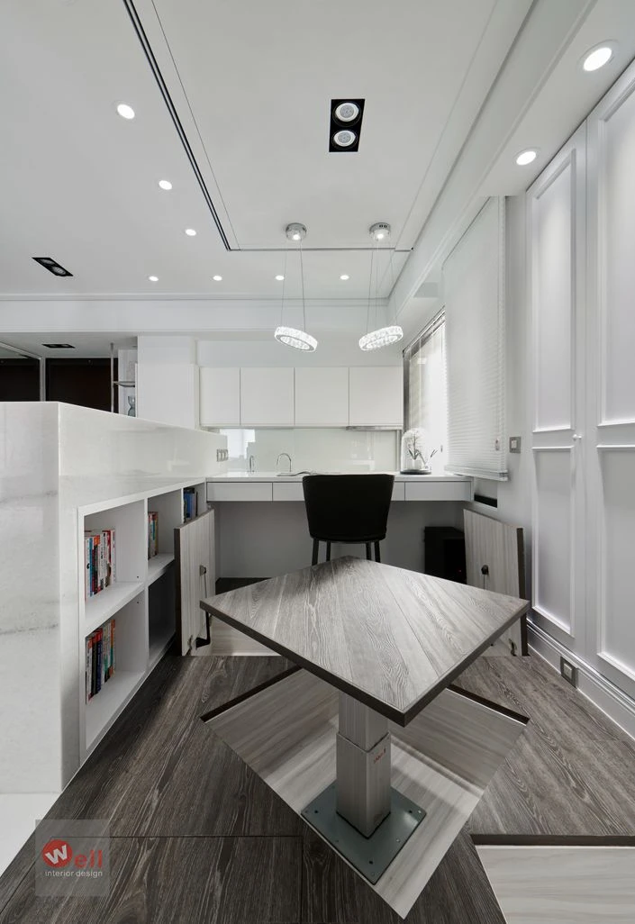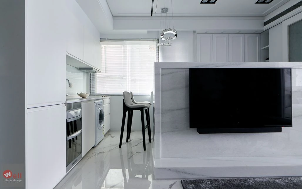 客廳電視半牆等同隔間介質,外觀採光潤石材特製,牆後即為多功能區,兼顧書房、餐廳、客房、和室等多元設定,搭配天花板內建隱式捲簾,可隨機變換空間型態,搭配增設客廁甚至能升格獨立套房使用,特別是餐檯兩側可配合不同坐具高度而衍生的趣味性,深得使用者喜愛。此外,全室加裝地熱系統,沙發背牆與臥室床頭均採用石紋磚施作,僅僅橫縱向不同拼接,即賦予同素材不同表情。主臥床尾設置大型衣櫃列,並將浴室門整合其間,衣櫃前方天花板內另精算高度,以安裝55吋升降電視,在不佔空間、乾淨簡斂構圖中,實則滿滿設想周延的魔鬼細節。