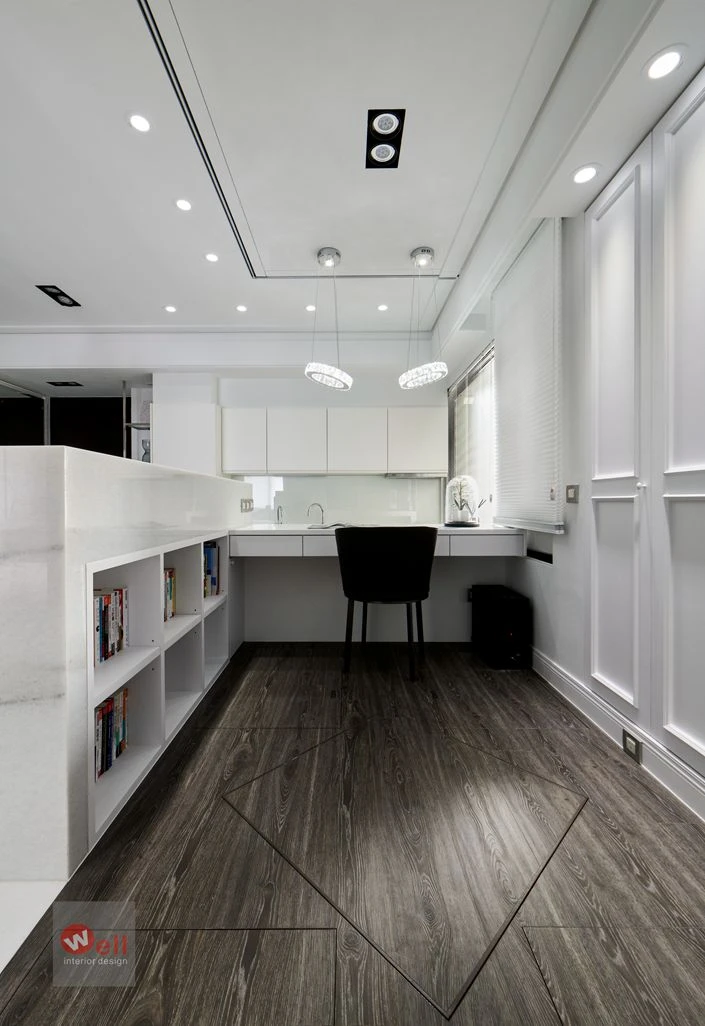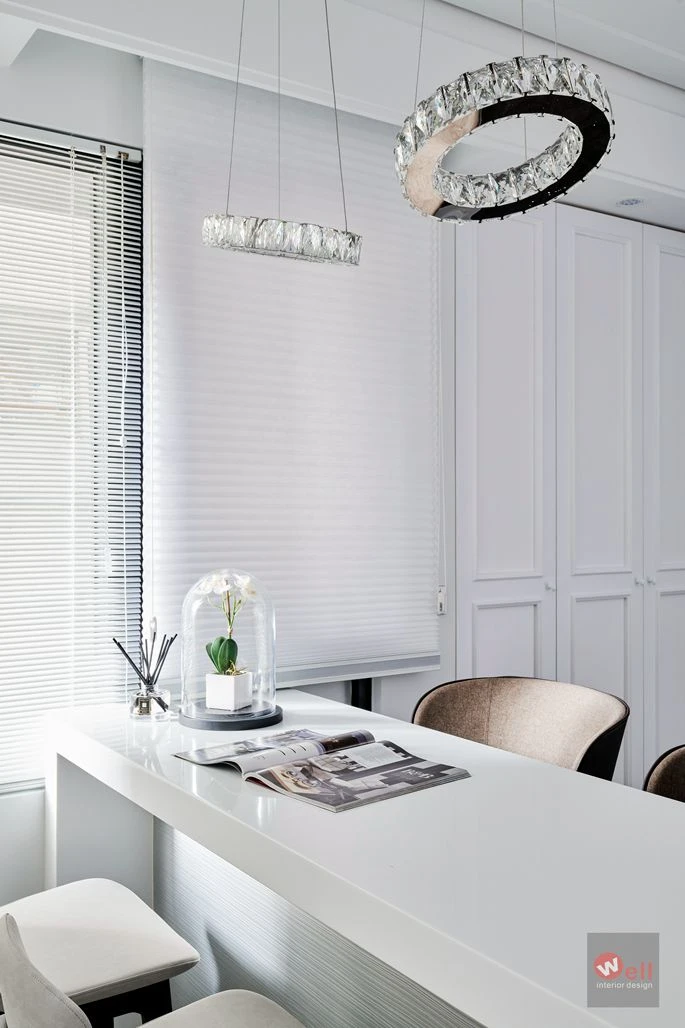 全宅以零閒置、前後進形式,俐落劃分公、私領域,公區包括玄關、客廳、餐廚以及擁有架高地板兼收納的多功能區,私領域採用瑰麗拉門取代實牆,並涵蓋主臥、臨窗梳妝區和四件式主浴,強調高機動與光影通透感,而客廳與餐檯上方均懸綴水晶燈,其純淨、燦亮、精緻特質,直接轉化為靈感來源。