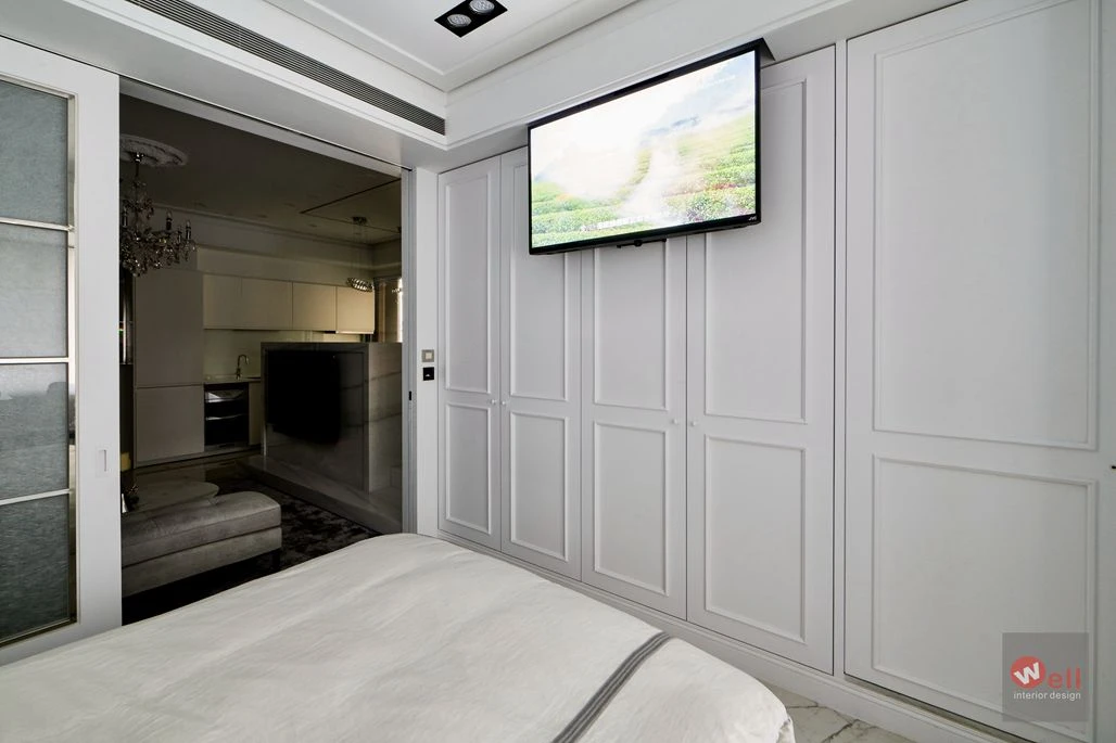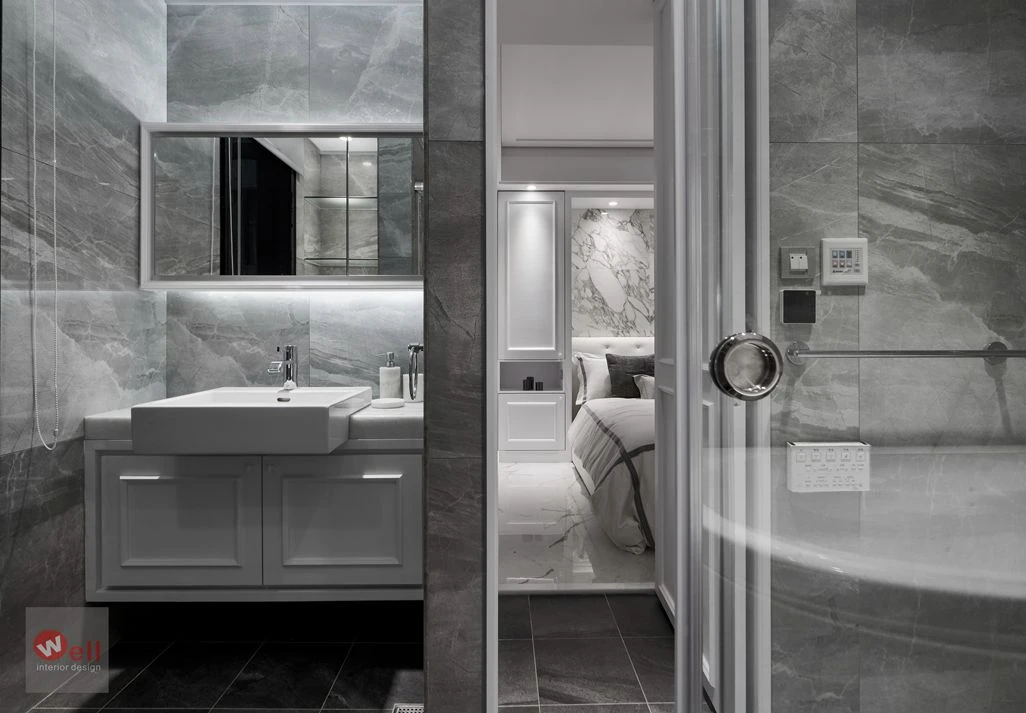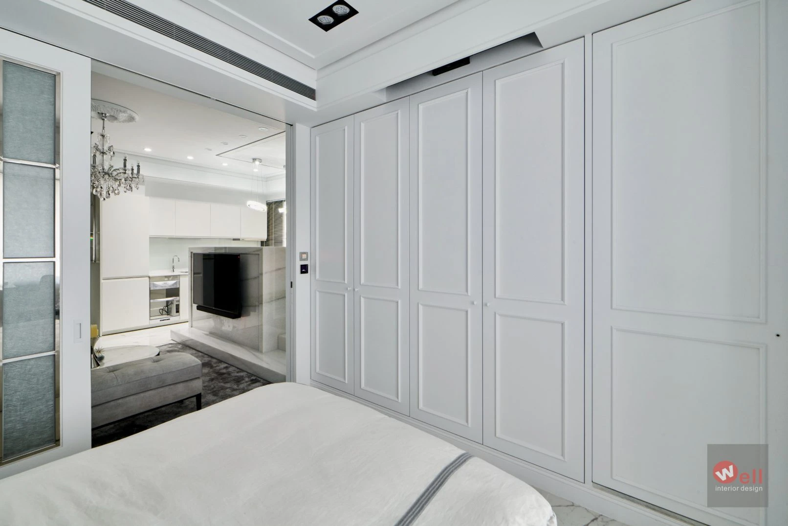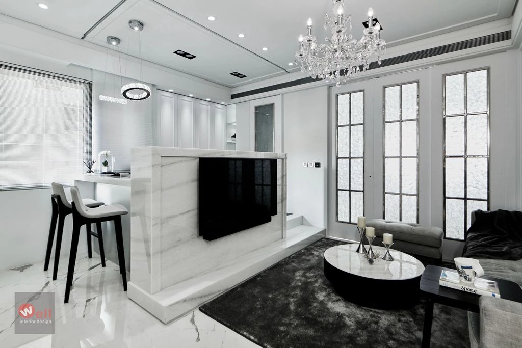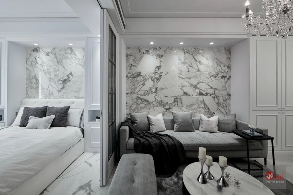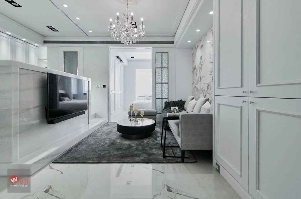 考量居住成員簡單,現階段以夫妻為主;提案即由委託方喜好發想:包括主訴實用性的場域多功能、水晶燈元素、充分療癒身心的精品旅店氛圍等,施作上結合精算比例、多款質地純粹且溫潤的黑、灰、白素材穿插新古典線條運用,藉相似語彙前後呼應,巧妙放大景深、豐富視角層次,精心勾勒本質優雅且富於生活情味的浪漫輕豪宅。