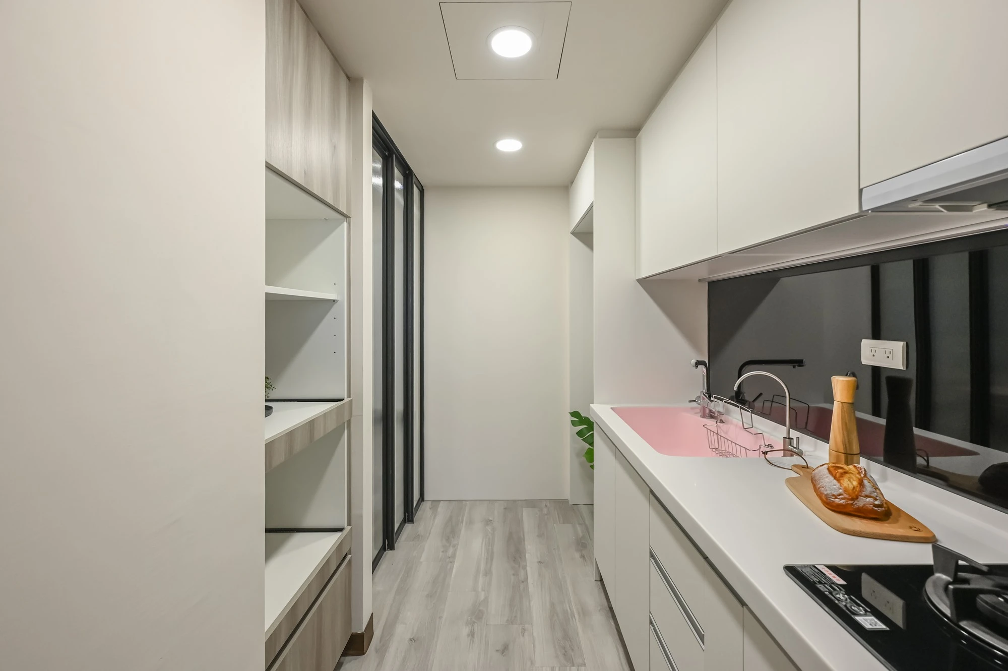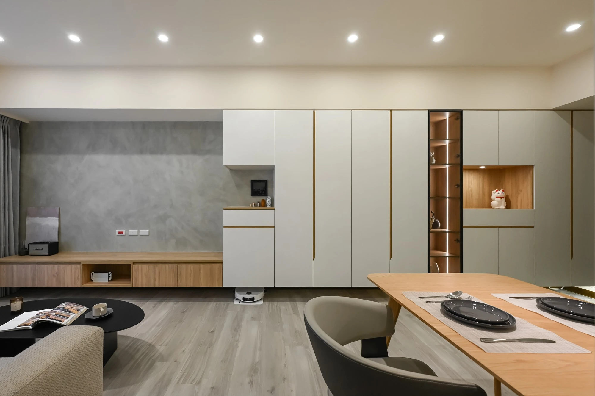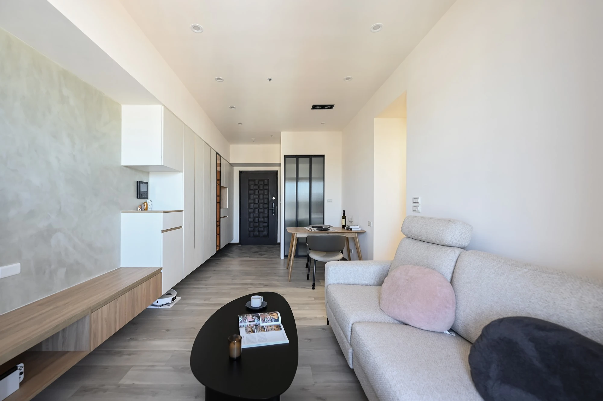 以復古輕美式風展現輕盈與美好的想像生活,玄關處以六角磁磚搭配白色櫃體展示和收納,一進門便可以感受到家的專屬呵護,淺木色地板和奶油色沙發、造型感茶几表現了美的空間哲學與溫潤,廚房規劃黑線條玻璃推拉門營造放大的視覺感,美觀同時兼具實用,臥室採用胡桃木系列和床頭燈喚醒柔和典雅的氛圍,由窗戶瞭望出去體會到家的實現,衛浴特別選擇了不規則花紋大理石,整體完美呈現細膩的設計感與精緻, 勾勒出優雅的美式生活。