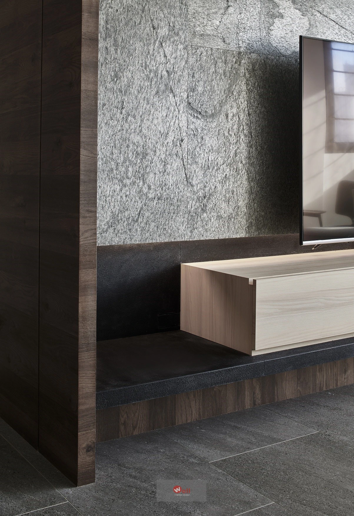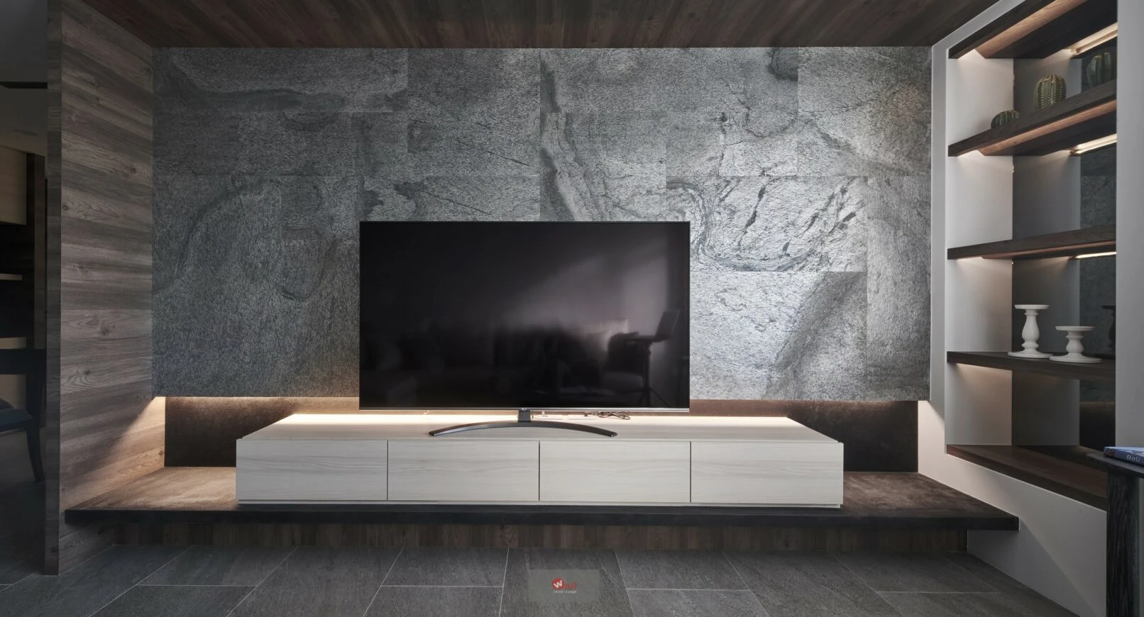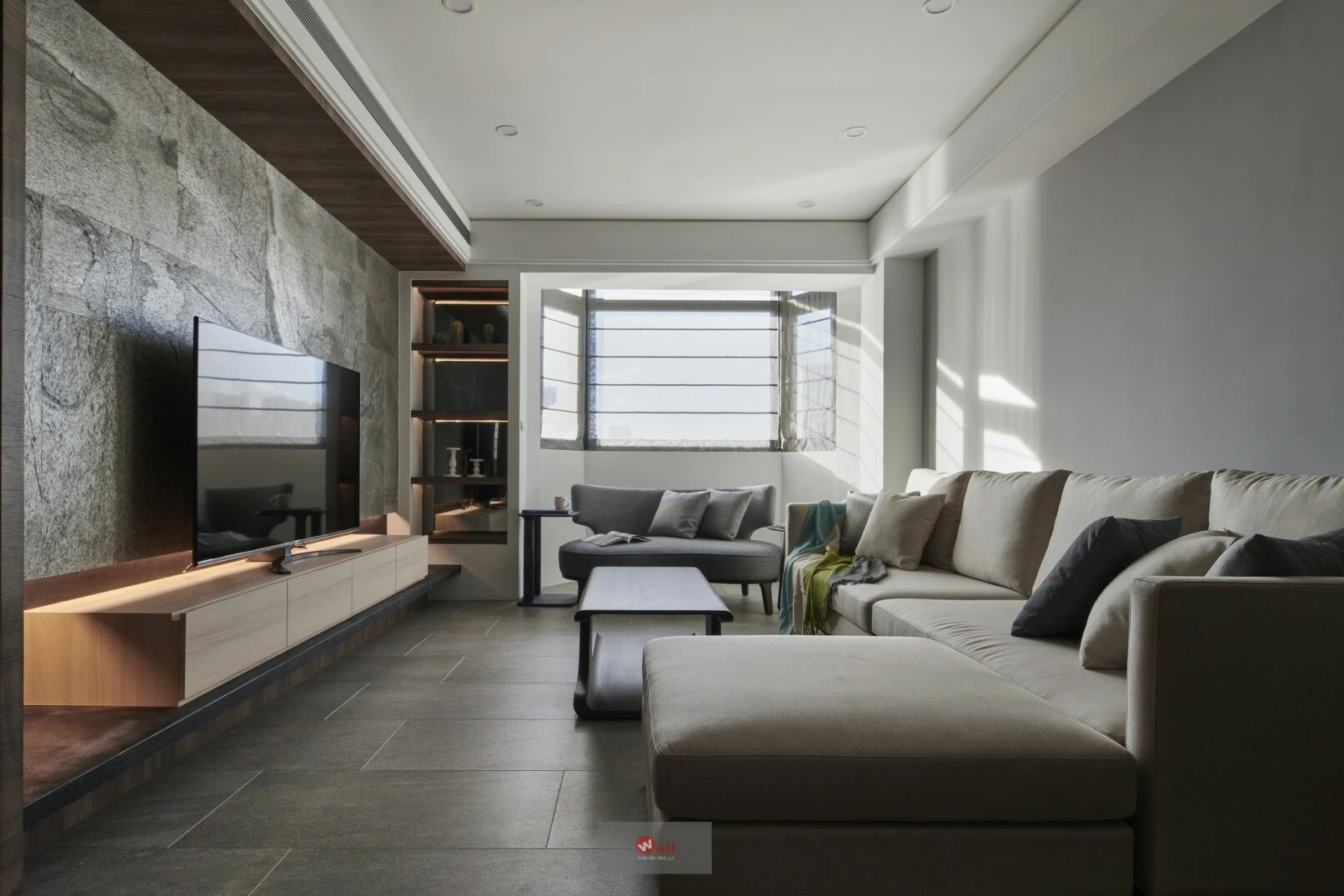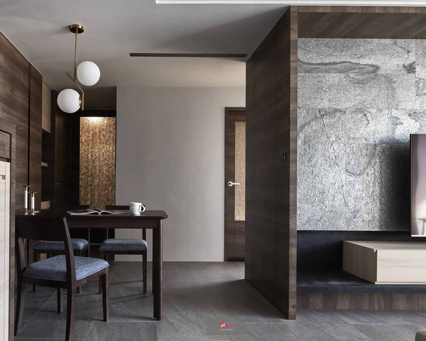 面對這間充滿情感重量的中古屋,我們選擇以「洗鍊現代」為基調,移除老舊隔間,讓光線重新在室內流動。客廳主牆運用了具粗獷紋理的 超薄板岩 ,象徵家族基石的穩固與歲月的積澱;搭配溫潤的木質皮層與俐落的黑系櫃體,建構出大器且沉穩的視覺語彙。