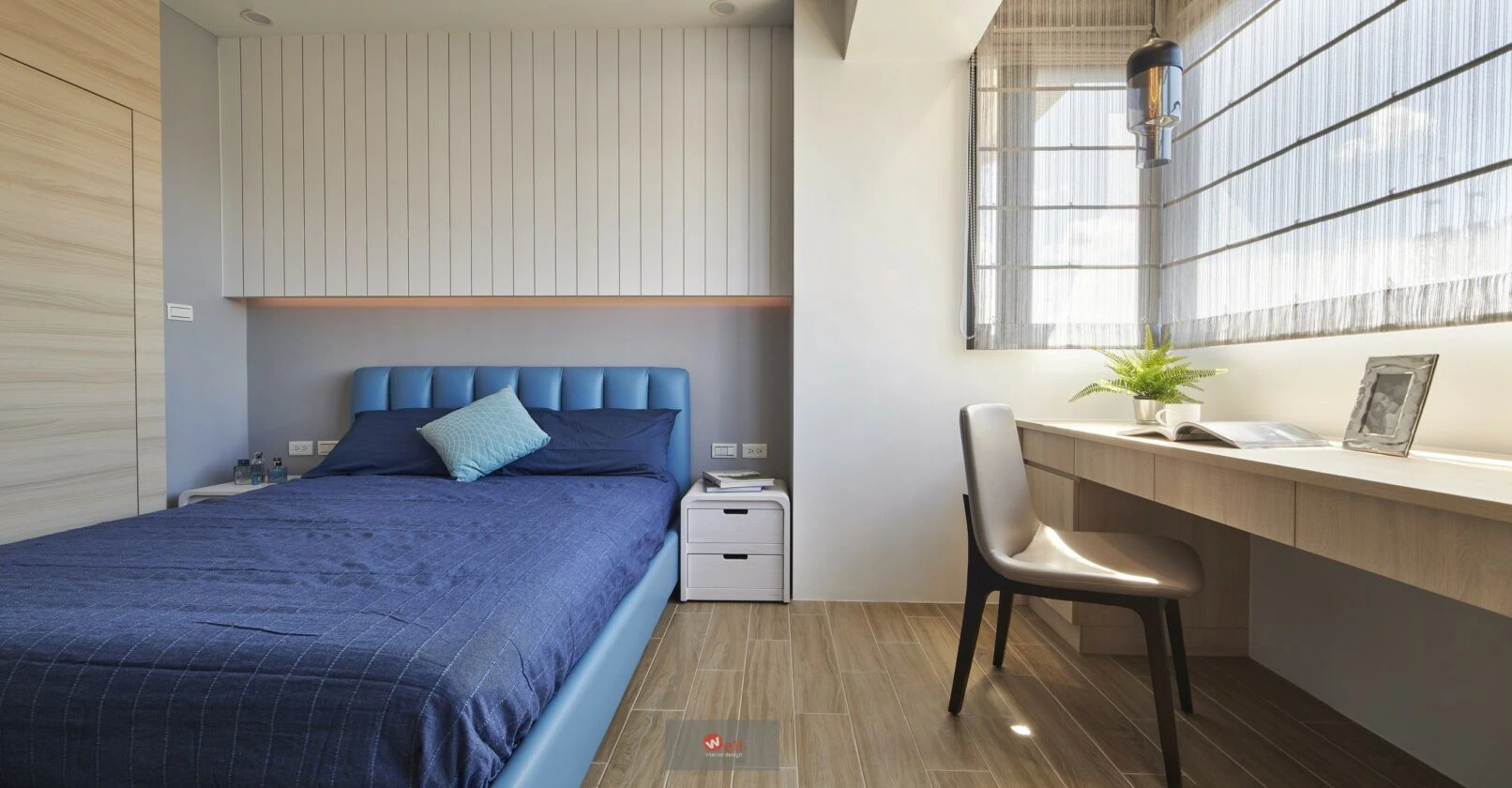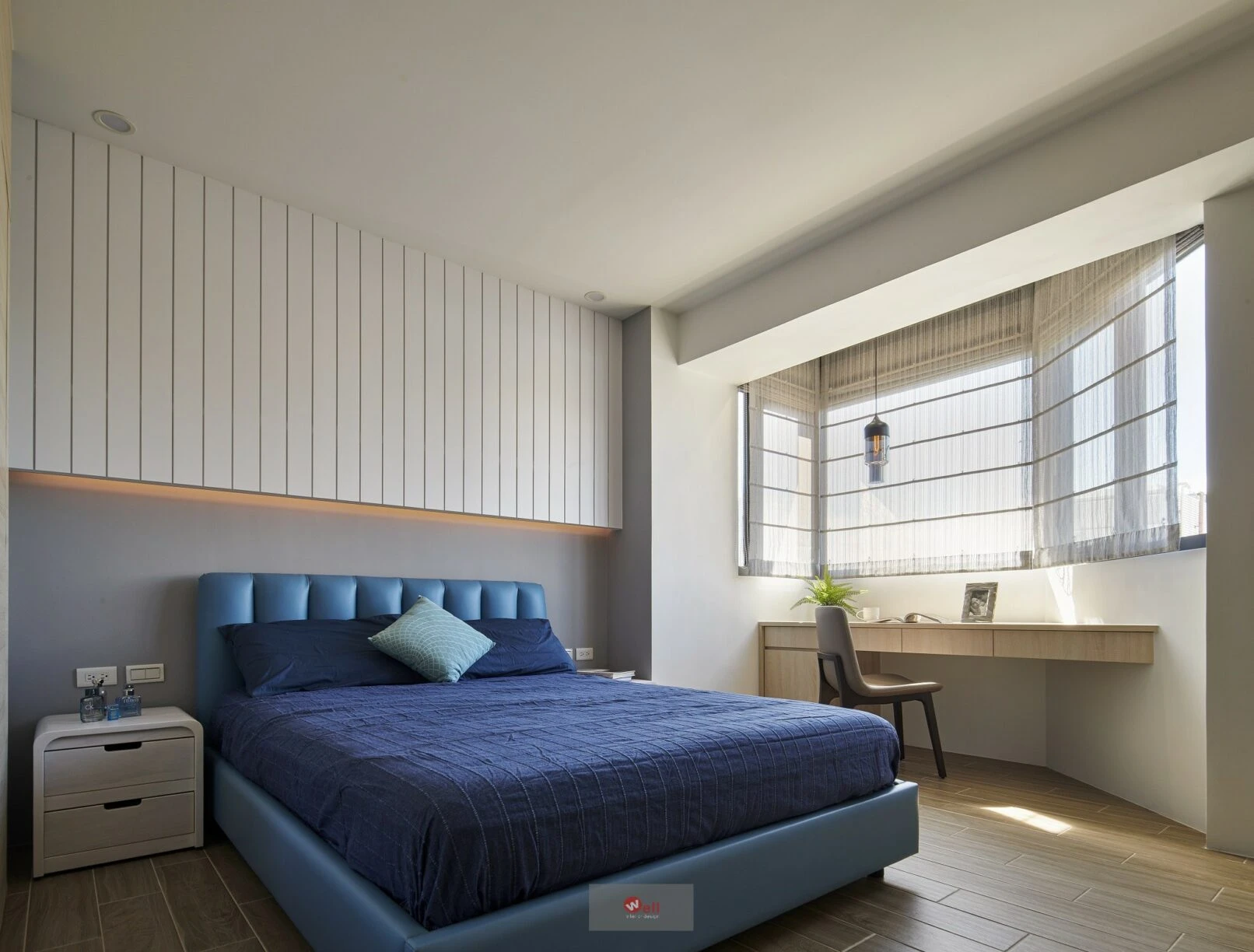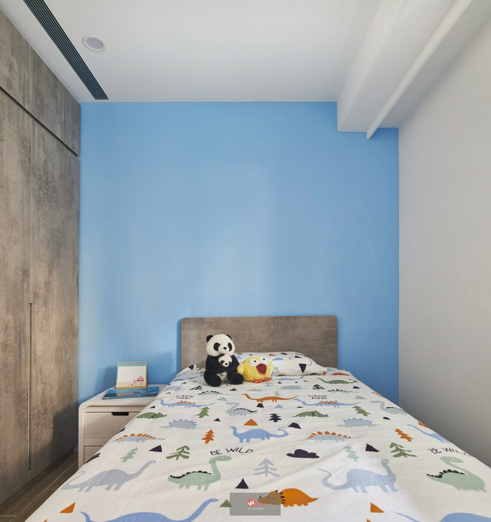 如果說公領域是成熟的對話,那麼小孩房 則是全屋中最溫暖的亮點。考慮到男主人幼時在此成長的點滴,我們特別在小孩房大膽鋪陳了一整面 天空藍 牆面,象徵著無限的希望與翱翔的自由。