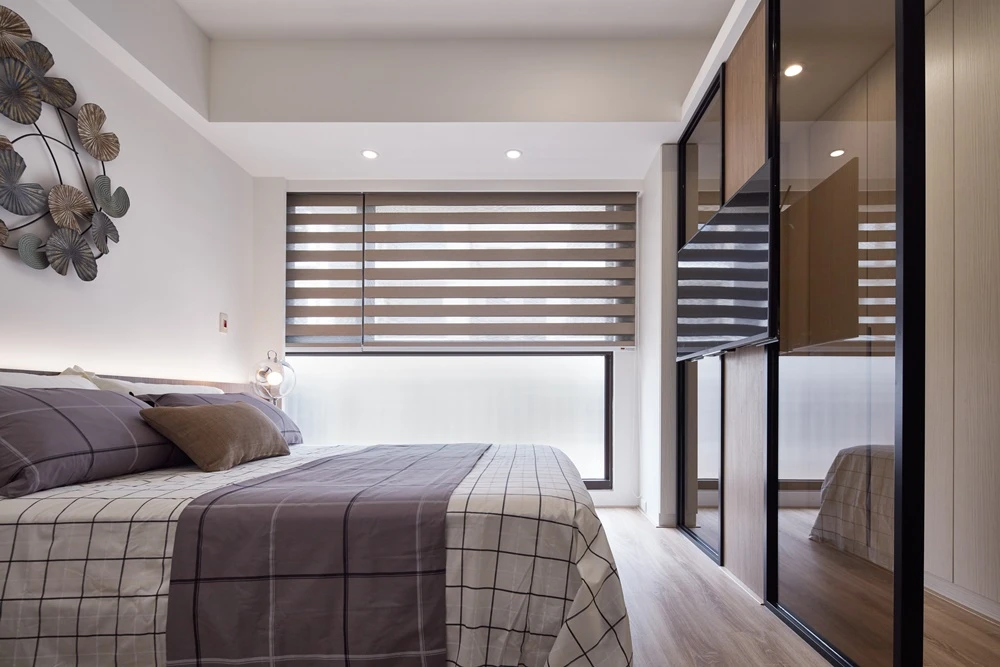 因女主人有大量名牌包包收納需求,二位讀大學的可愛女孩,需要各自獨立的衣櫃與書桌,男主人需要一間可以靜心的獨立書房,偶爾親友來訪還能兼具客房使用。設計師巧妙的活用五金配件,將收納櫃體內裝,詳細為使用者需求作量身規劃。書房使用玻璃隔間讓空間具有穿透感,使得公共場域更為寬敞不顯壓迫。