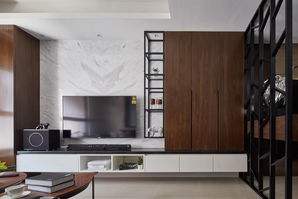 客廳、餐廳、書房半開放穿透的公共場域,用噴黑鐵件結合核桃木,同一語彙串連,使空間橫向與縱向上的視覺延伸,搭配上玻璃隔間讓空間更具穿透寬敞。加上銀狐大理石電視牆面,展現出空間大器與現代俐落的樣貌。