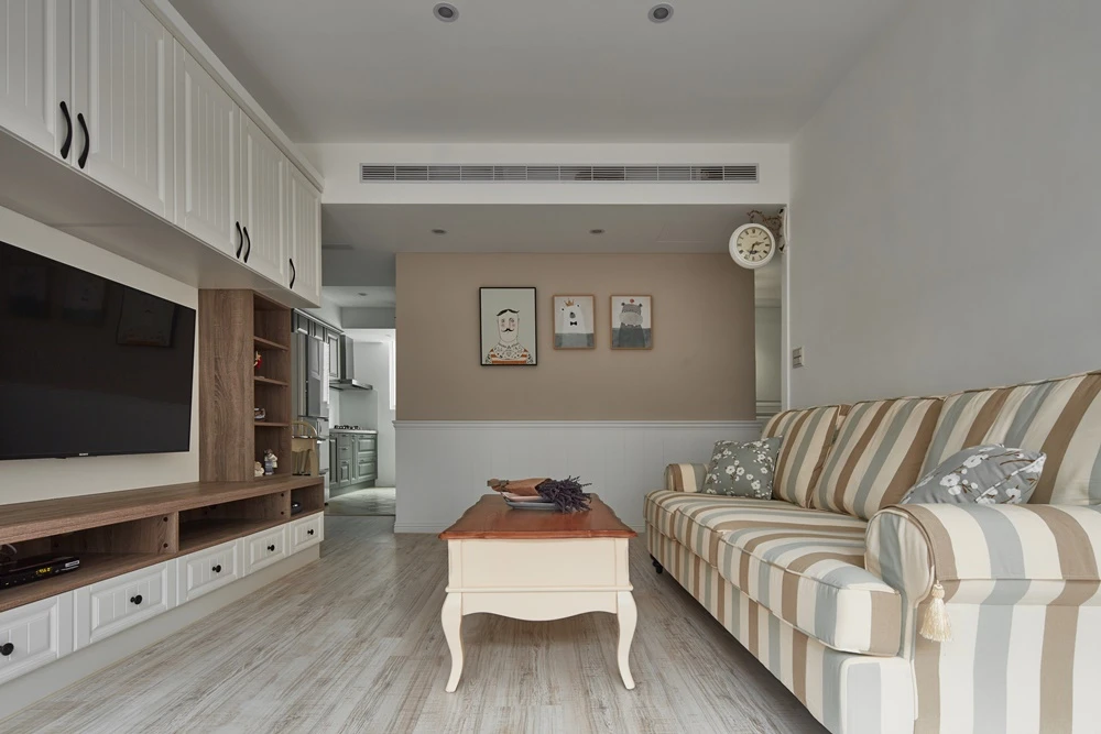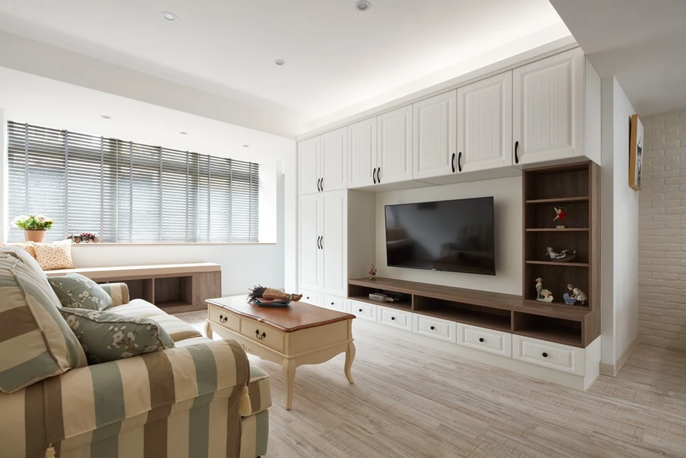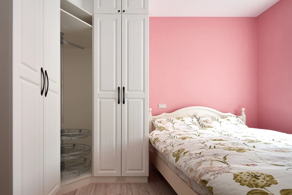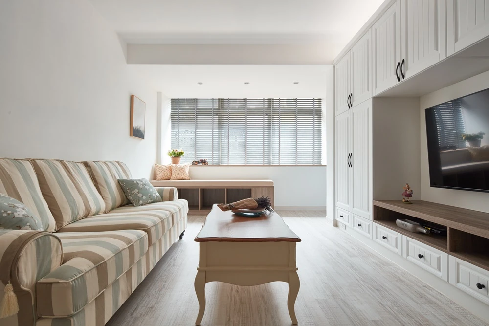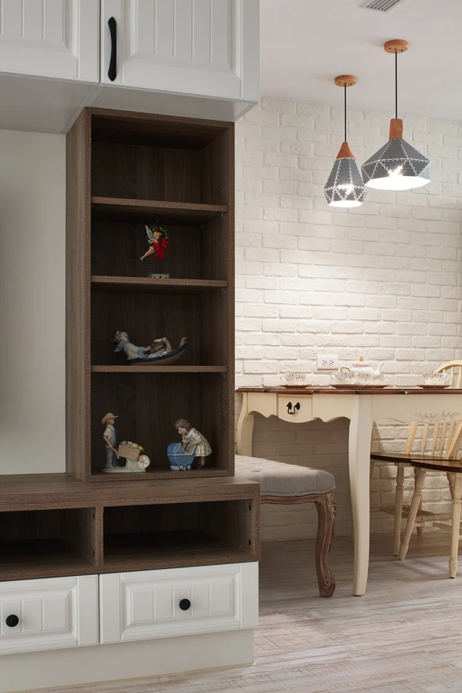 潔淨純白的空間中,佐以跳色家具、櫃體等營造淡淡的鄉村氛圍,然而一開始的設計走向卻是更簡單純淨的北歐風格,因為屋主認為北歐風格才能有效控制預算。不過,考量到挑選家具時,屋主的喜好明確指向鄉村風,優尼客空間設計與屋主協調後,便決定改以輕鄉村作為空間基調,僅利用線板等鄉村元素作為妝飾,不但成功解決預算問題,更使20坪的中古屋顯得年輕有活力。