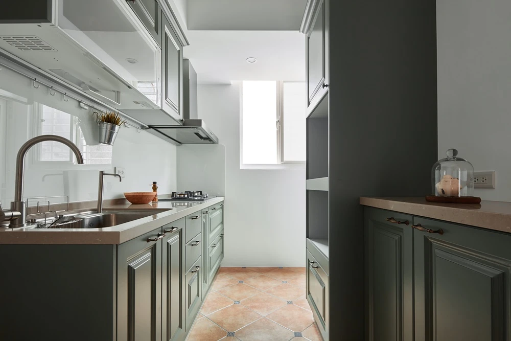 由於屋內各處的採光良好,優尼客設計便以此為基,為空間染上各式大膽顏色,像是廚房的墨綠色線板櫃,搭配黑銅色進口把手,以及主臥房的柔和粉色牆面,皆使房屋各處換上獨特的個性表情。此外,為了滿足屋主的收納需求,電視牆四周也設置多個櫃體,使純白色的牆面更有層次,並在窗邊設有臥榻,增加收納空間之餘,也能作為聚會時的休憩一隅。