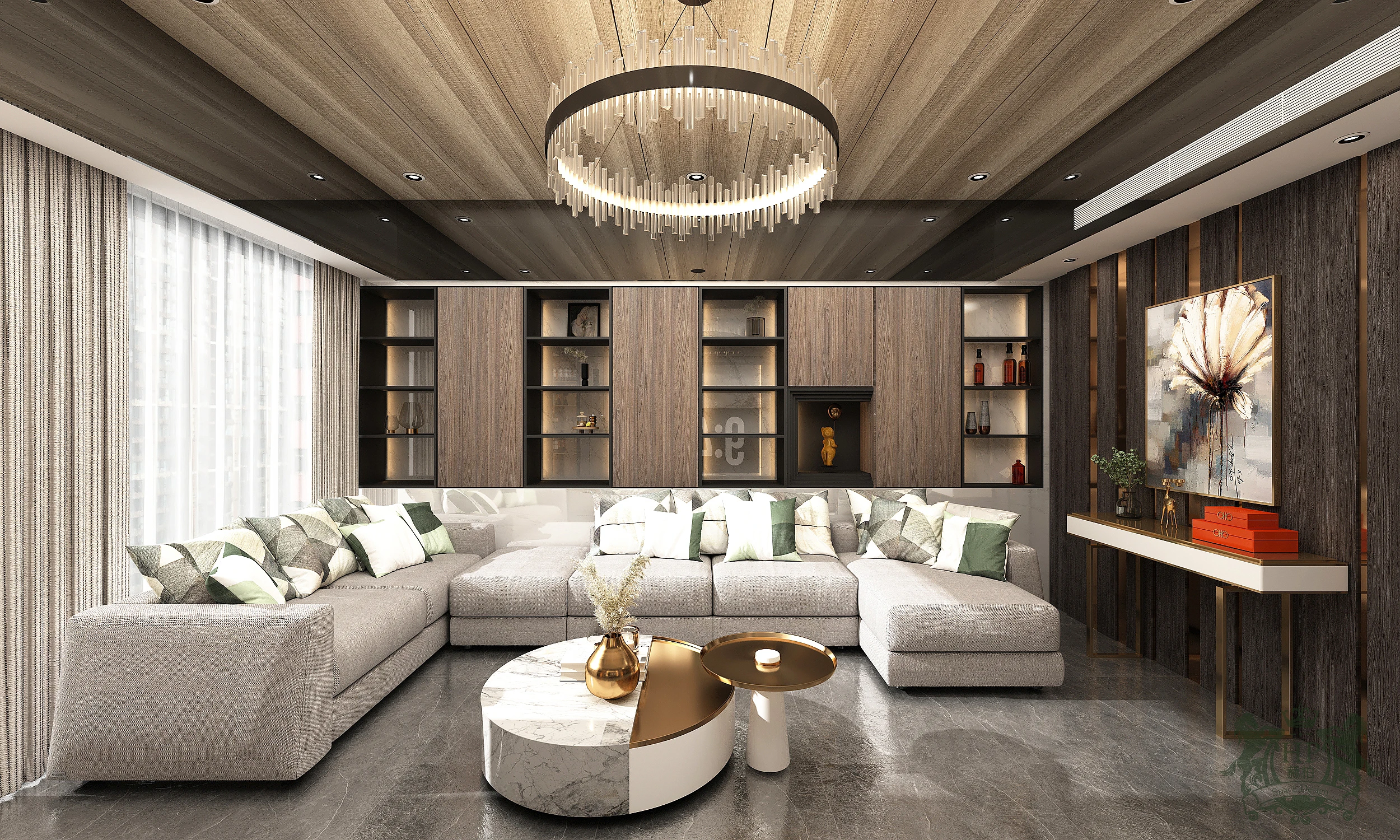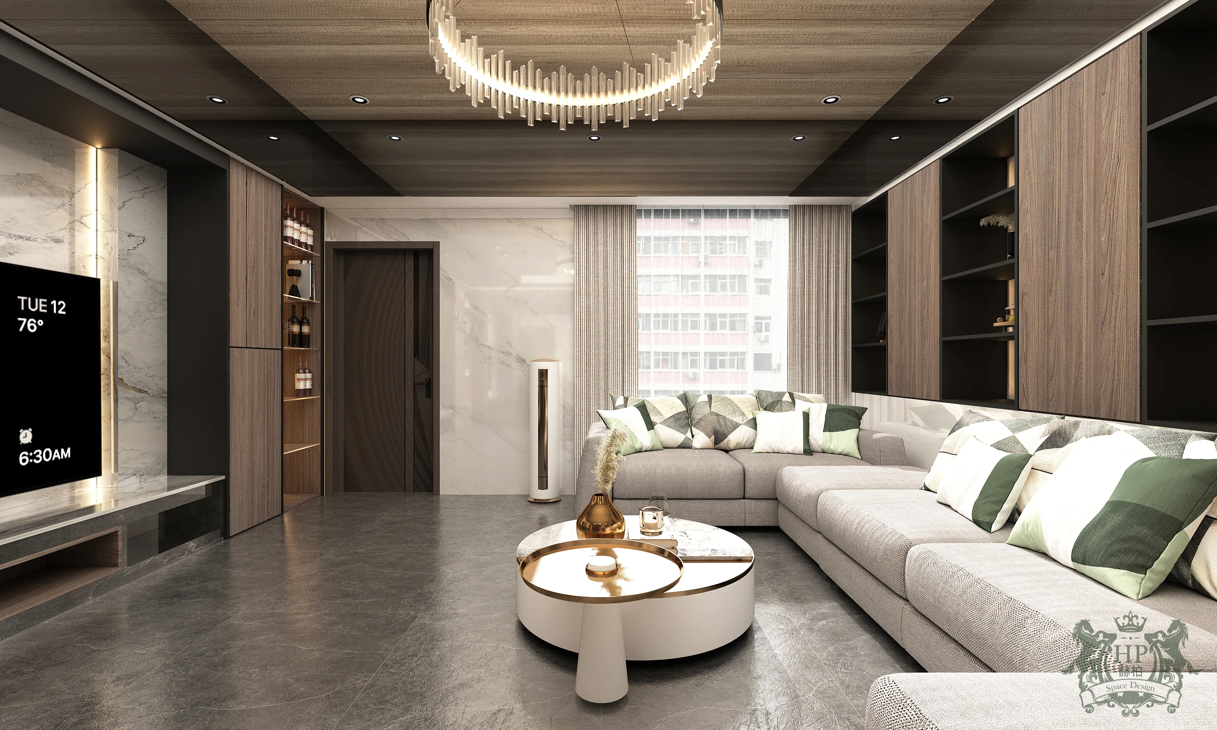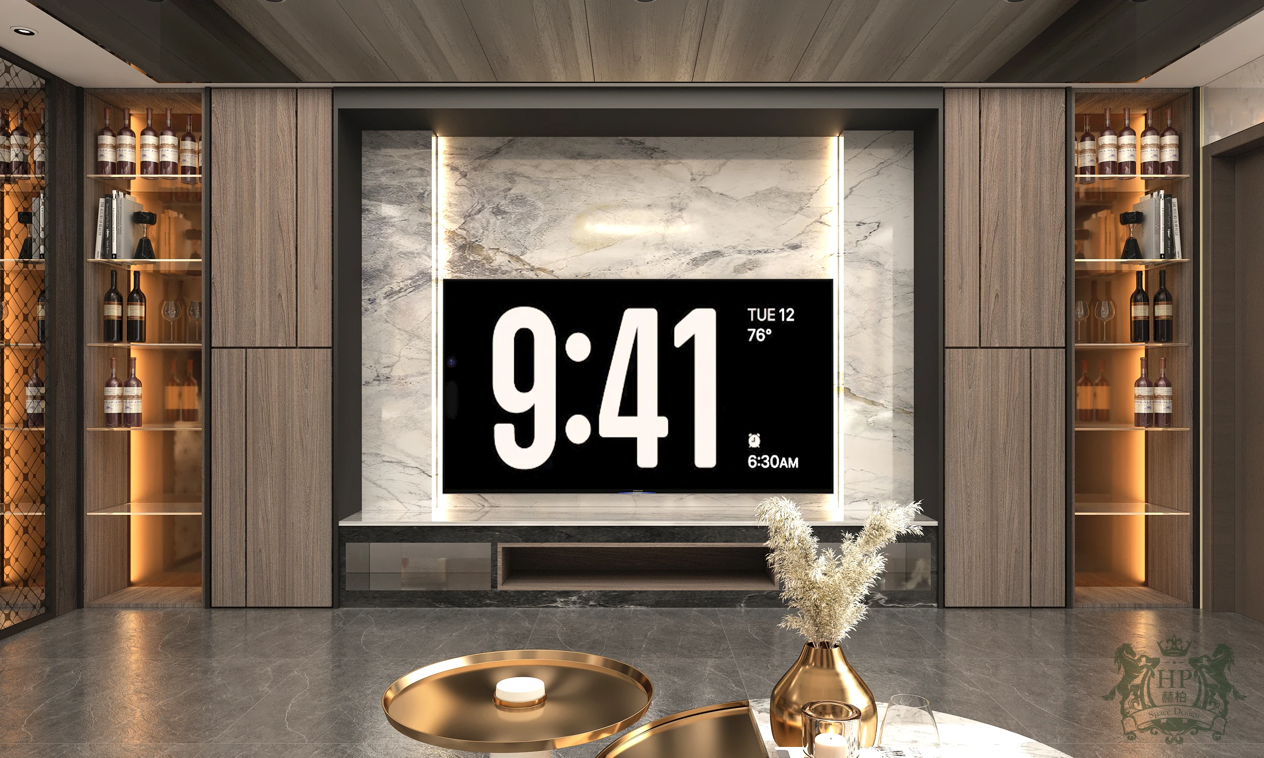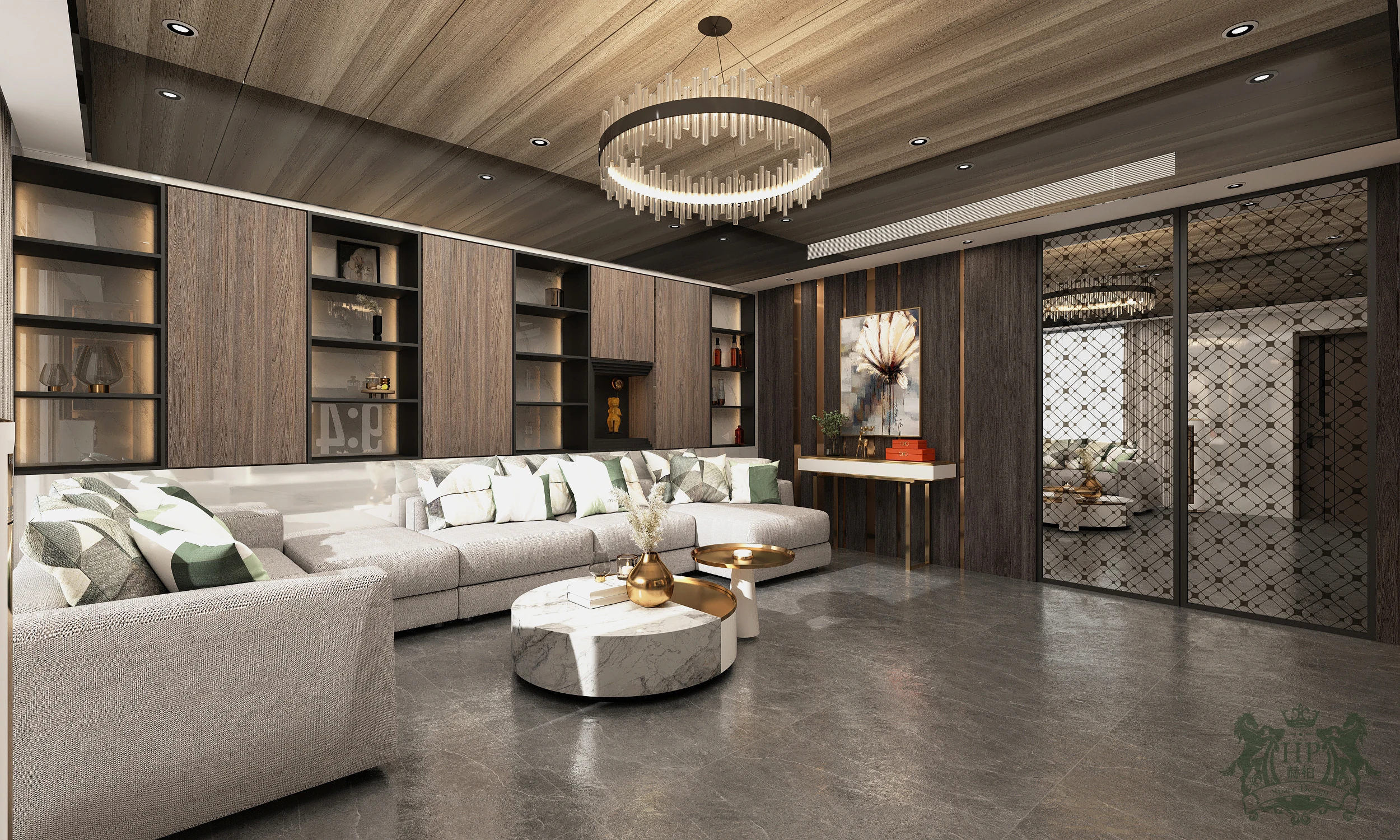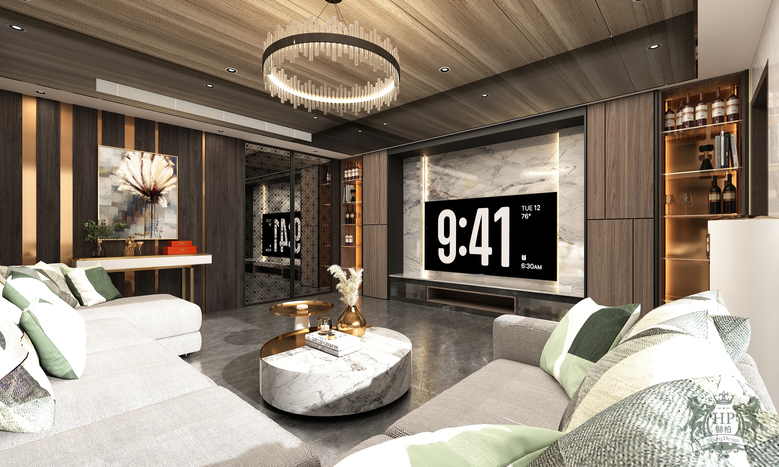 空間的主色調由深邃的煙燻木紋與大氣的潑墨大理石共譜而成。電視主牆選用具流動感的石材紋理,搭配兩側垂直律動的木質格柵,冷與暖、硬與柔在此產生深度對話,營造出沉穩且不失張力的視覺層次。