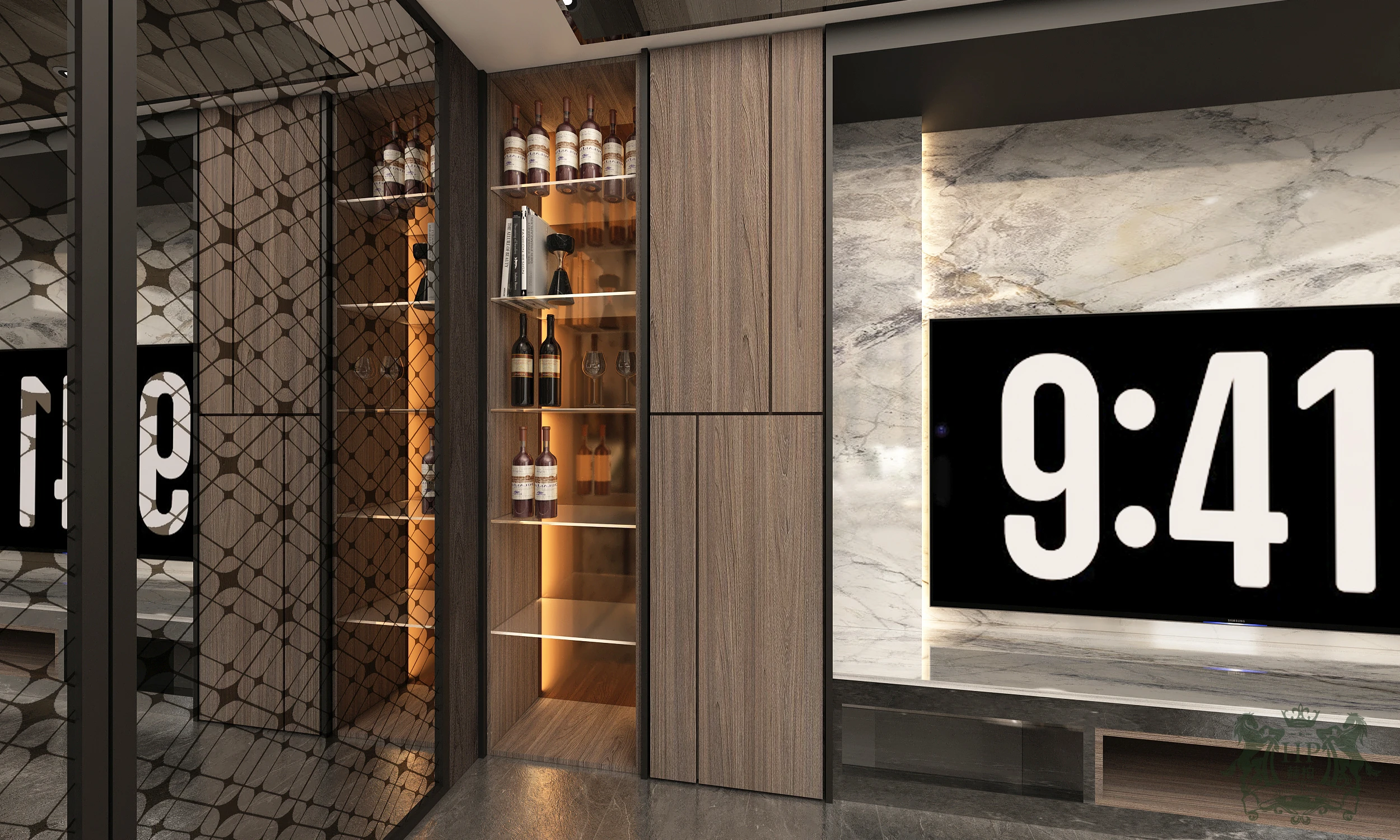 光影藝廊: 客廳側牆配置大面積展示櫃位,透過層板間隱藏的暖色線燈,讓藏酒與珍玩在光影交錯下轉化為牆上的流動藝術。
