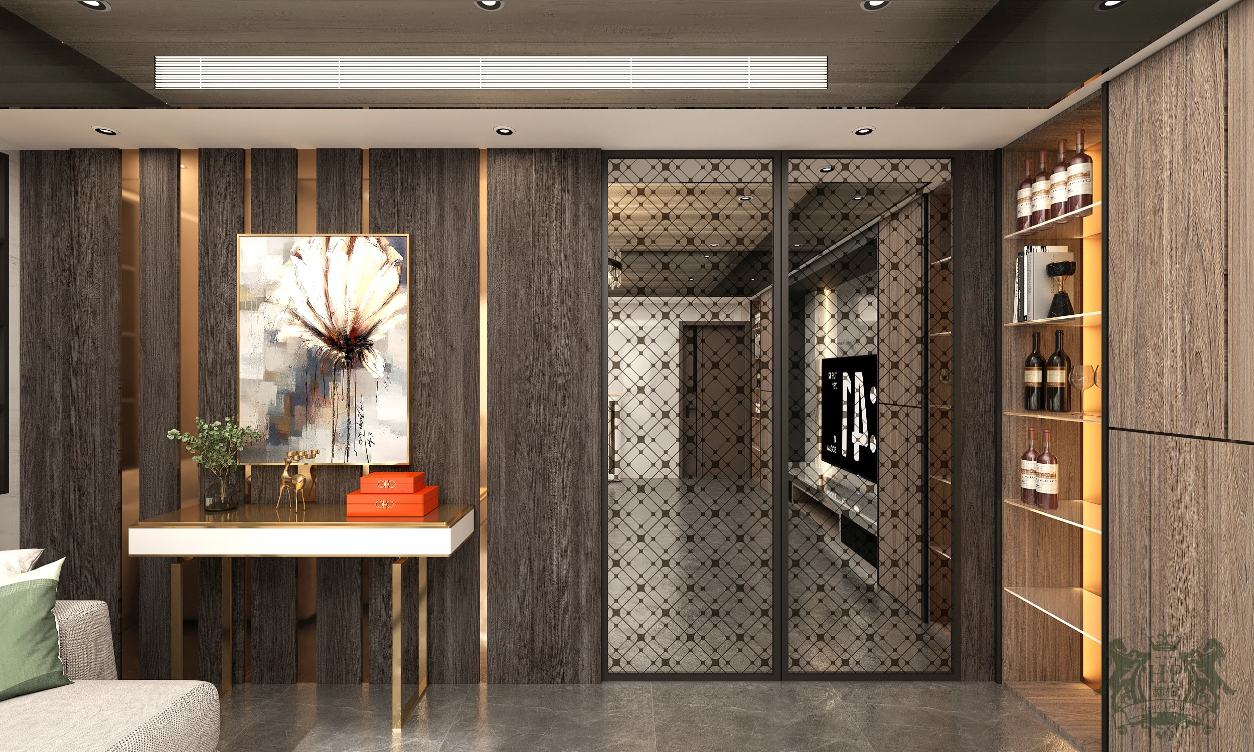 懸浮美學: 沙發背後的端景牆以金色線性點綴,搭配簡約的玄關邊几與藝術畫作,透過懸浮感設計減輕視覺重量,展現輕盈而高級的優雅度。
