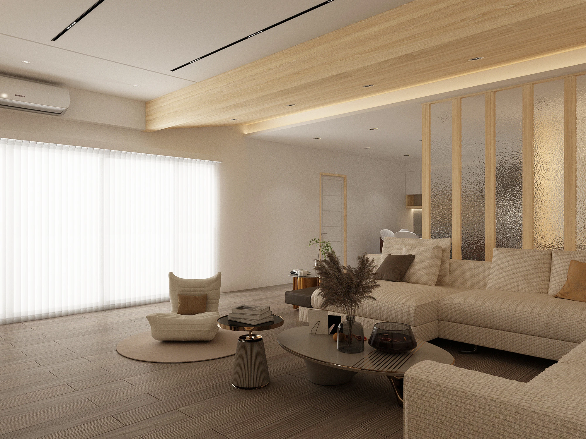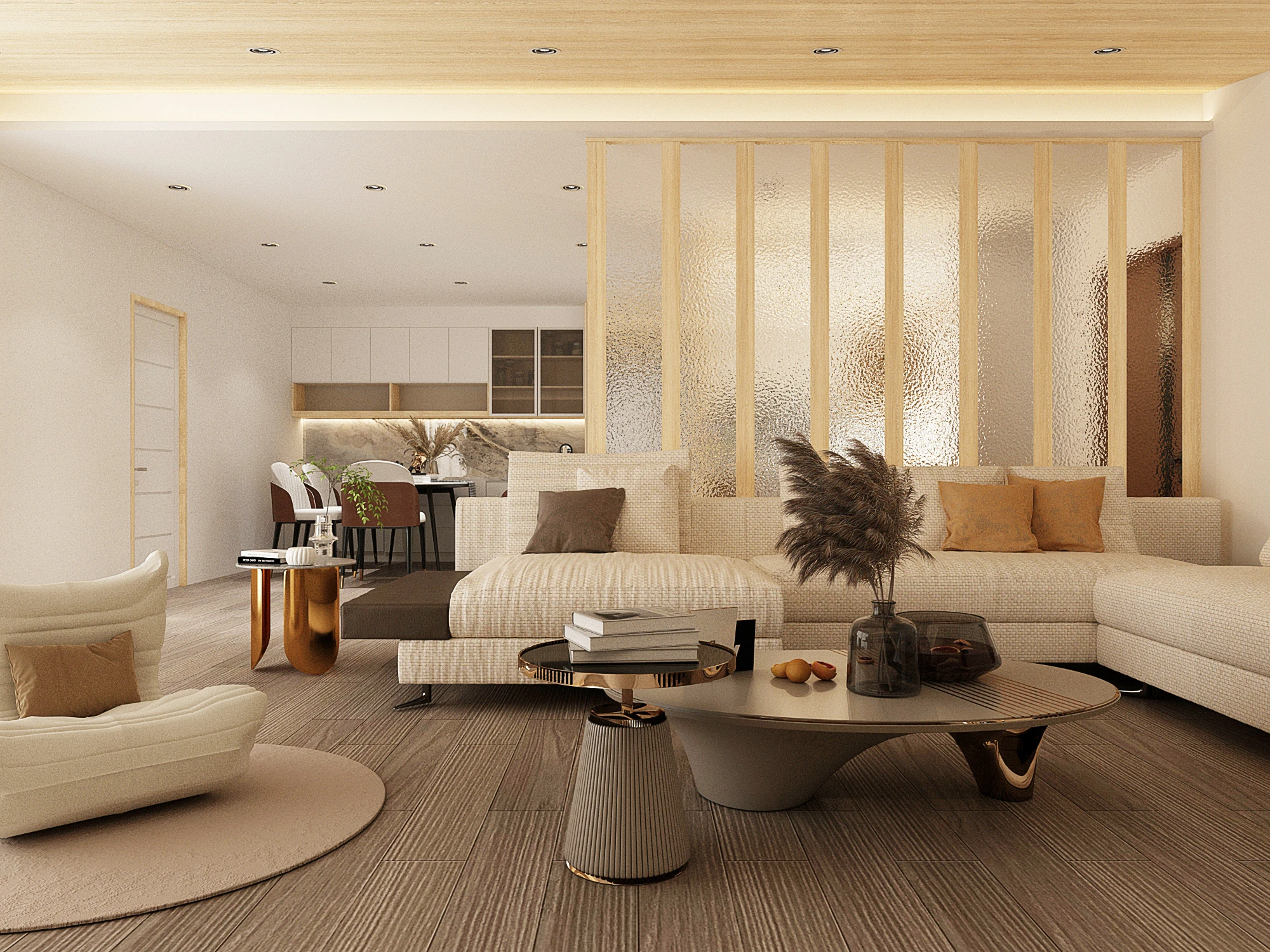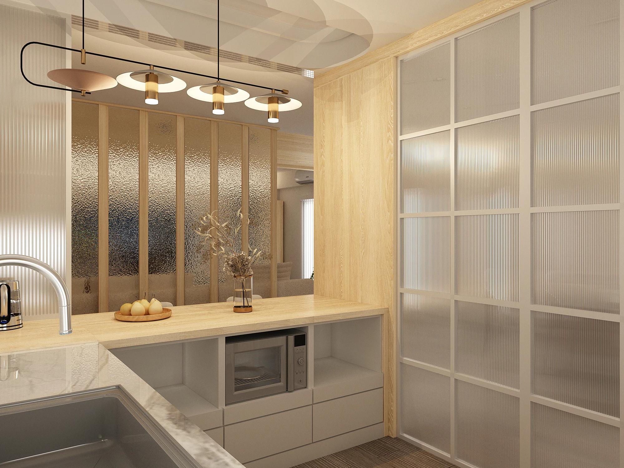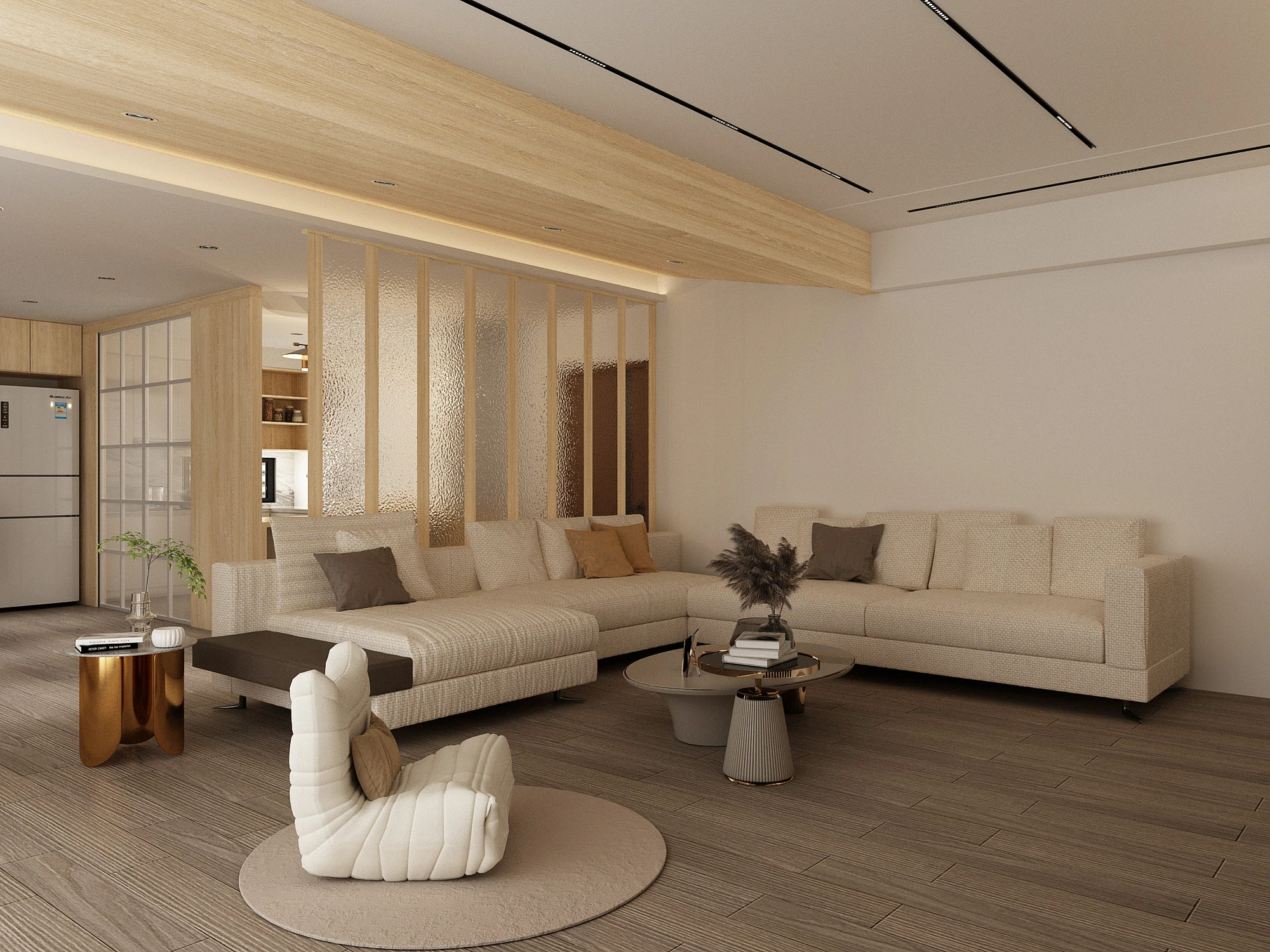 空間屏障的虛實轉化: 特別設計了「木格柵結合壓花玻璃」屏風與「長虹玻璃推拉門」,巧妙解決了場域劃分的問題。既保留了光線的穿透性,使公領域視覺感更加開闊,又能在機能區(如廚房、玄關)之間維持一種若隱若現的私密美感。