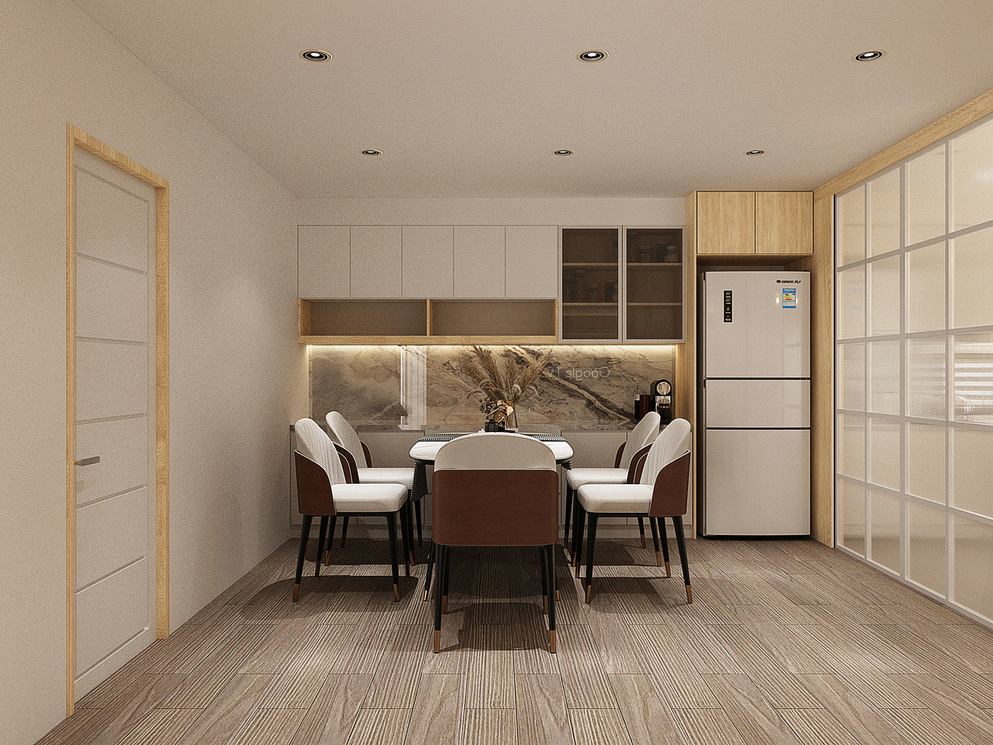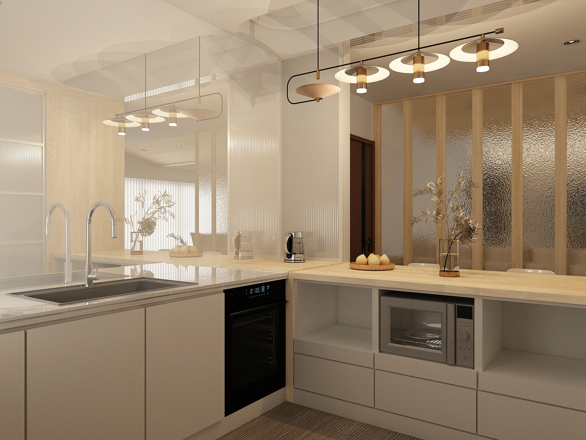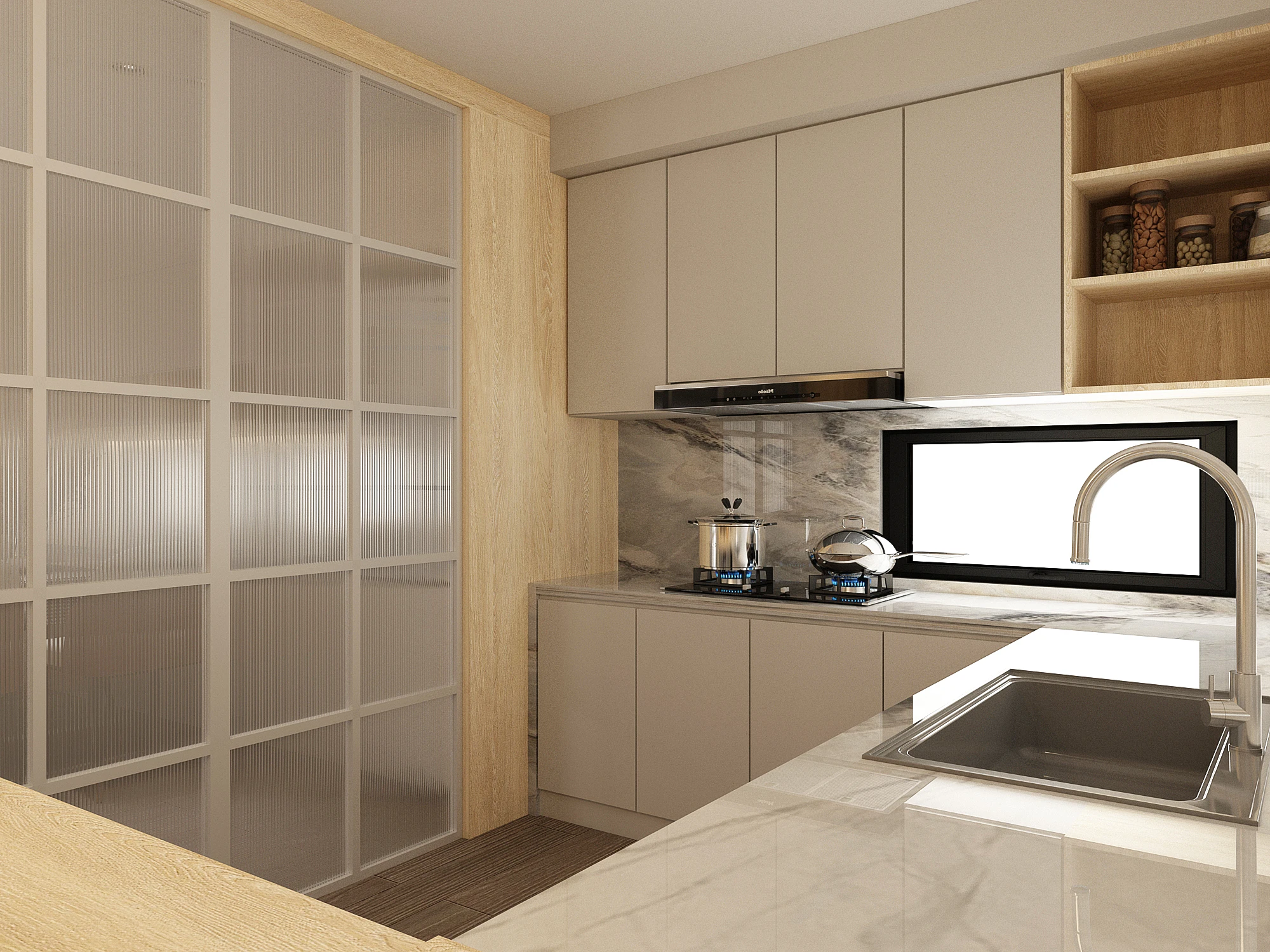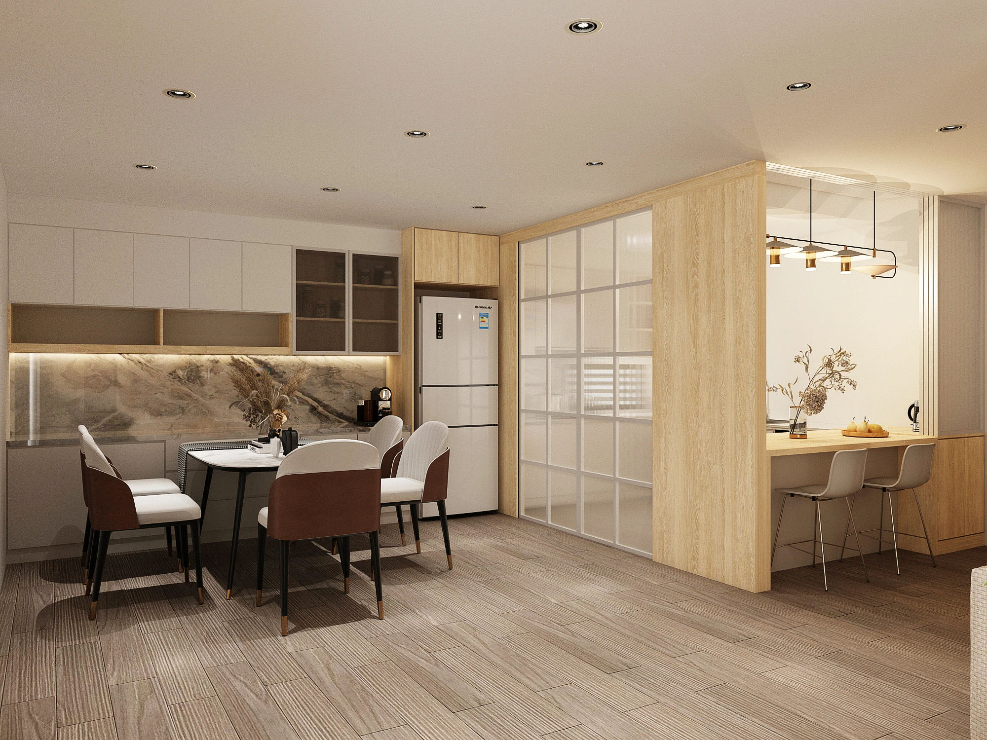 空間屏障的虛實轉化: 特別設計了「木格柵結合壓花玻璃」屏風與「長虹玻璃推拉門」,巧妙解決了場域劃分的問題。既保留了光線的穿透性,使公領域視覺感更加開闊,又能在機能區(如廚房、玄關)之間維持一種若隱若現的私密美感。