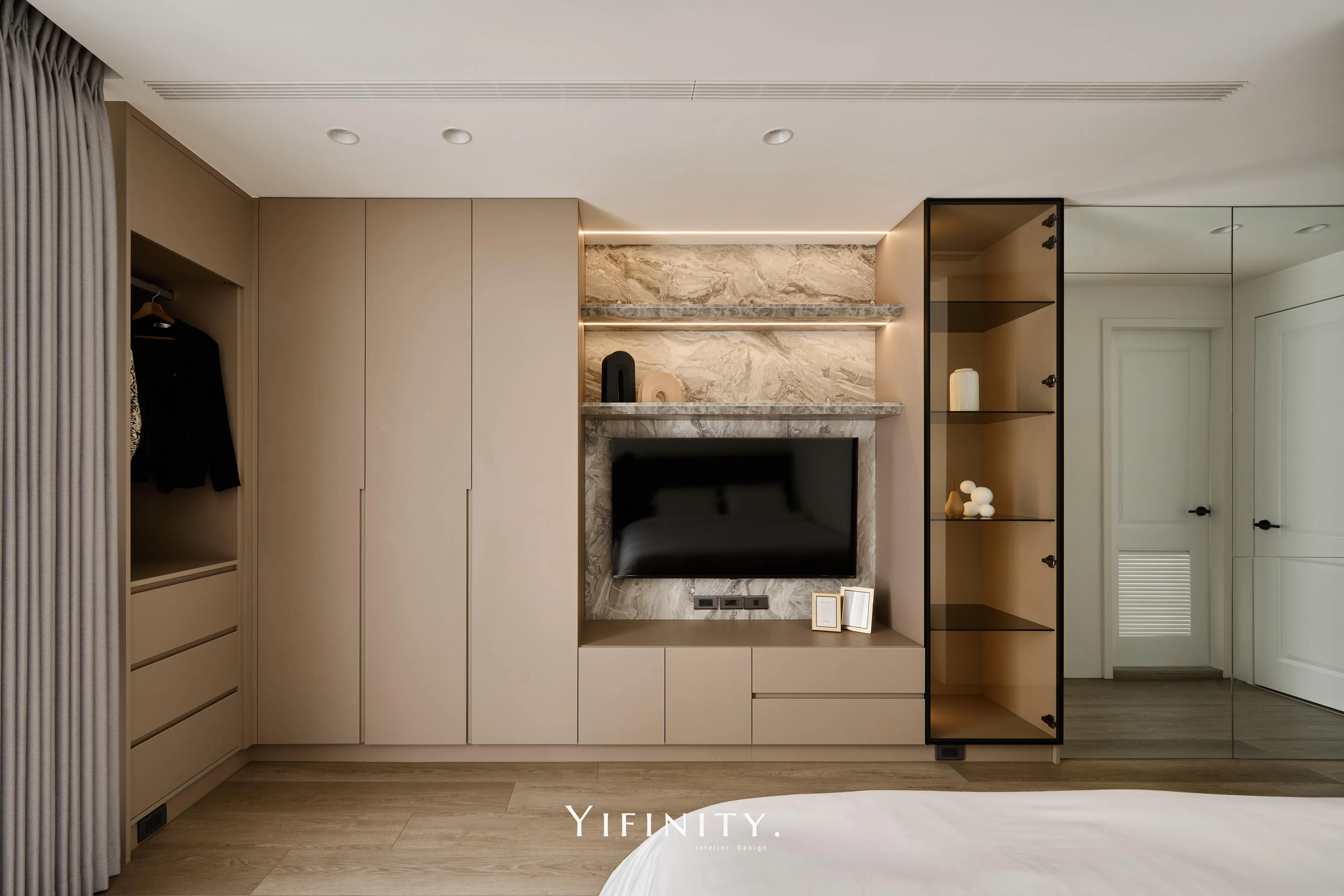 下方以茶鏡點綴創造懸浮感,降低整面櫃體厚重;底部以石材檯面作為視覺基座,增添大器沉穩與奢華質感。