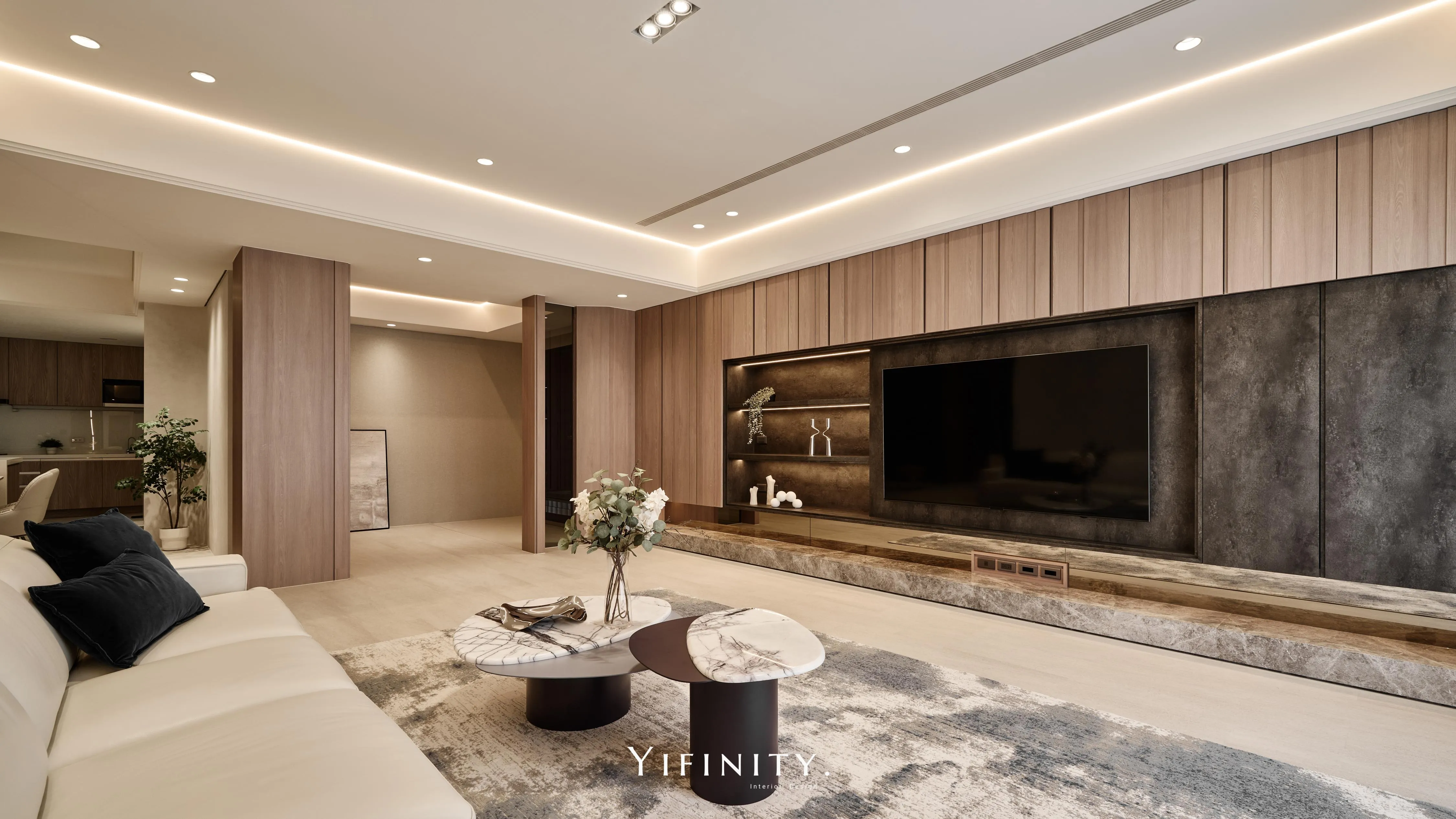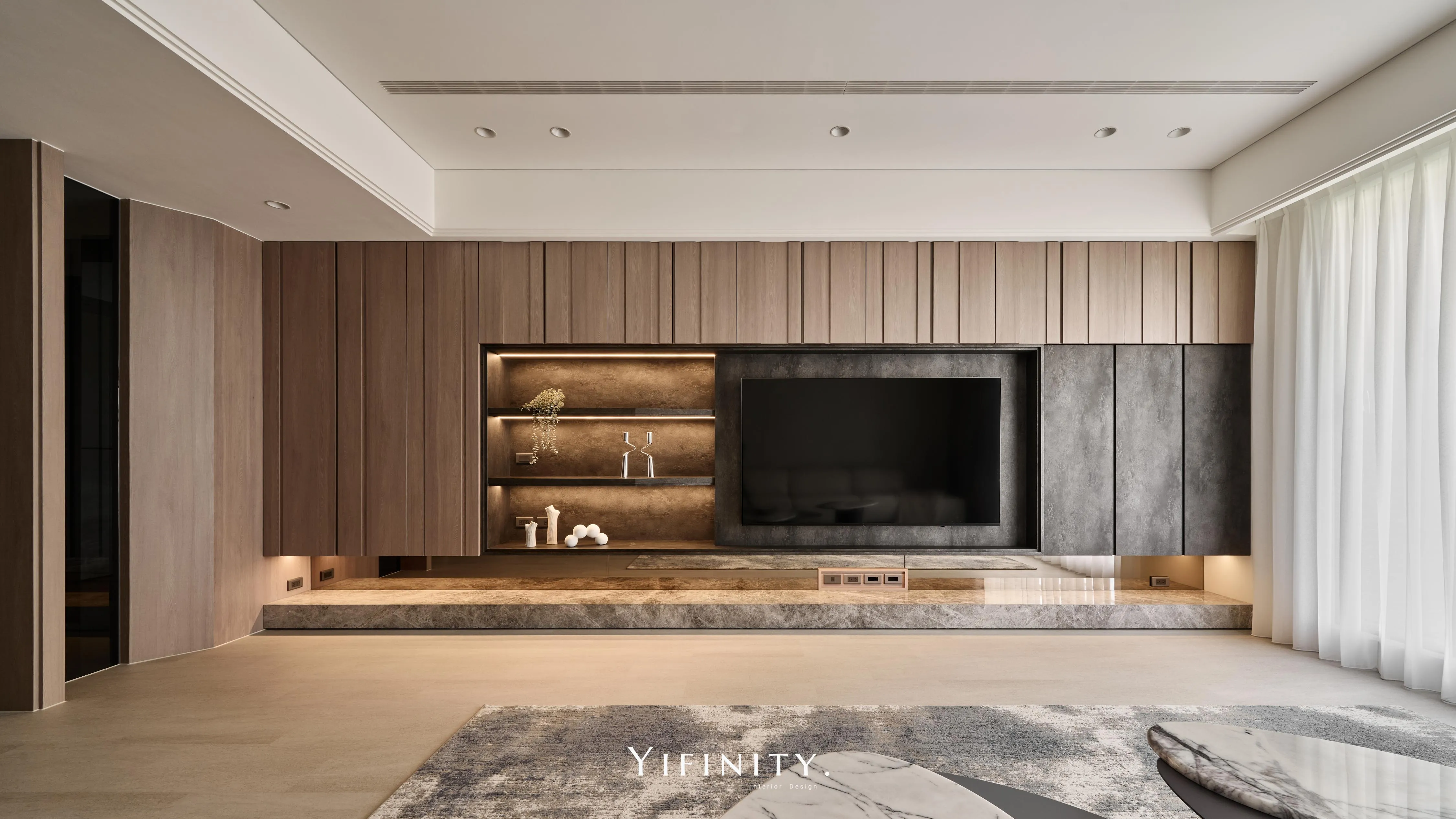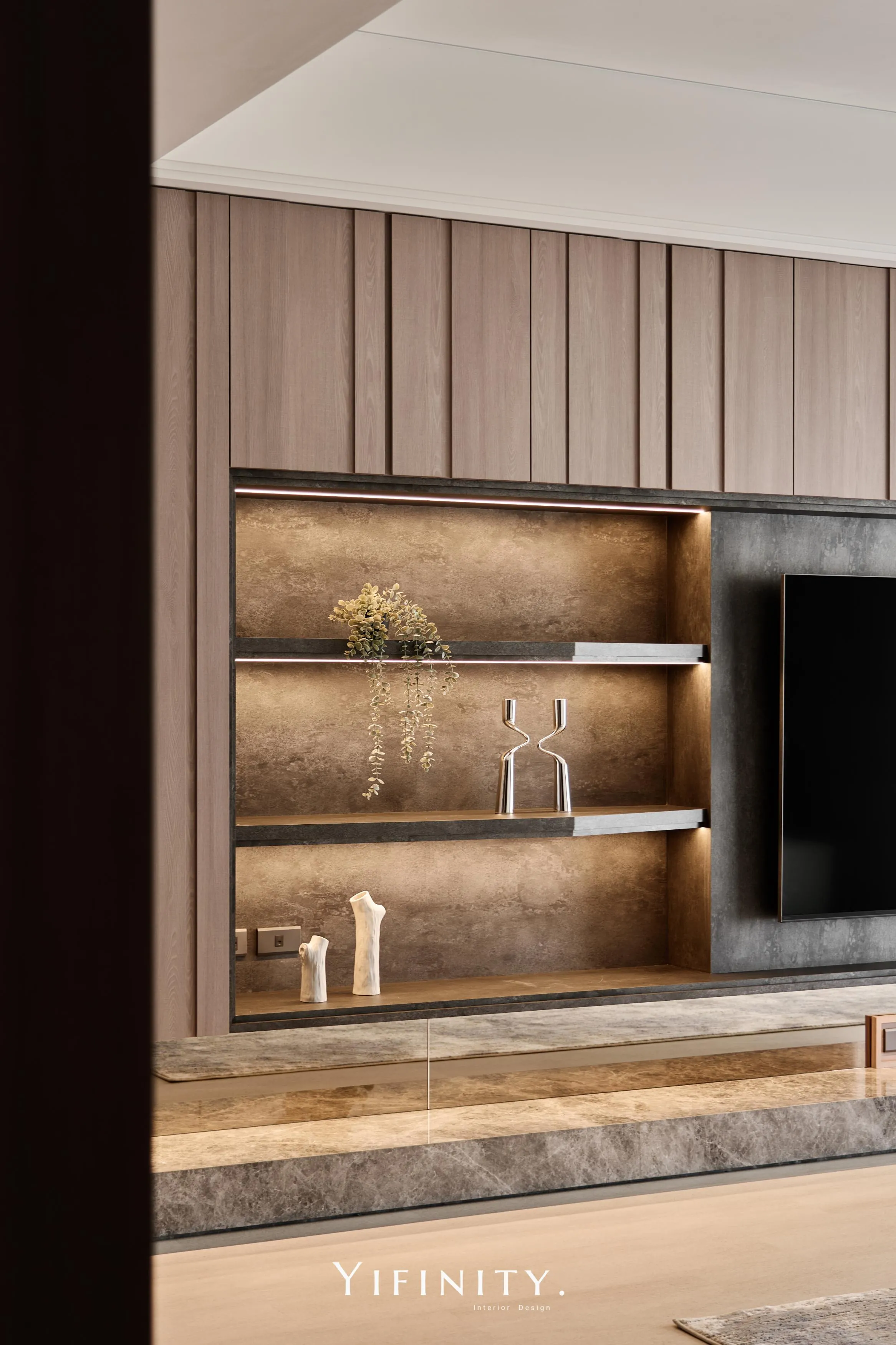 客廳電視牆採整面收納櫃整合展示區,利用木紋立面層次隱藏櫃門分割,呈現中日式與禪風常見的「材質秩序」。