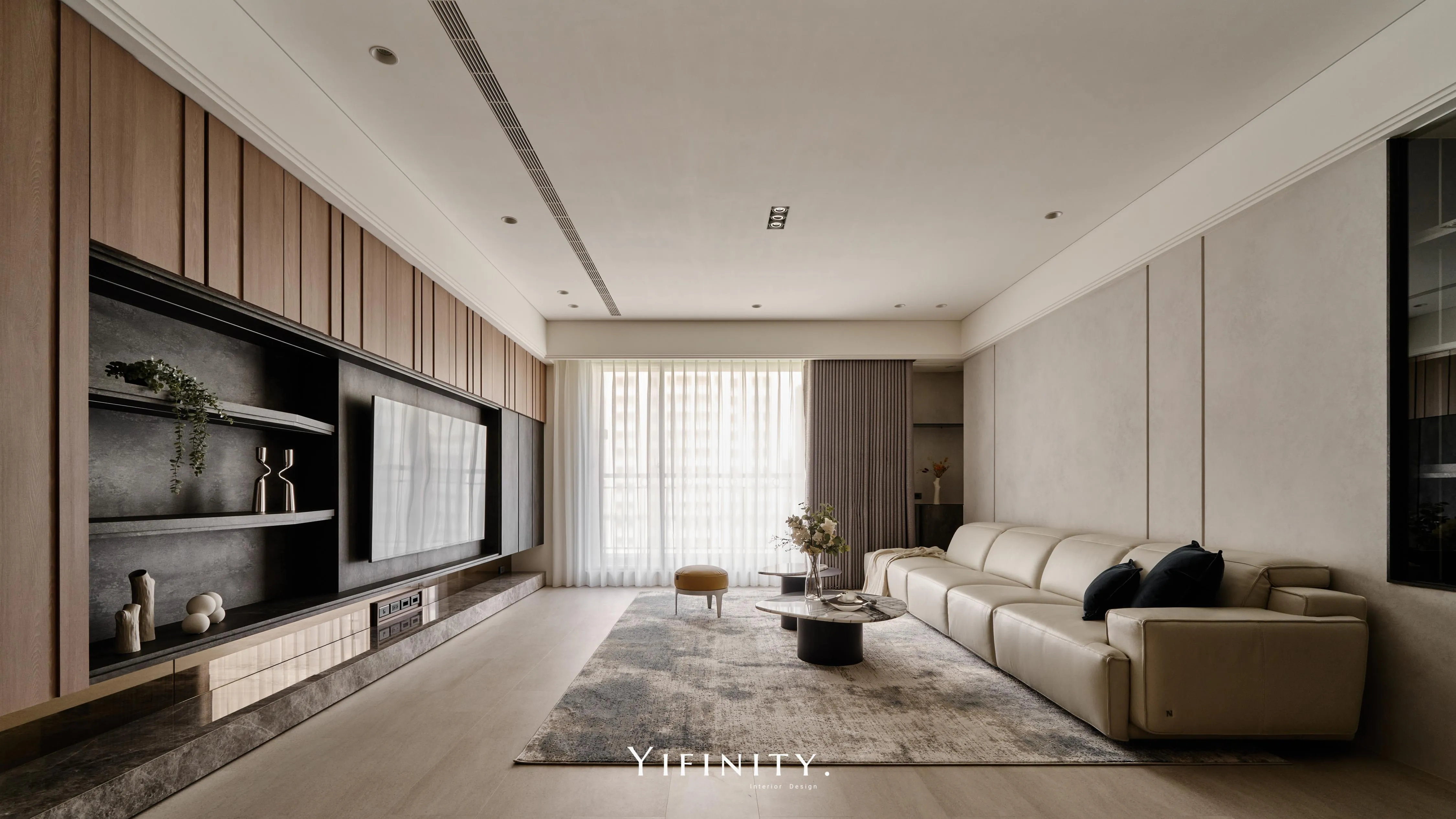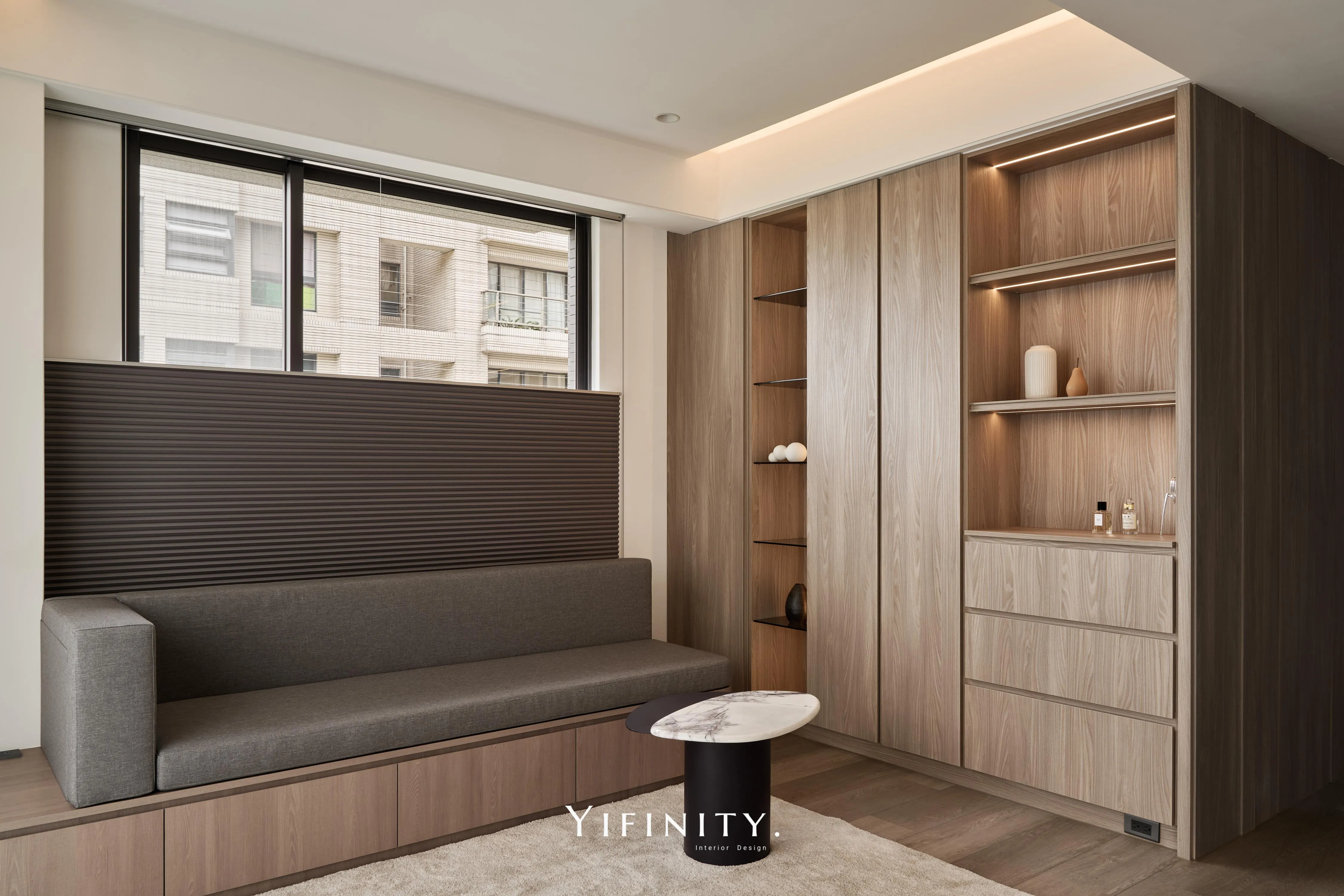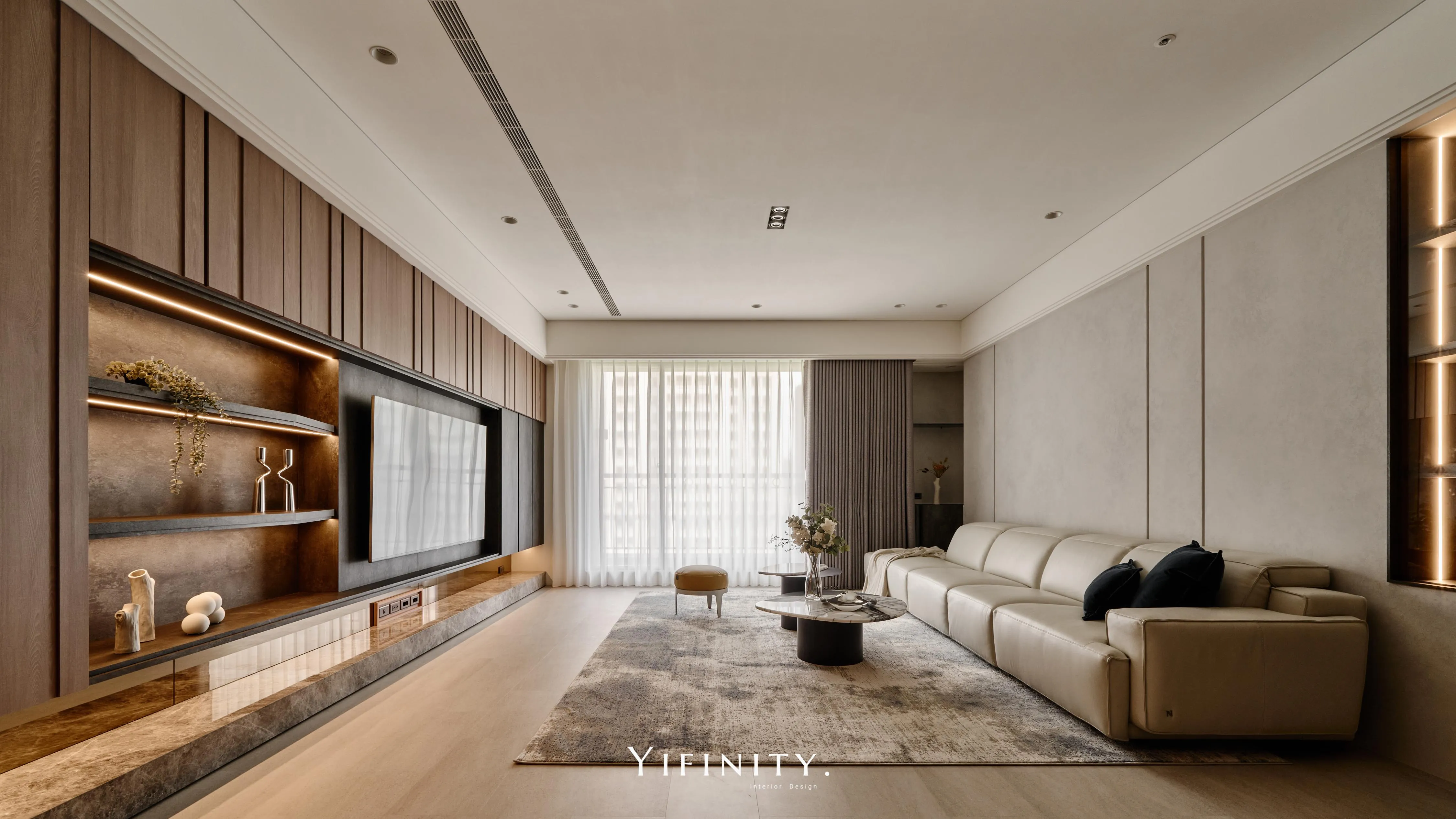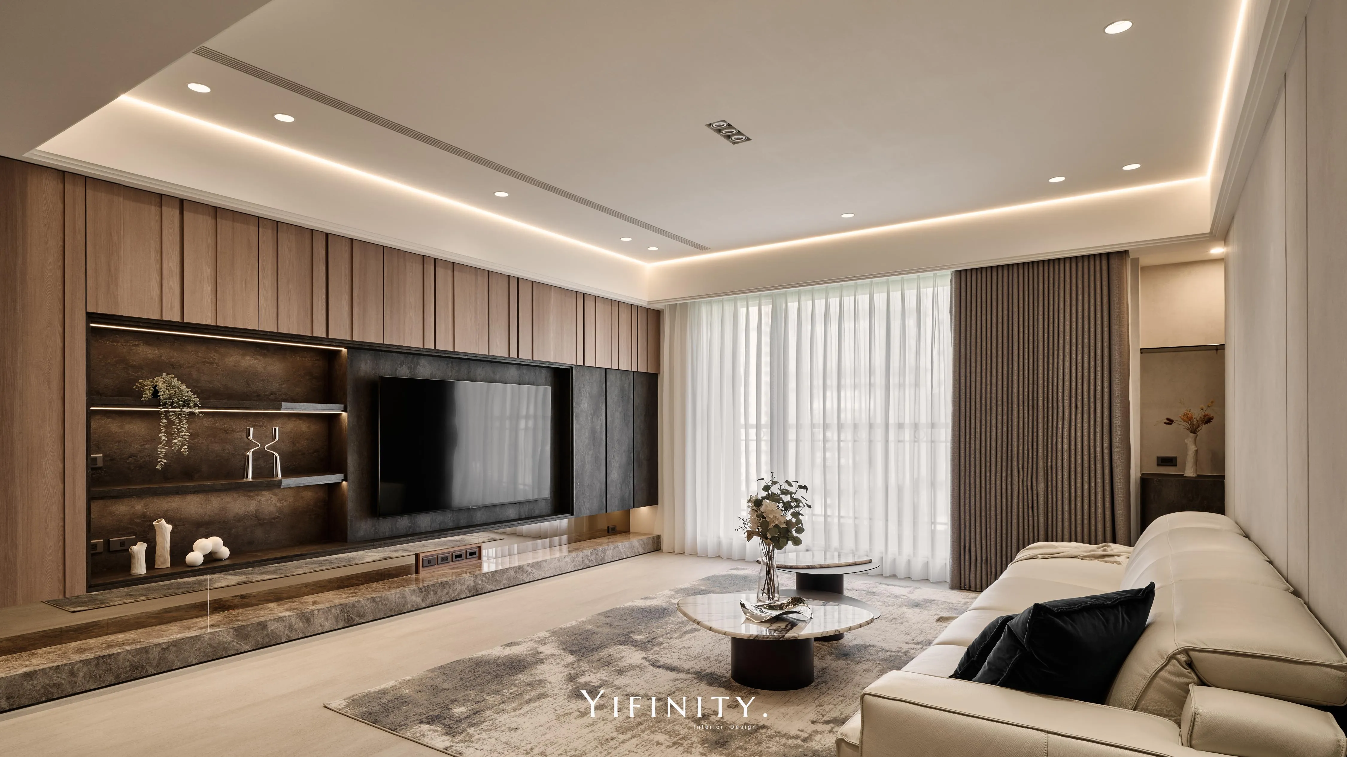 客廳電視牆採整面收納櫃整合展示區,利用木紋立面層次隱藏櫃門分割,呈現中日式與禪風常見的「材質秩序」。