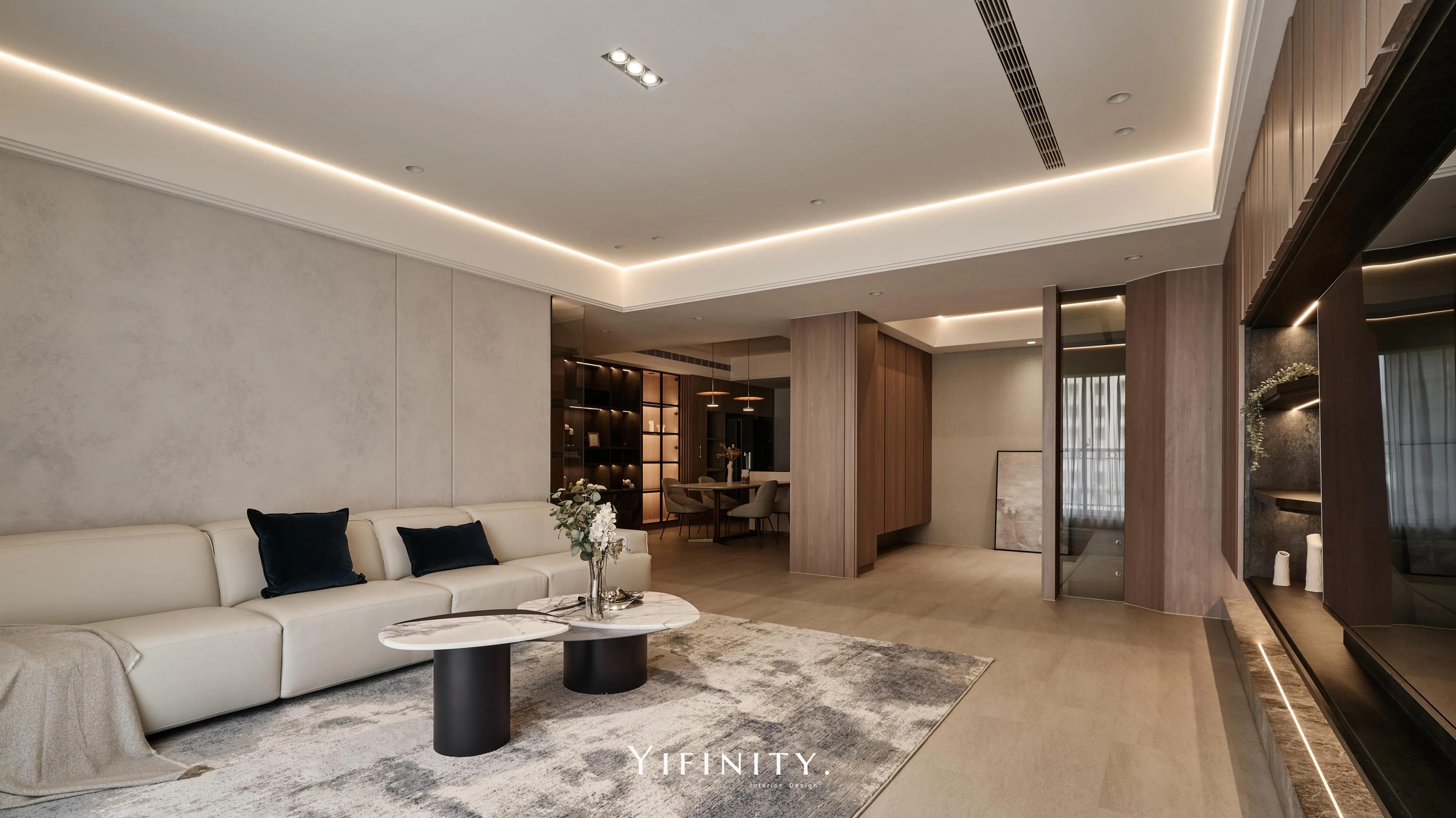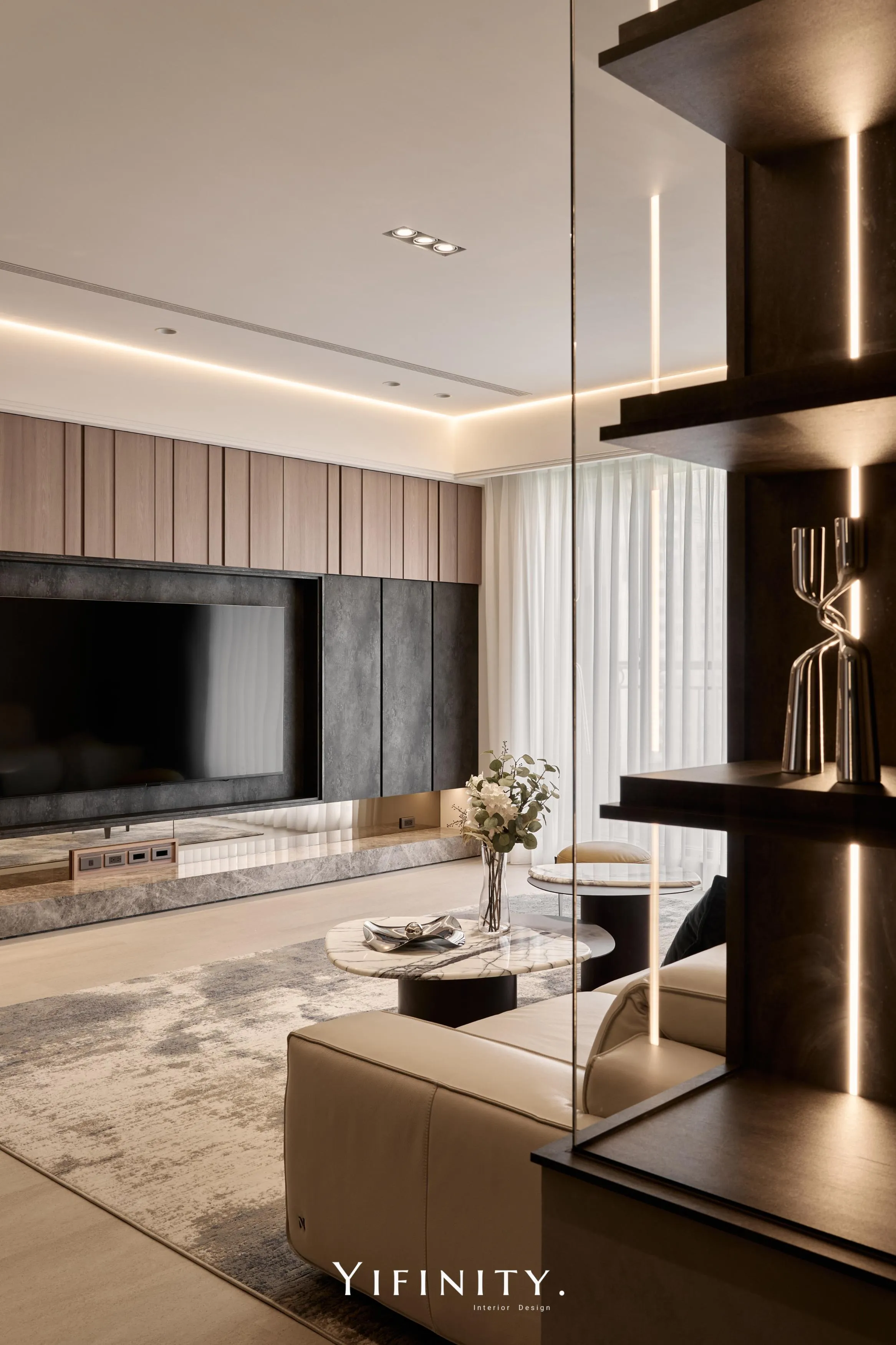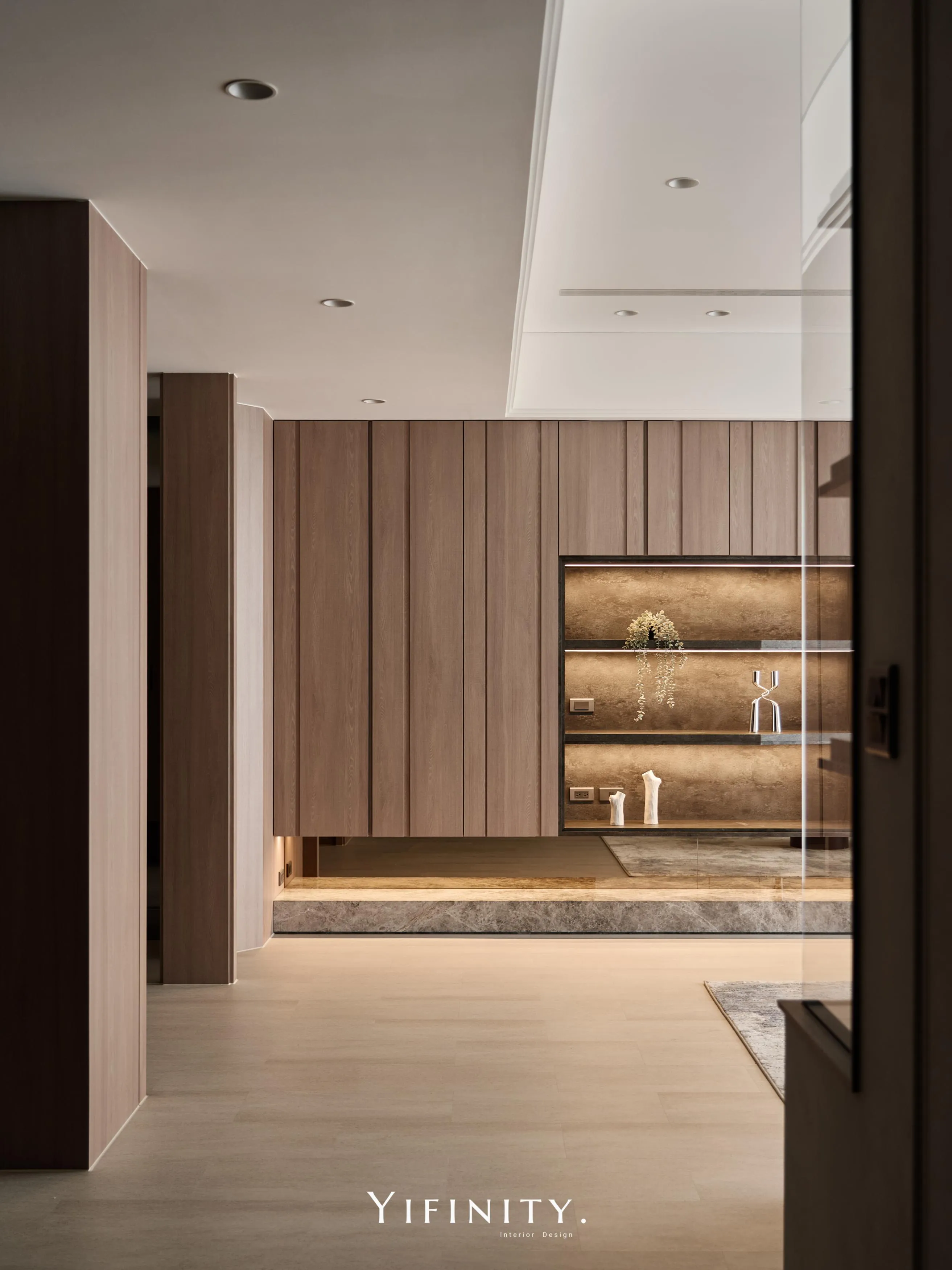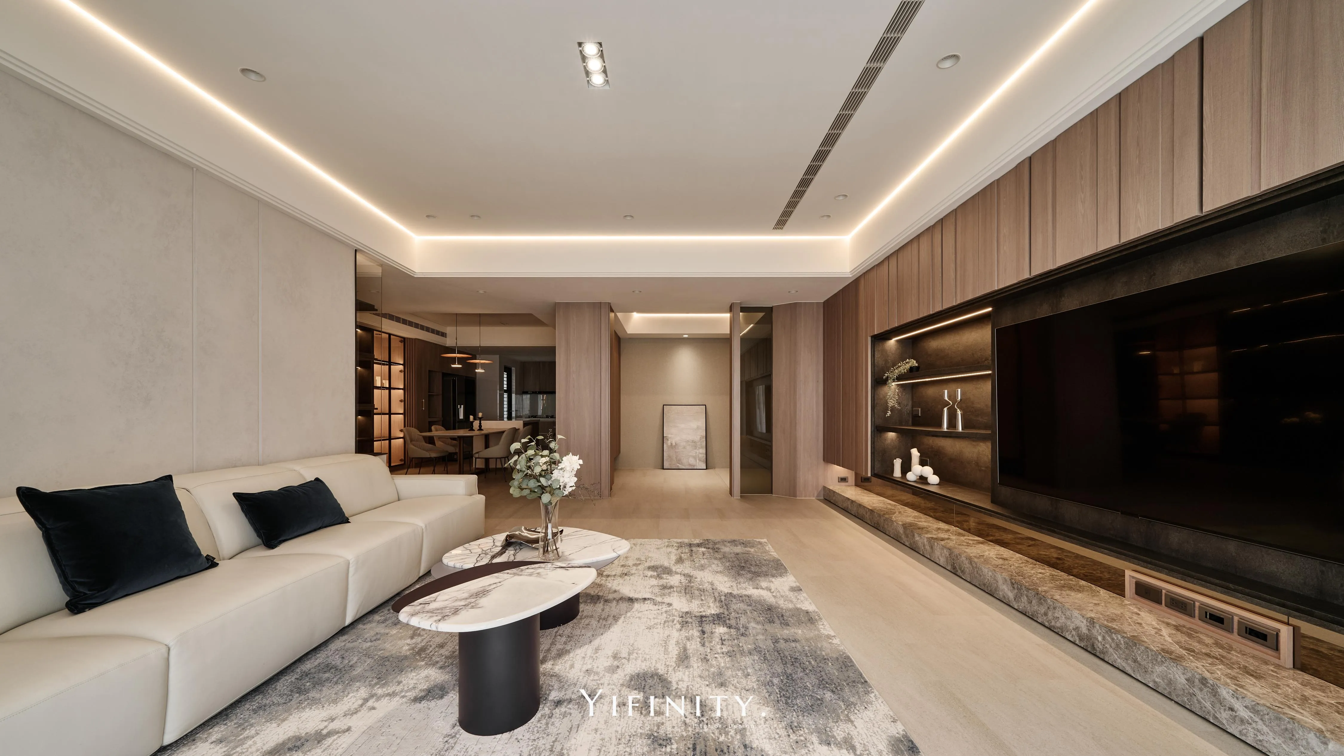 透過木紋、灰階手作塗料、深色金屬材質與線性光源,營造靜謐、沉穩且帶奢華感的居住氛圍。