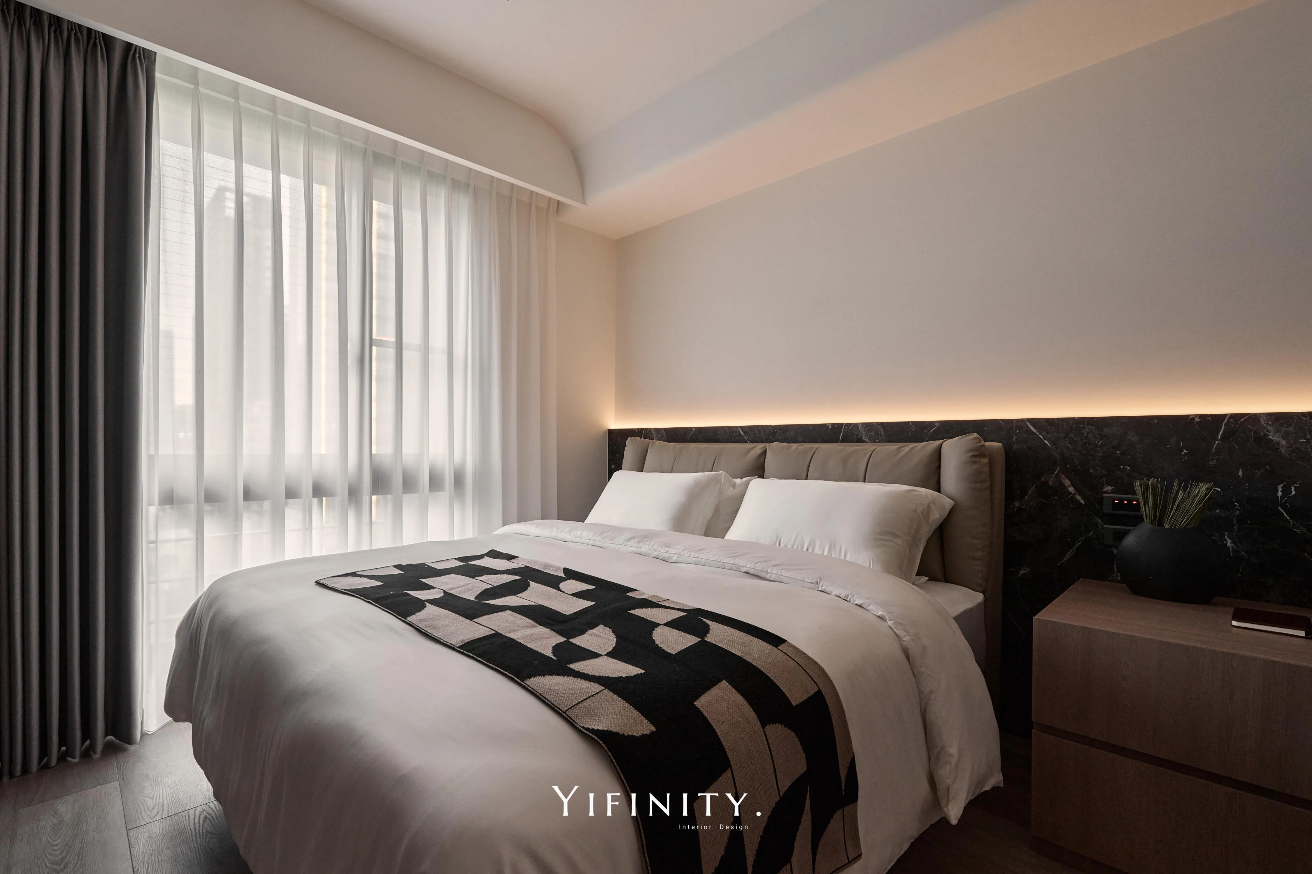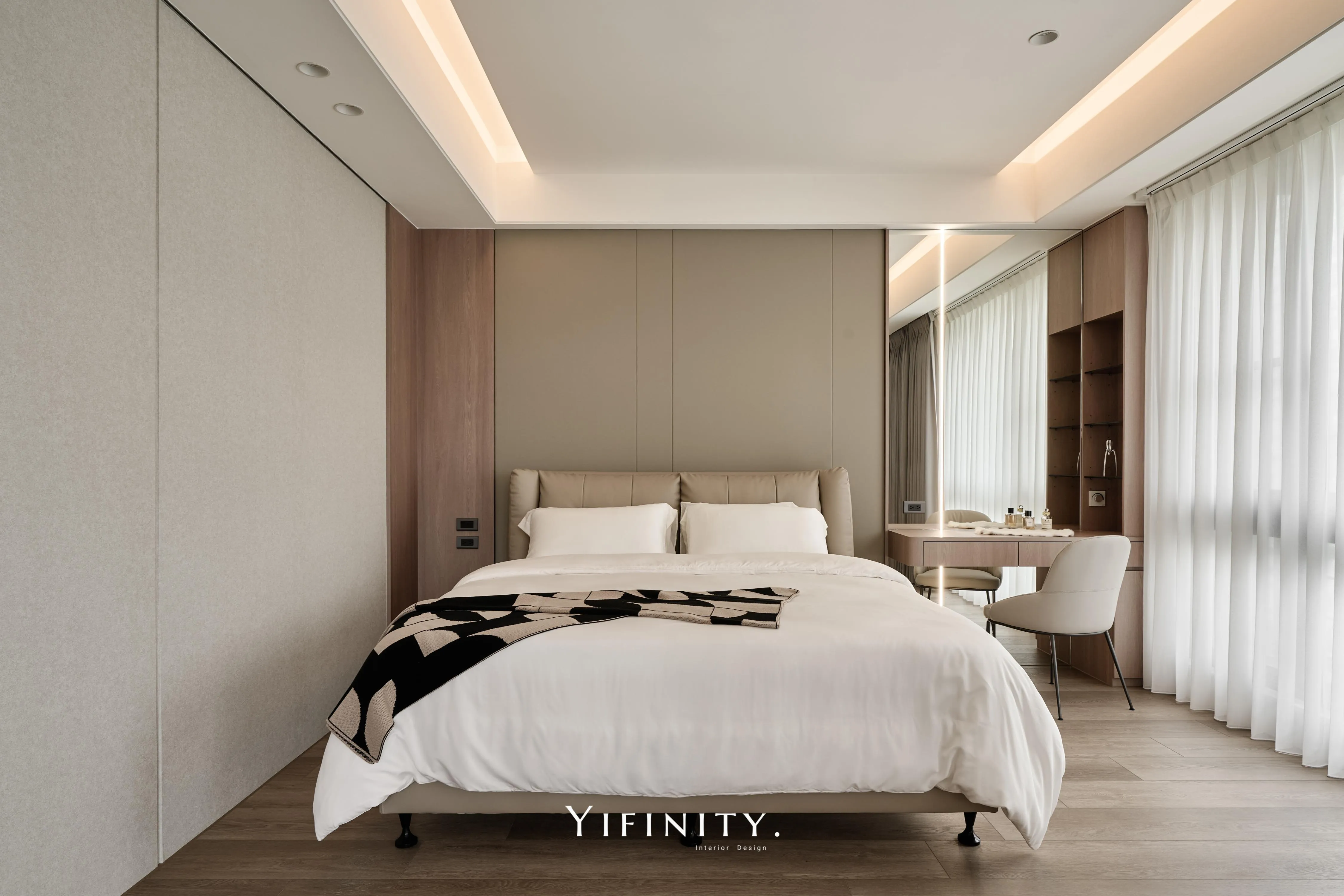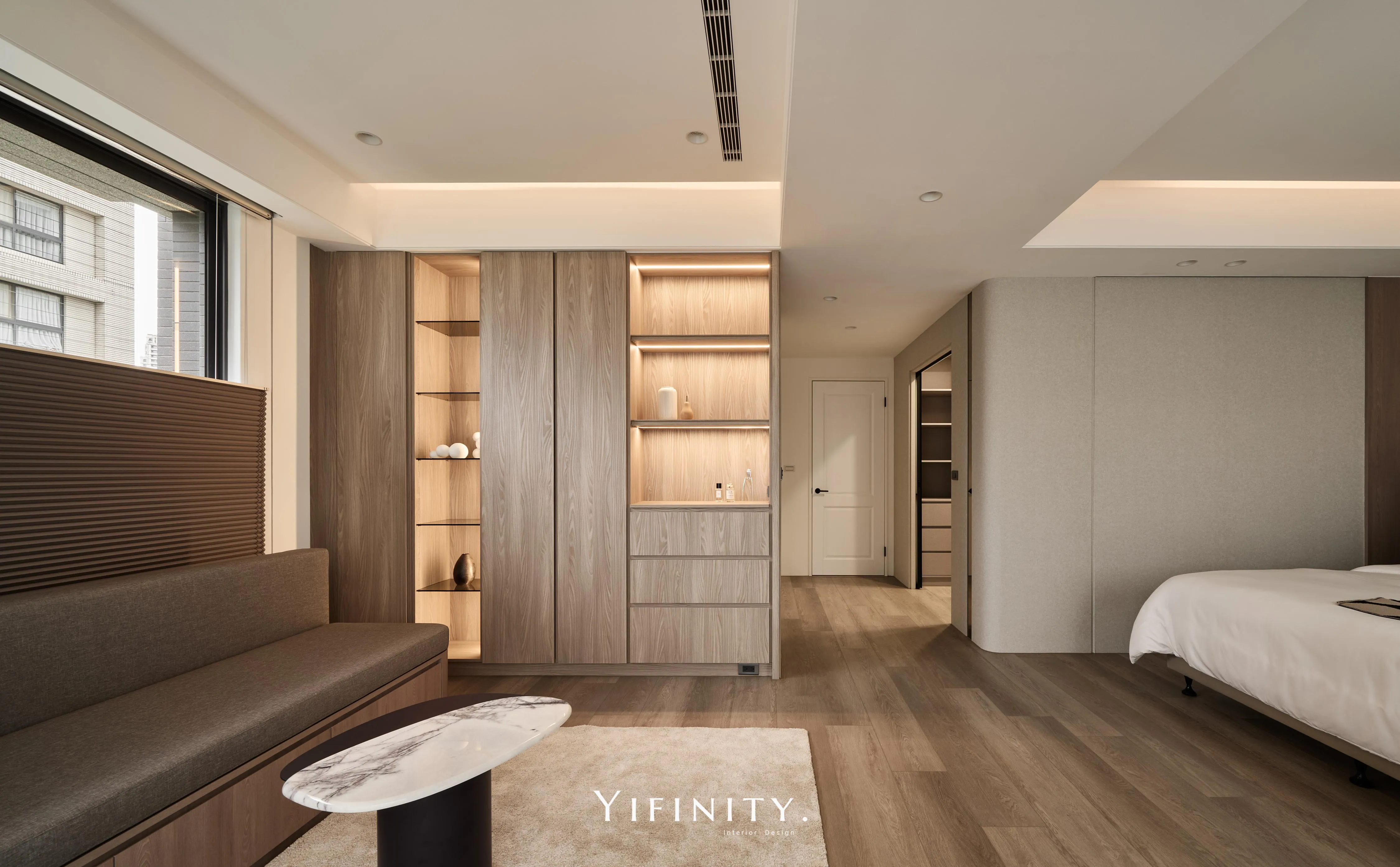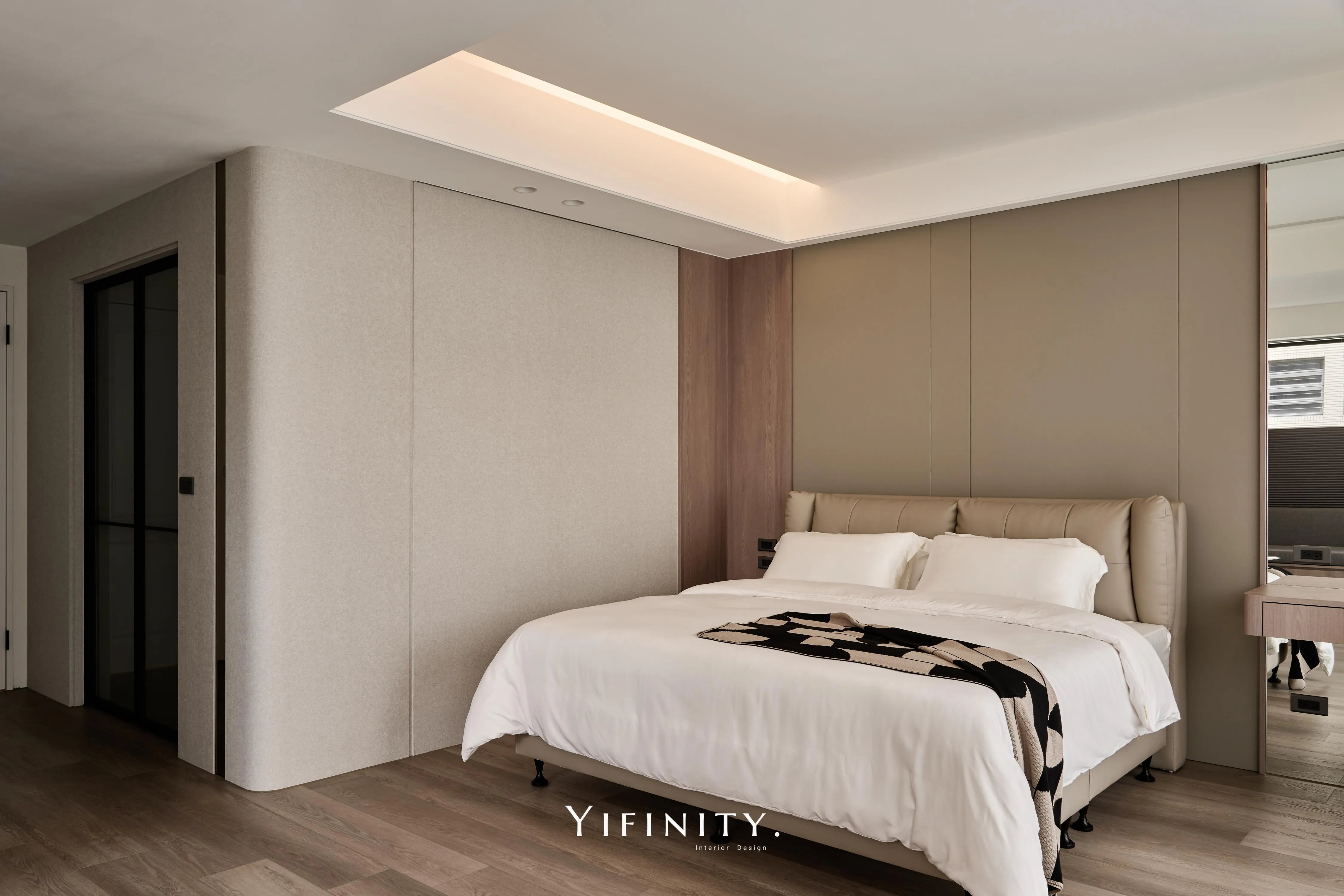 透過木紋、灰階手作塗料、深色金屬材質與線性光源,營造靜謐、沉穩且帶奢華感的居住氛圍。