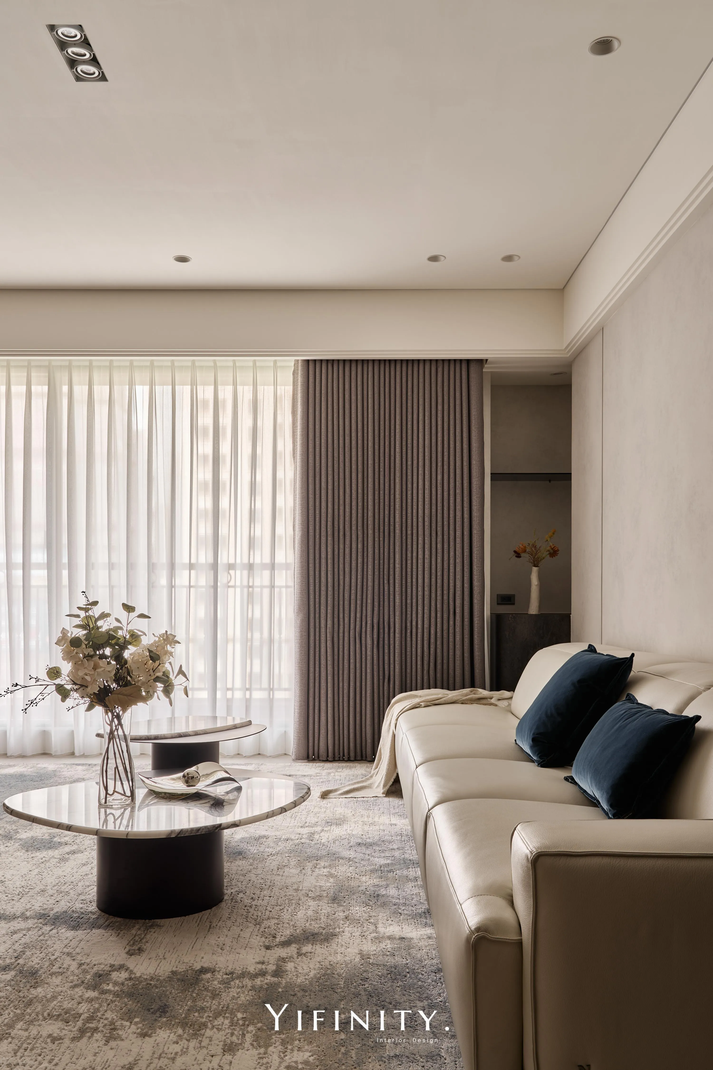 軟裝以白色沙發、淡藍渲染地毯營造清爽度,並使用不規則造型茶几平衡空間多以直線構成的語彙。