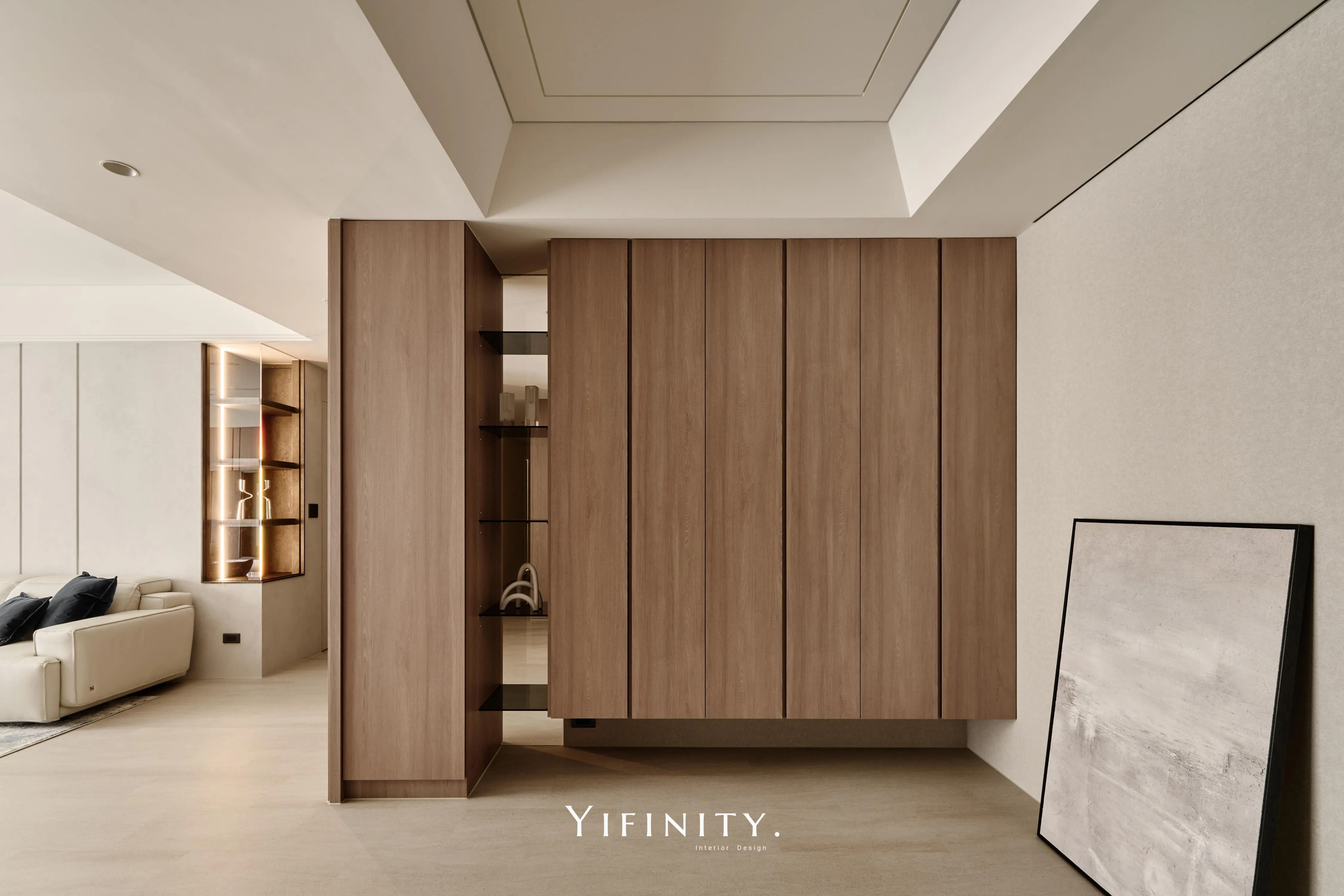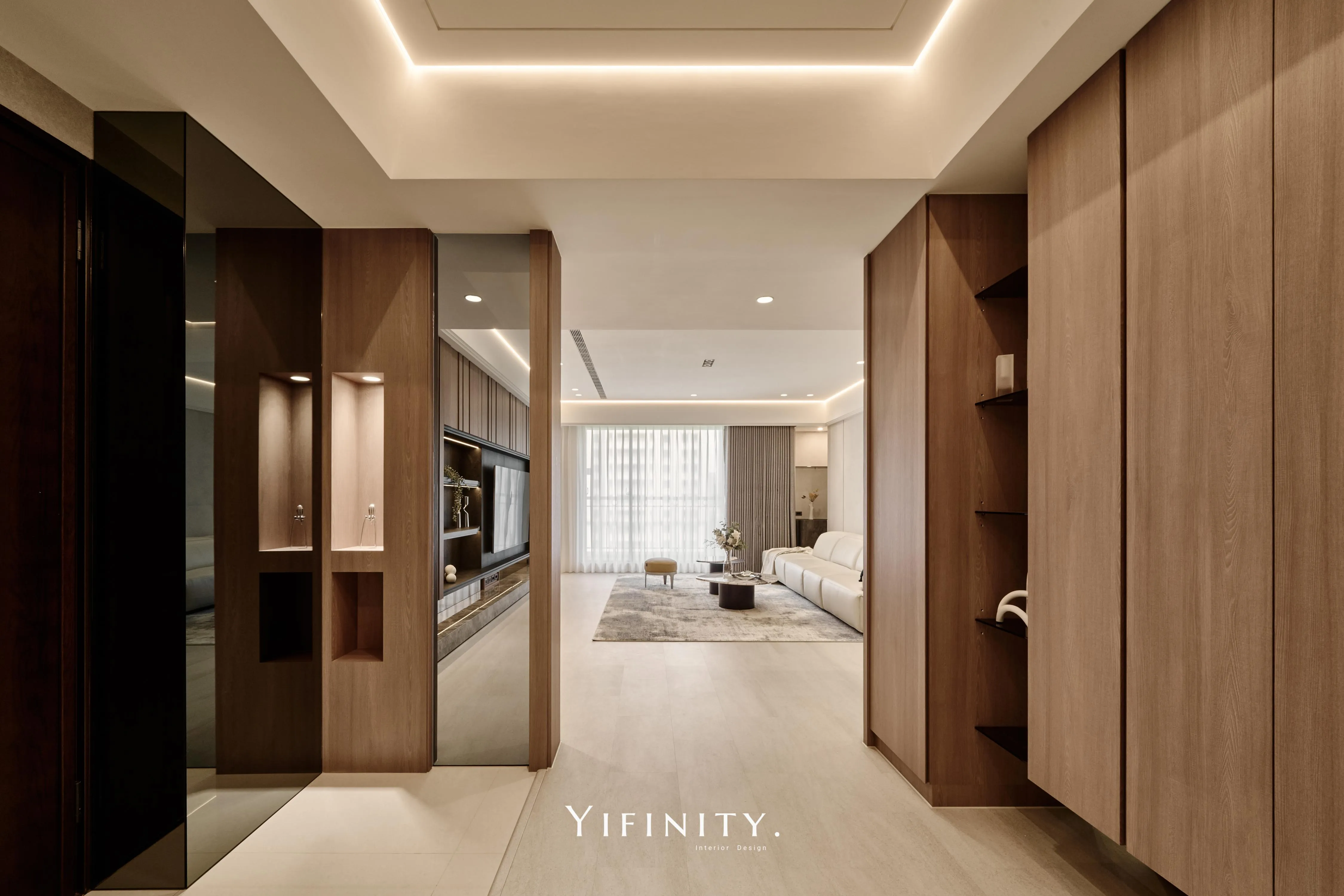 玄關以鞋櫃作屏風,局部配置玻璃材質提升穿透感,使入門視覺不侷促並兼顧收納機能。