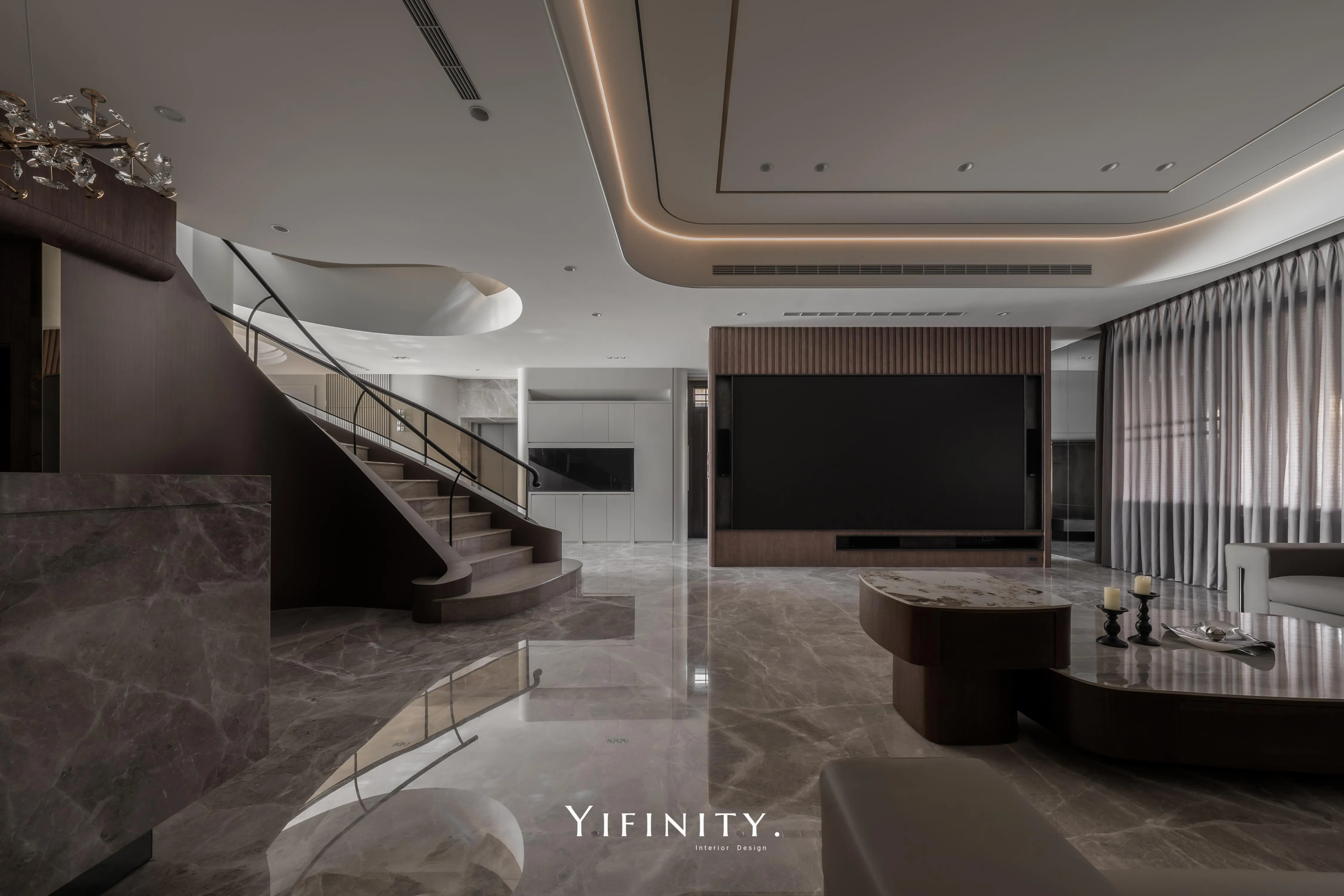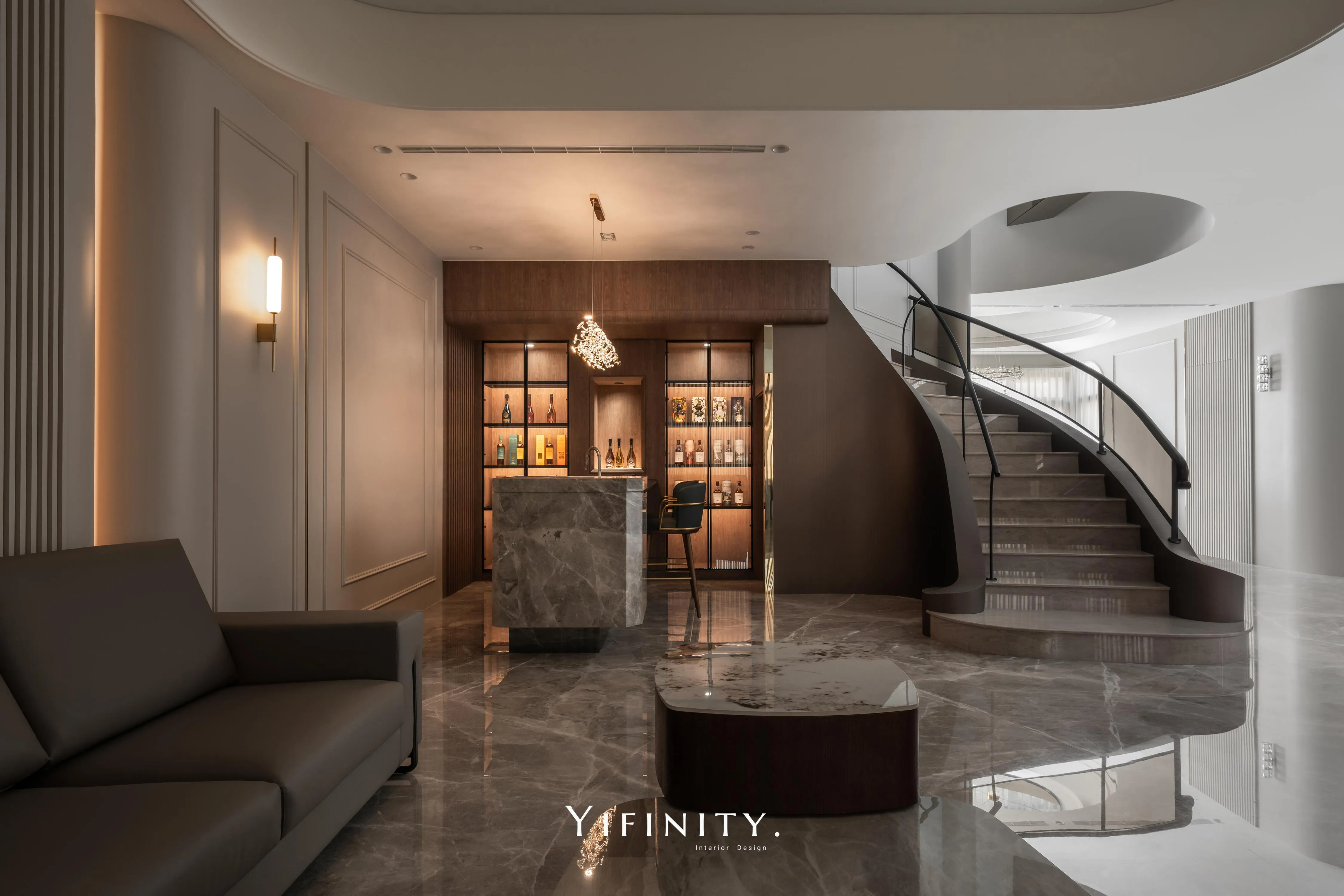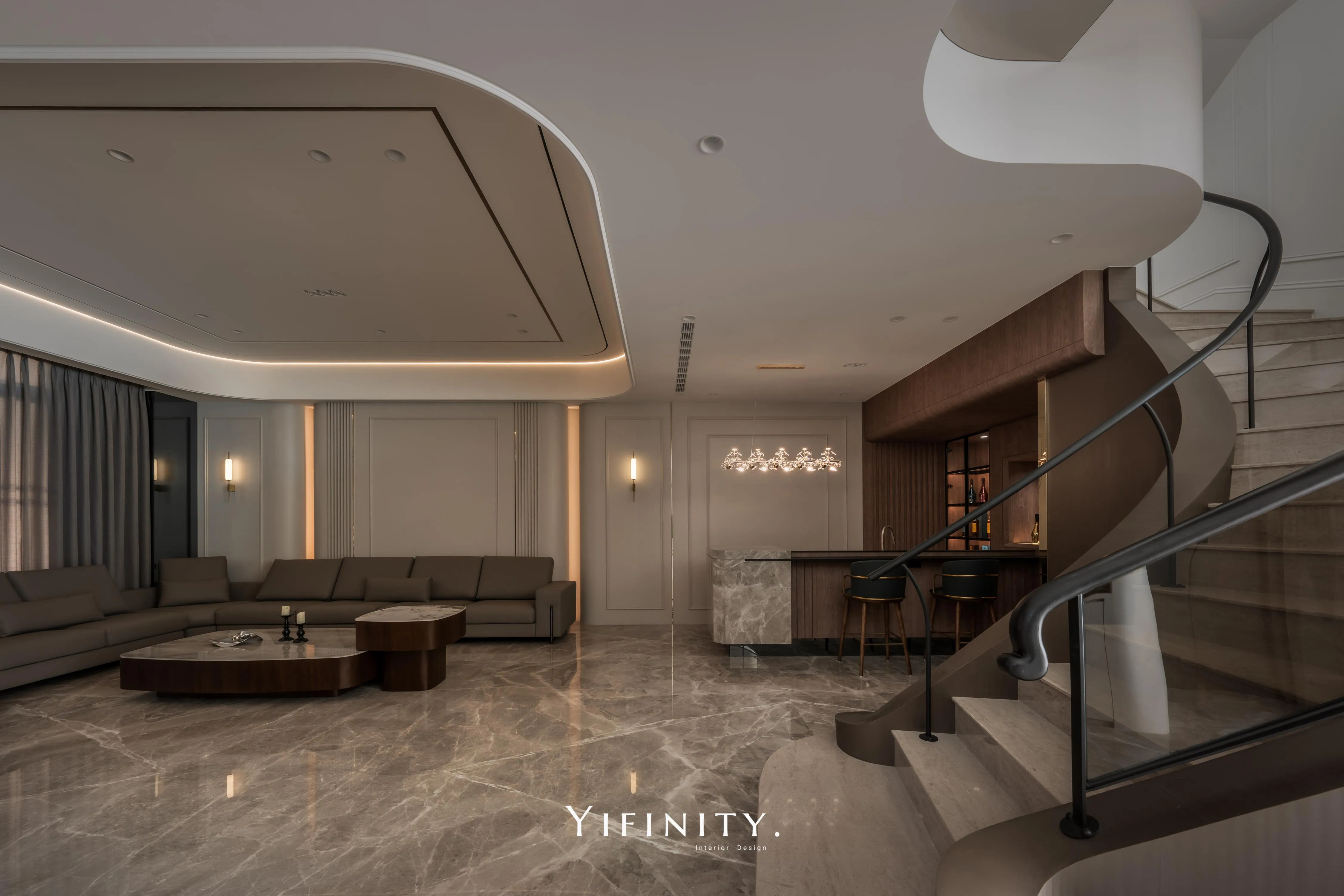 曲線天花以燈帶描邊,像柔光把情緒慢慢鋪陳;旋轉樓梯以木作包覆曲面量體,搭配仿金屬貼皮拉出精緻的光澤層次,