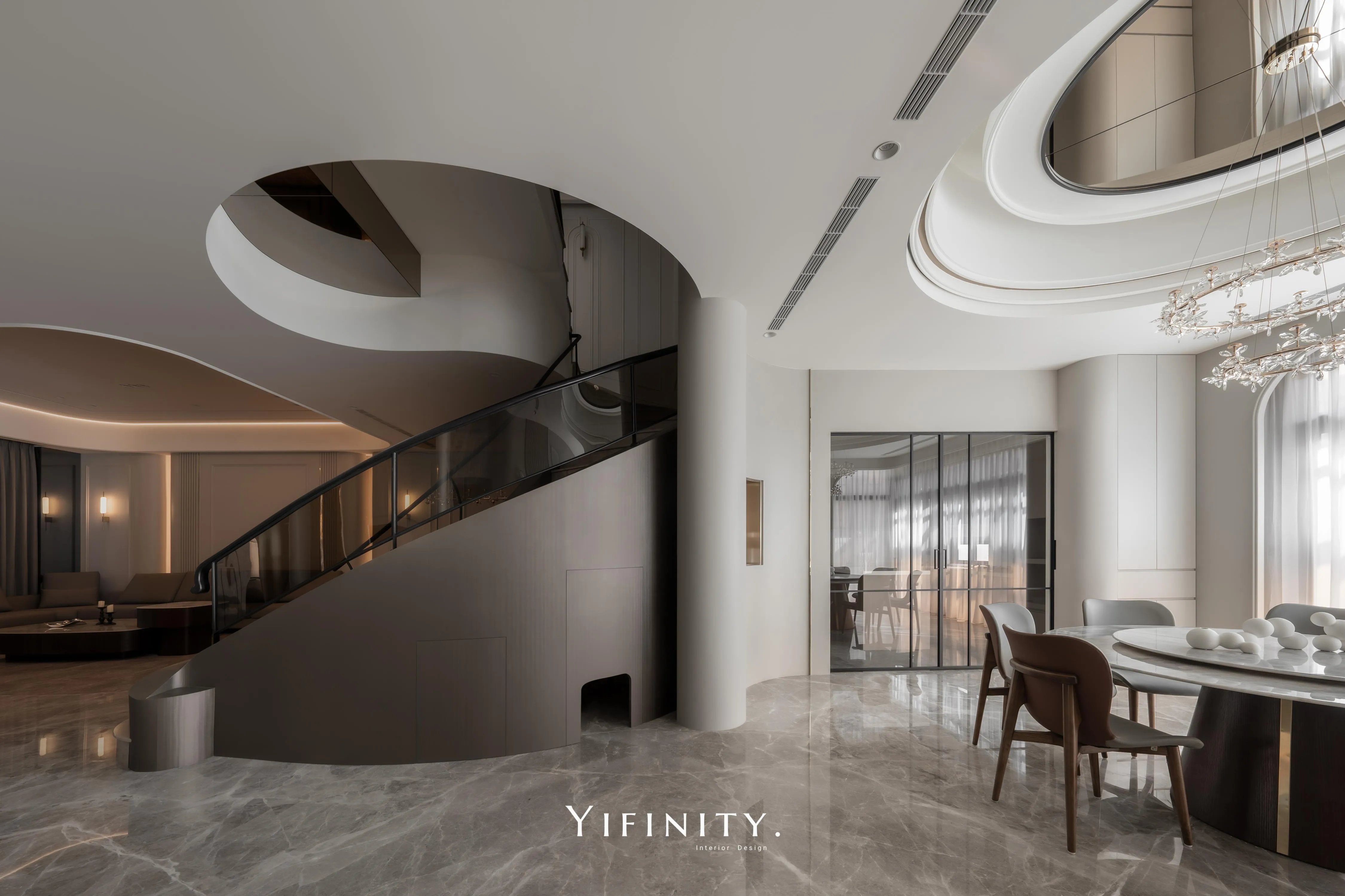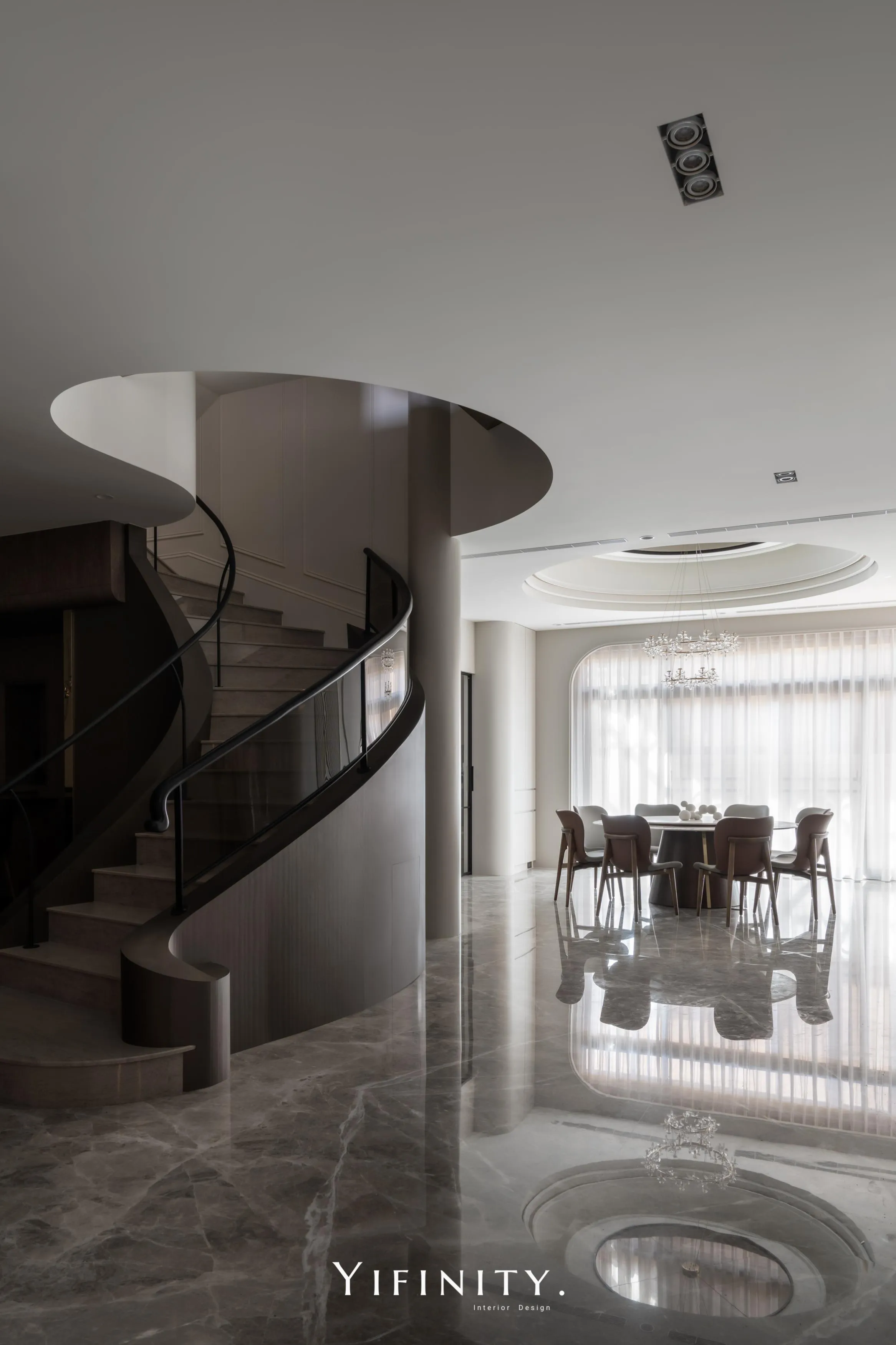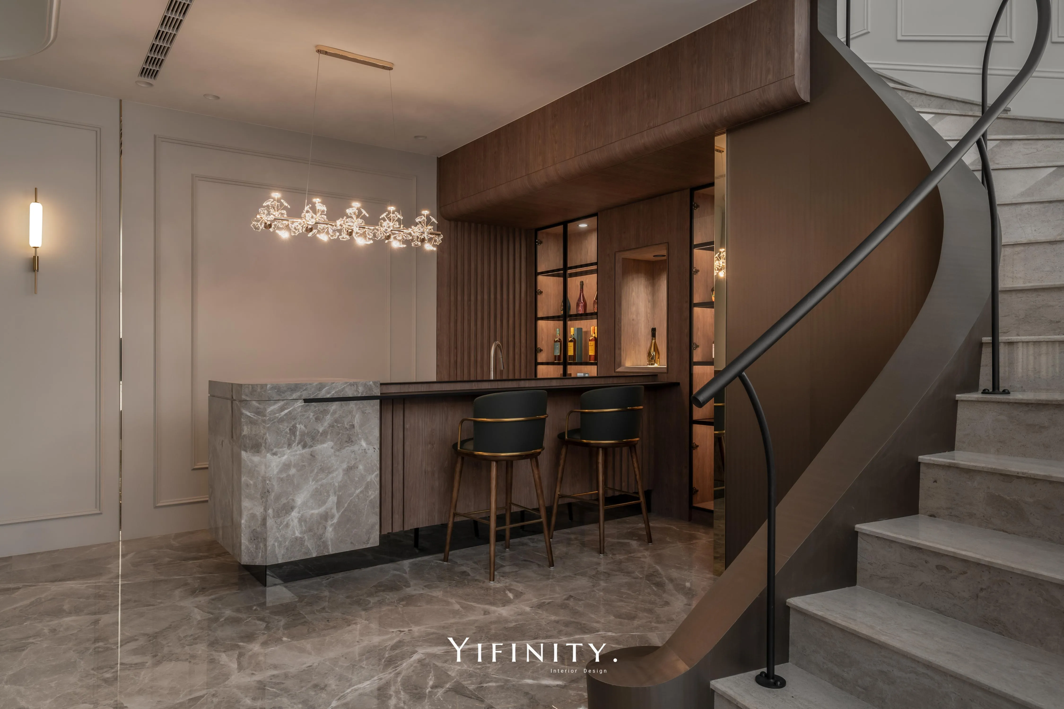 曲線天花以燈帶描邊,像柔光把情緒慢慢鋪陳;旋轉樓梯以木作包覆曲面量體,搭配仿金屬貼皮拉出精緻的光澤層次,