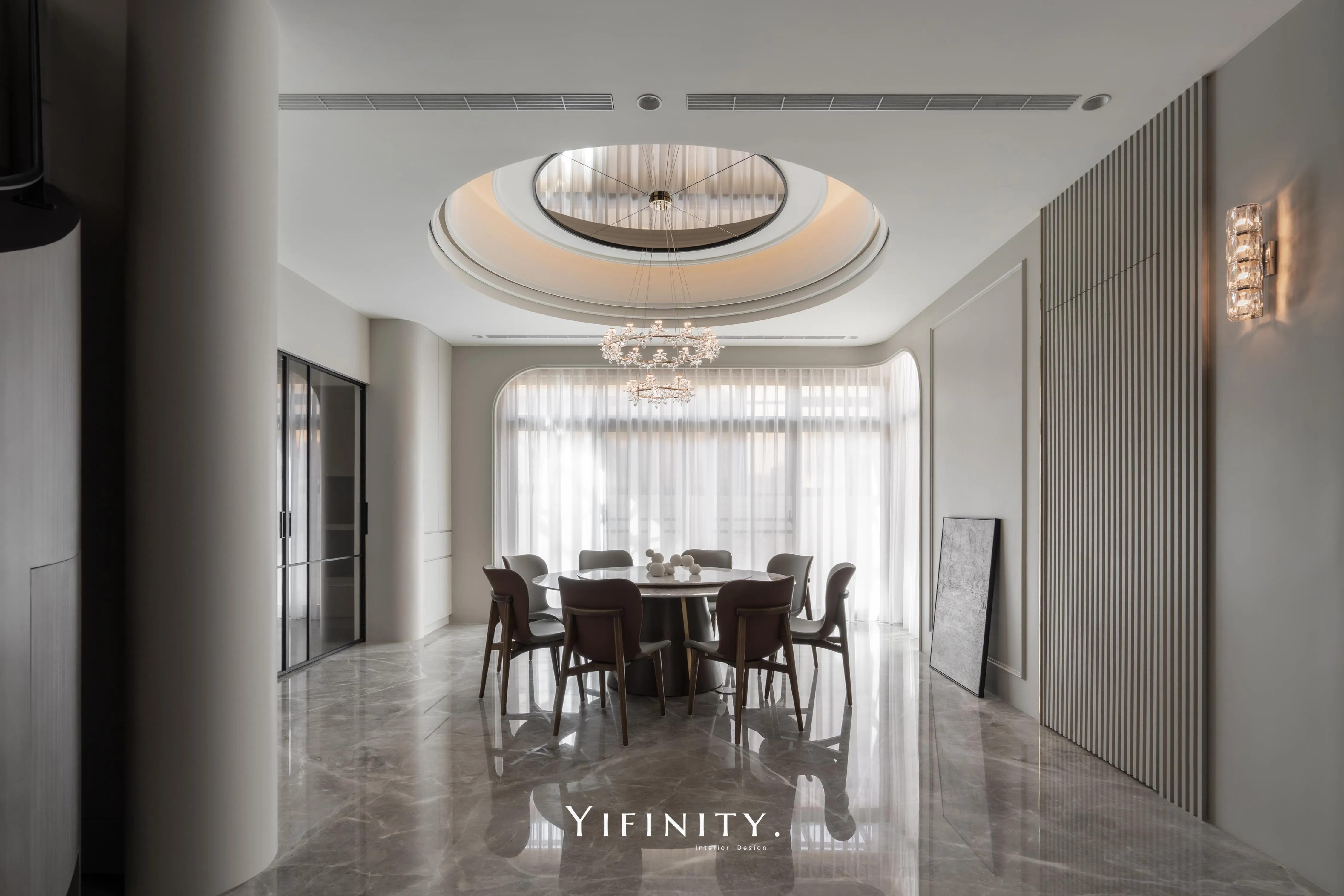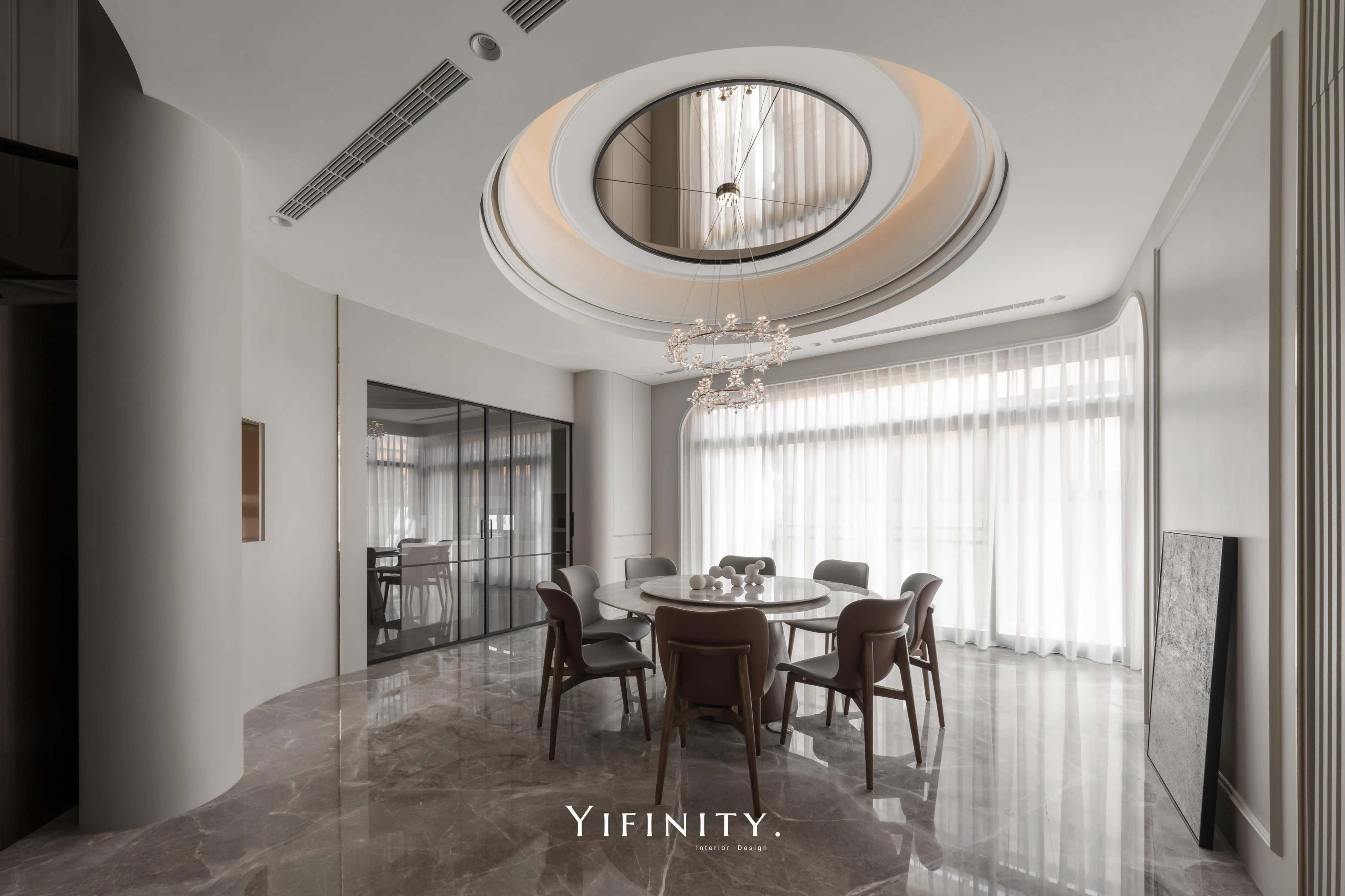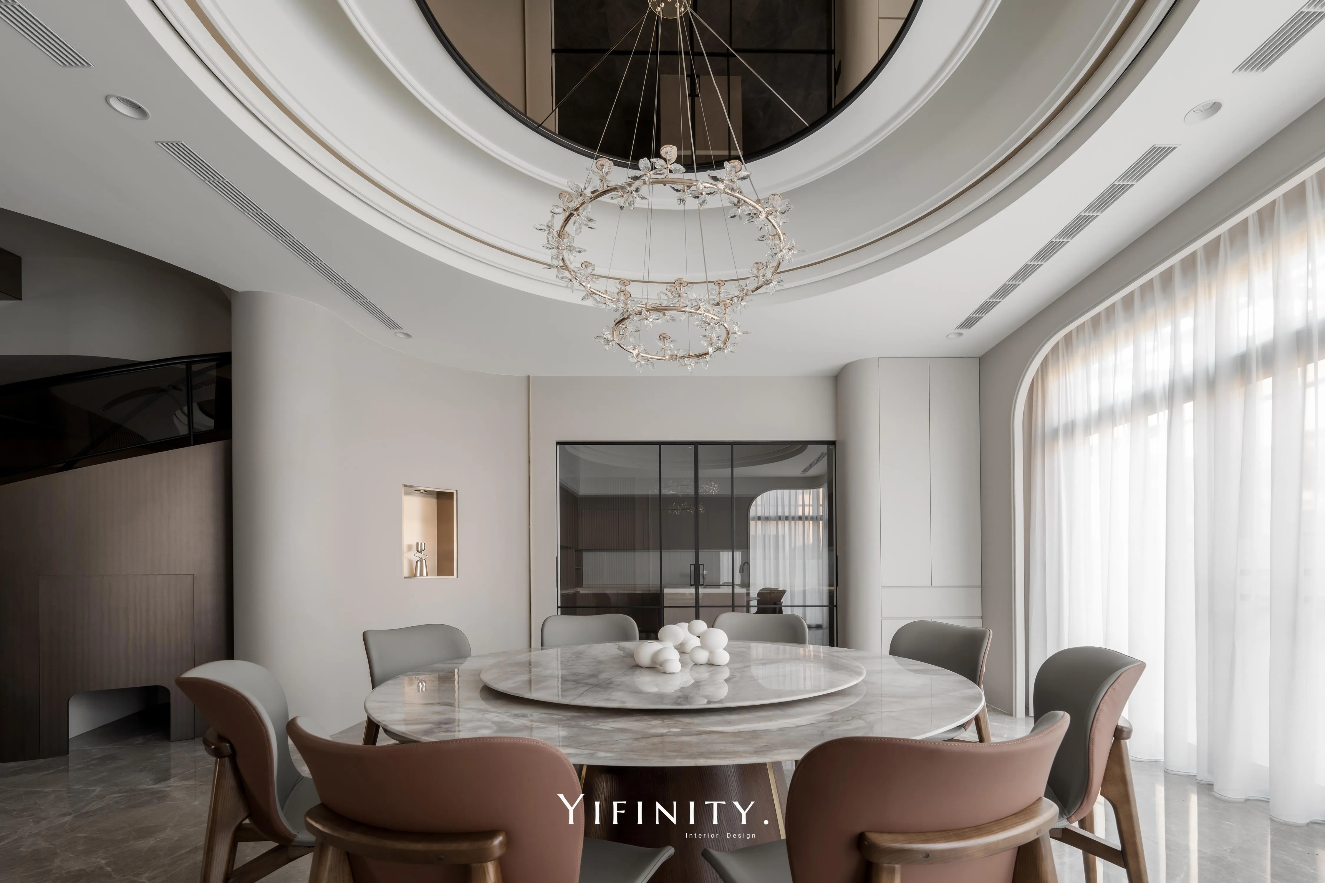 餐廳以圓形天花呼應圓桌,茶鏡貼附增添空間感與精緻度;弧形牆面延續同一段語彙,使全屋如流水、如緞帶般絲滑,