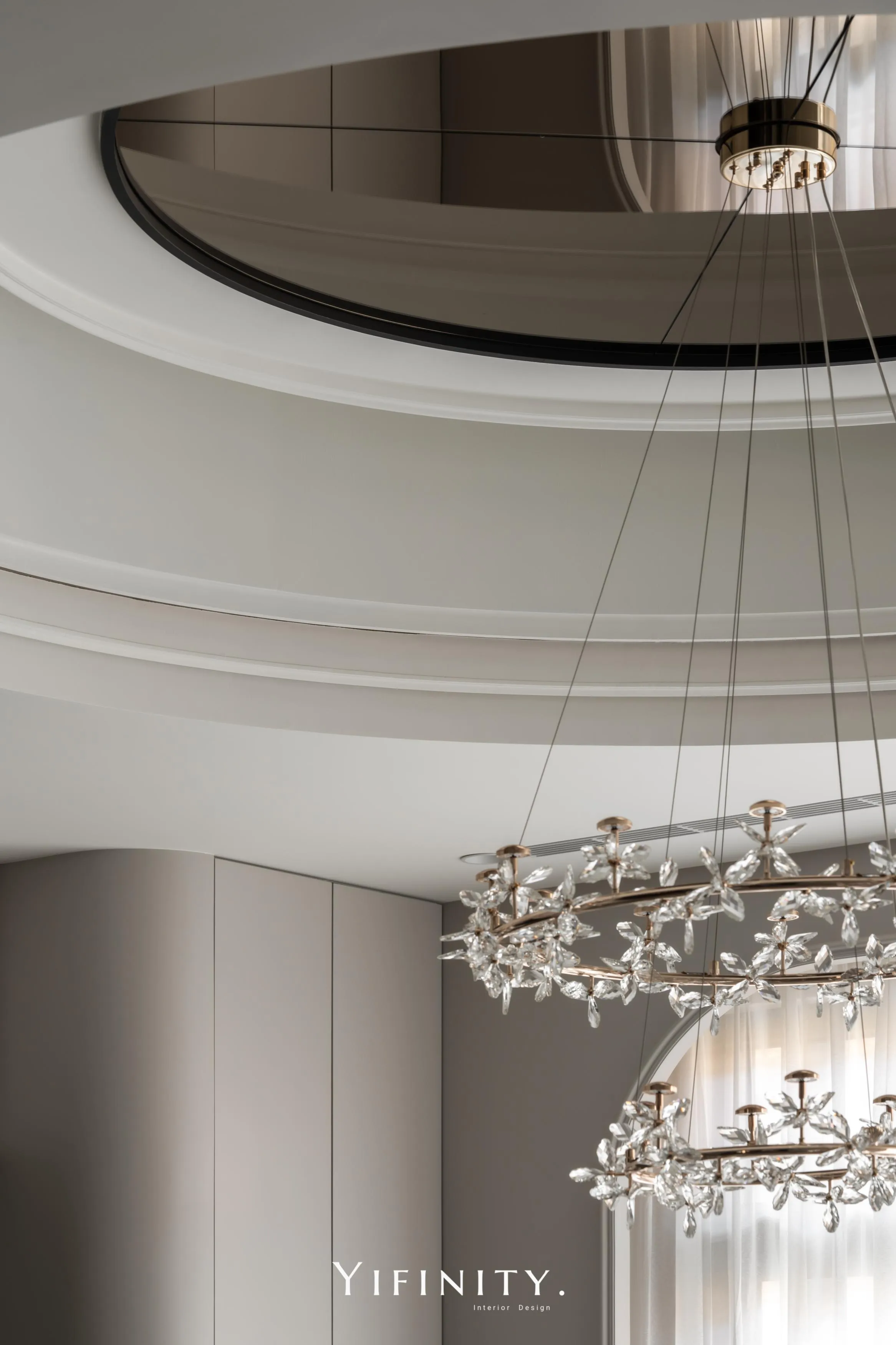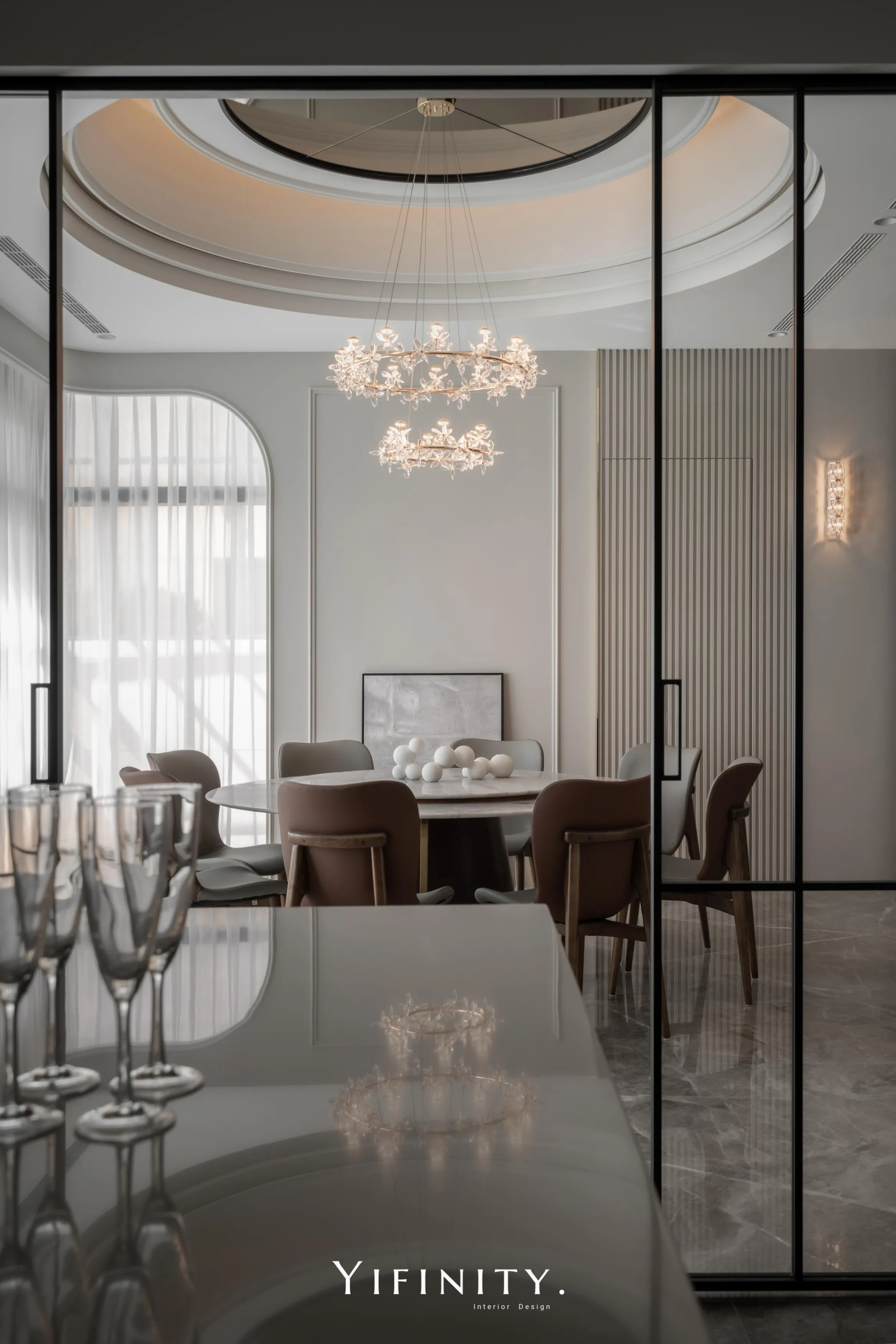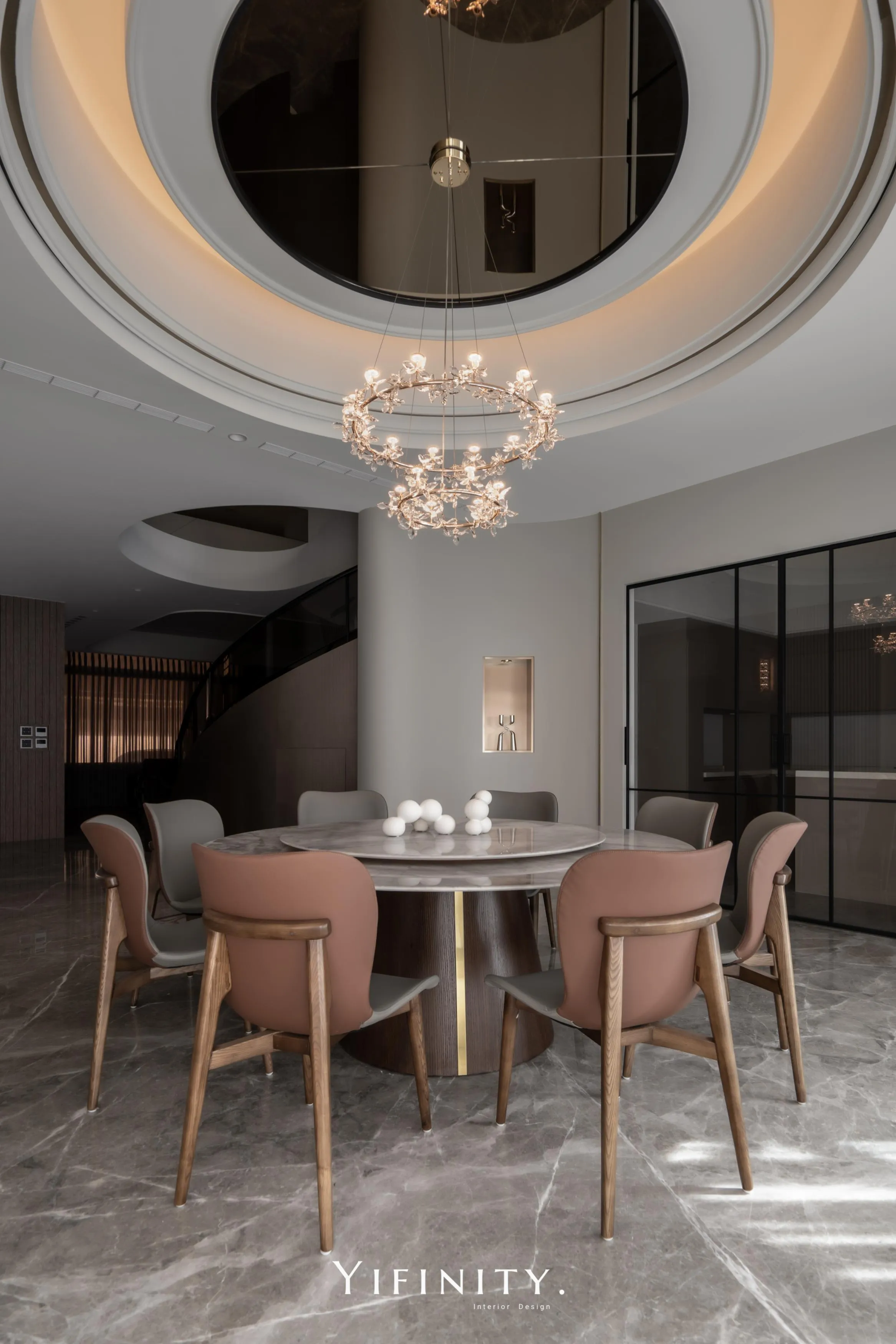 餐廳以圓形天花呼應圓桌,茶鏡貼附增添空間感與精緻度;弧形牆面延續同一段語彙,使全屋如流水、如緞帶般絲滑,