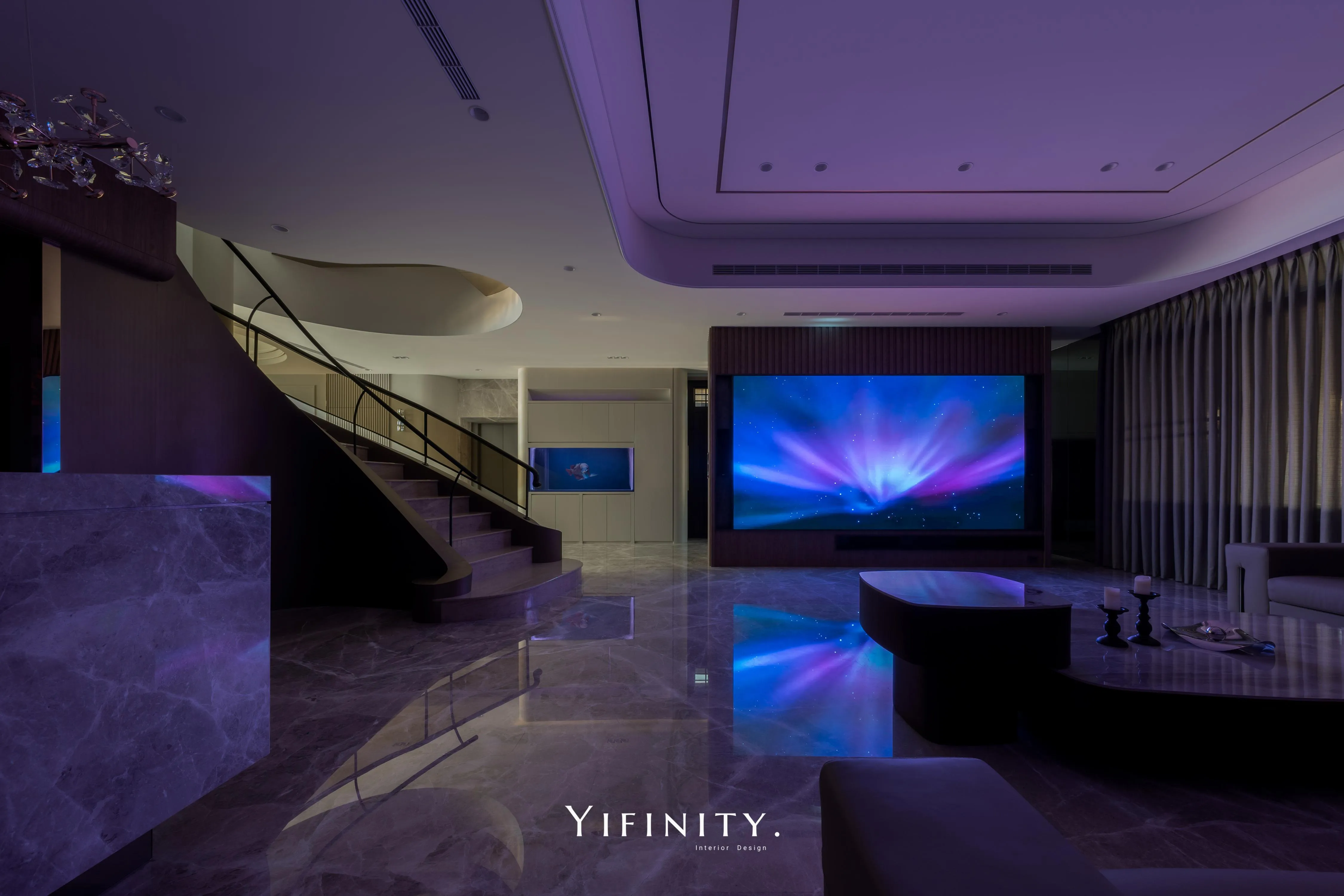 客廳以 100 吋 LED 拼接螢幕取代傳統電視,視覺尺度像劇院般展開;大理石地坪承接光影