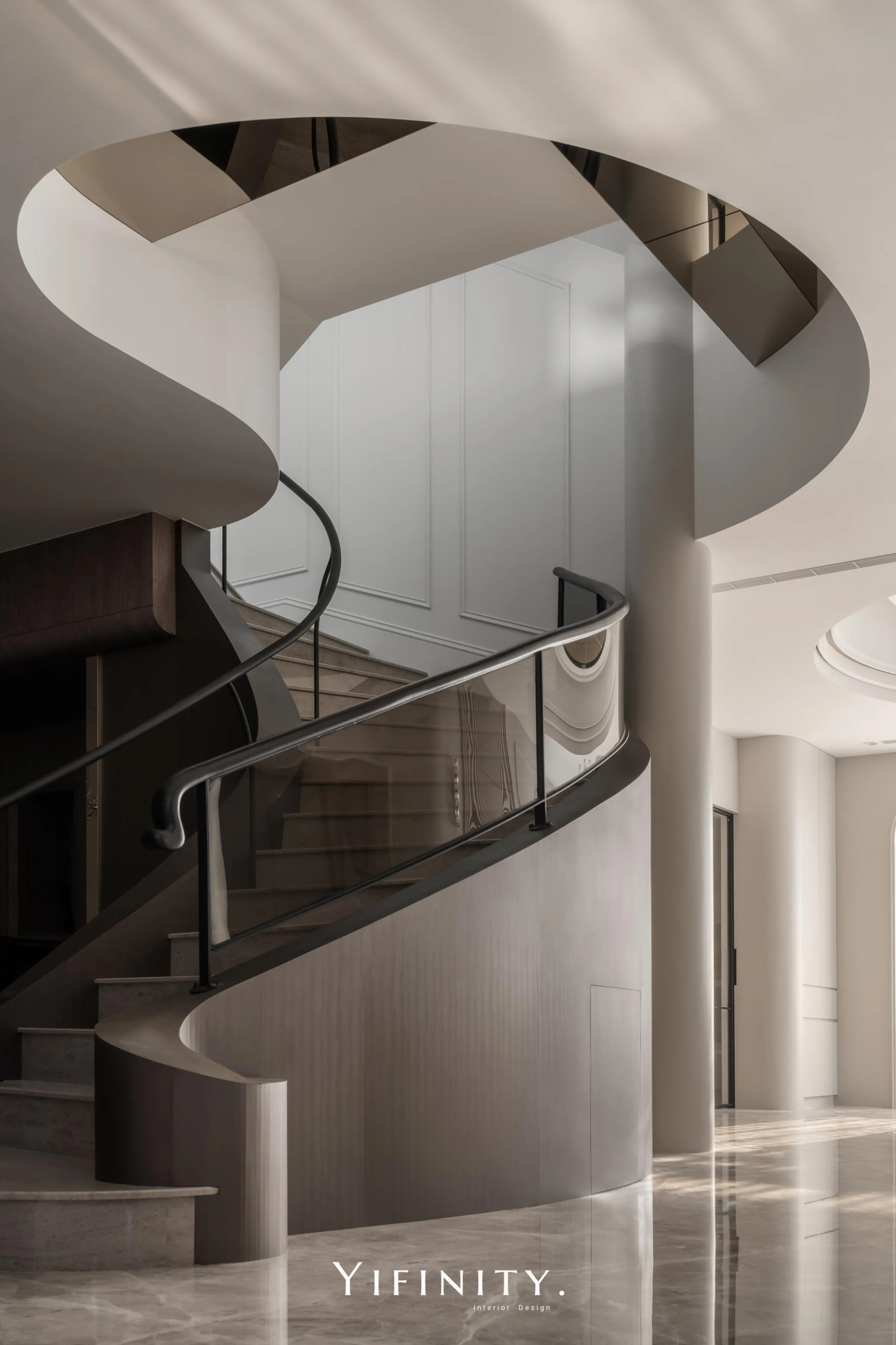 扶手採連續曲線收邊並結合弧形玻璃護欄,使量體更輕盈,也更像一件雕塑。