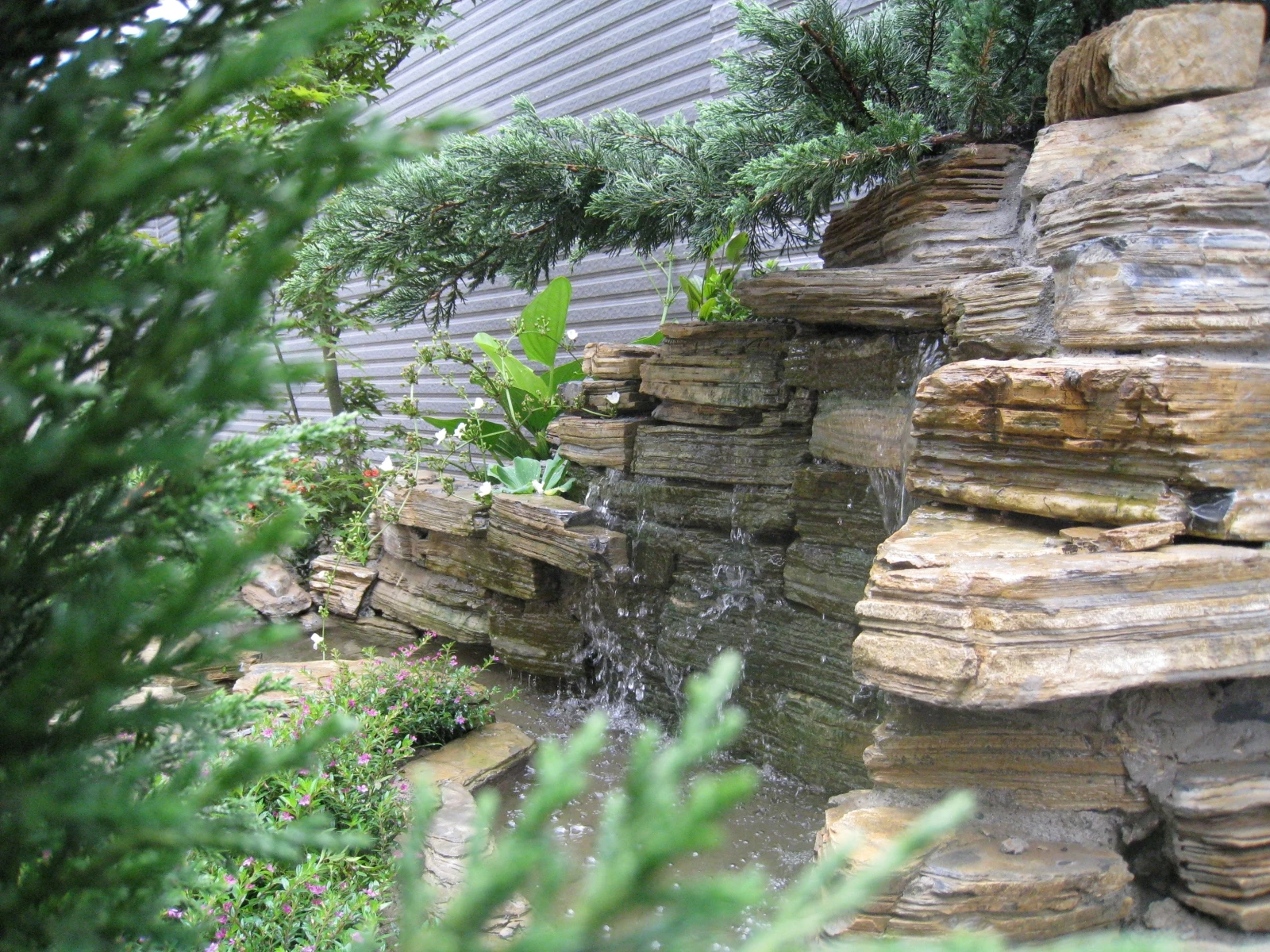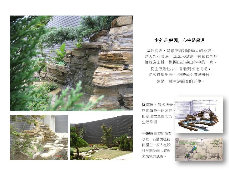 庭院設計以「山石水瀑」為主軸,搭配多層次綠意植栽,