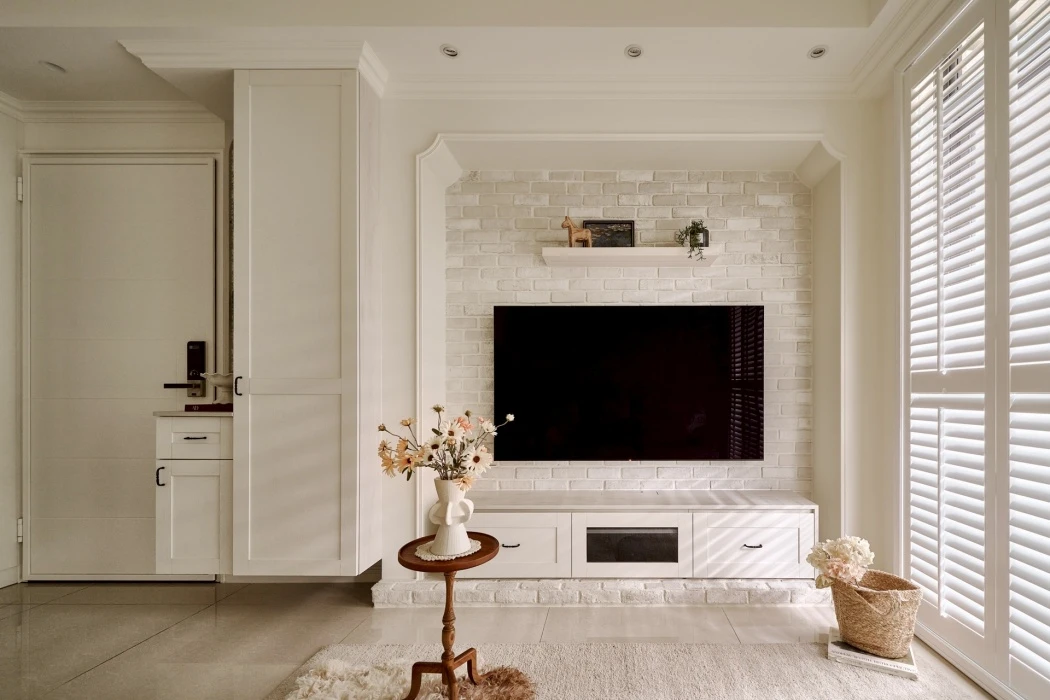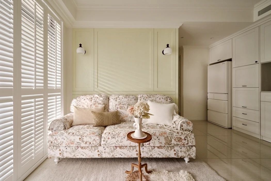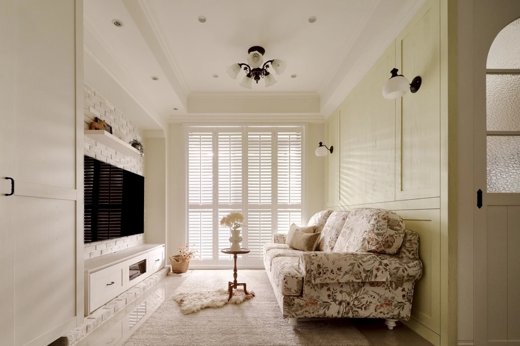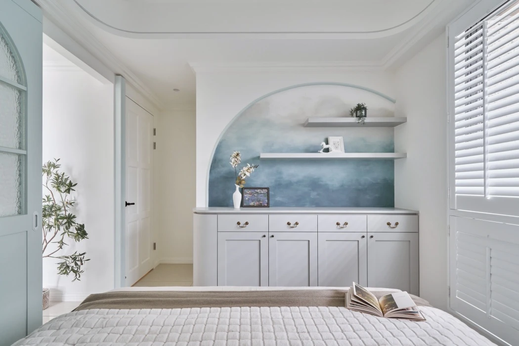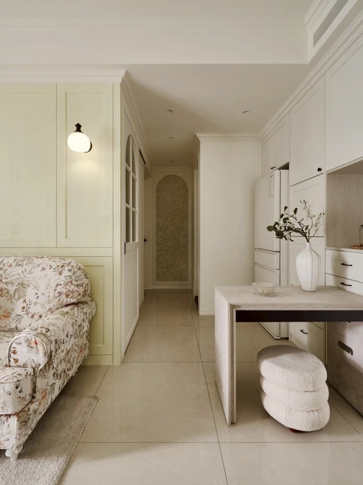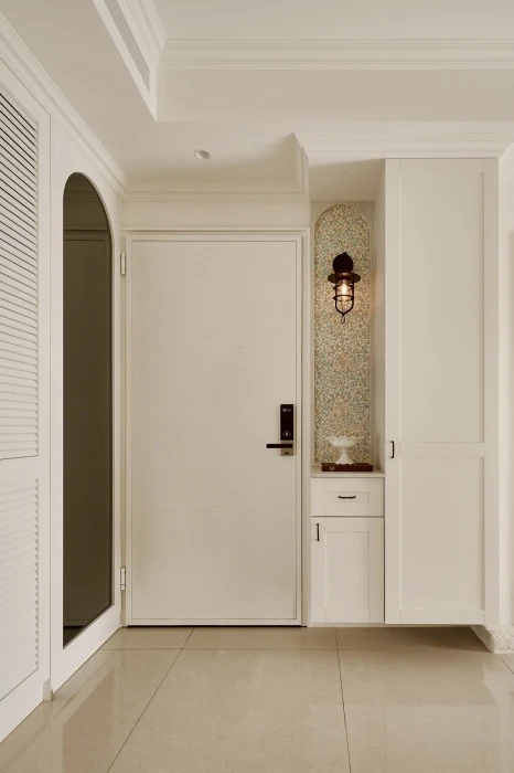 我們將美式鄉村風格中的溫暖、質樸與優雅完美融合,從基礎的線板與踢腳線開始,為空間勾勒出經典且立體的輪廓。設計語彙聚焦於屋主喜愛的圓潤造型——從玄關、走廊端景至各個門片,拱形線條象徵著圓滿與柔和,引導著歸家的腳步。