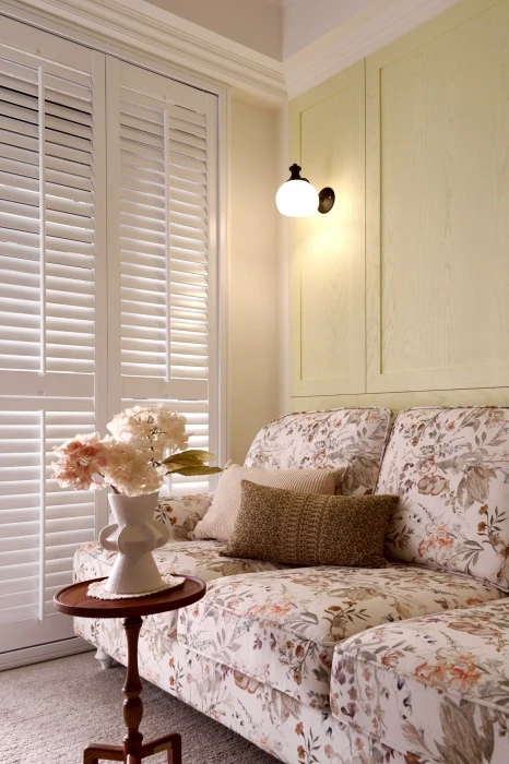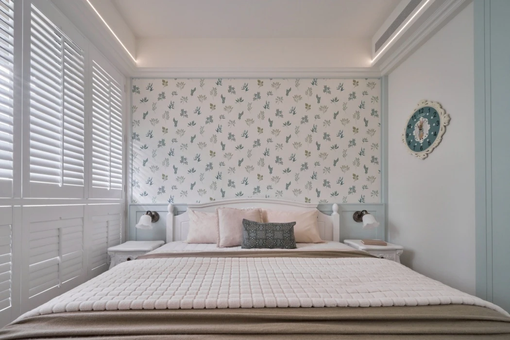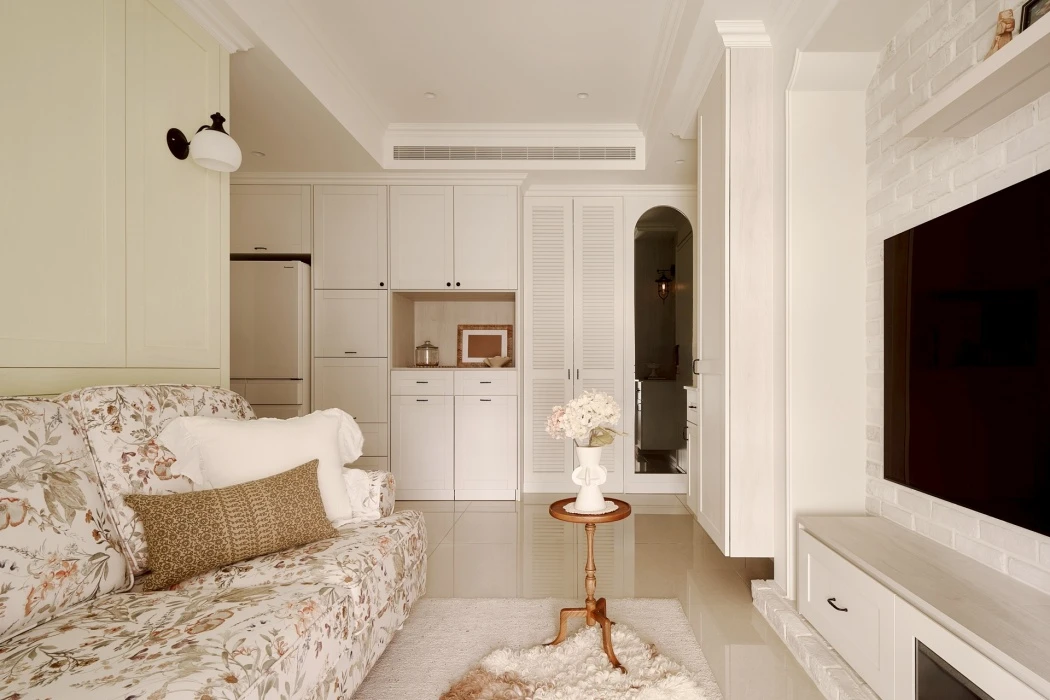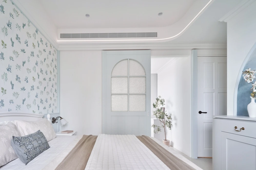 每一個細節都是為了提升居住的儀式感:氛圍燈光迎接主人歸來,小碎花壁紙點綴甜蜜日常,而精心尋覓的五金把手與壁燈則如同珠寶般點亮空間。從客廳大壁爐的穩固感,到臥房漸層藝術漆的詩意弧線,這個家是一處充滿巧思的「光影居所」,讓生活中的每一刻都沉浸在被愛與溫柔環繞的氛圍中。