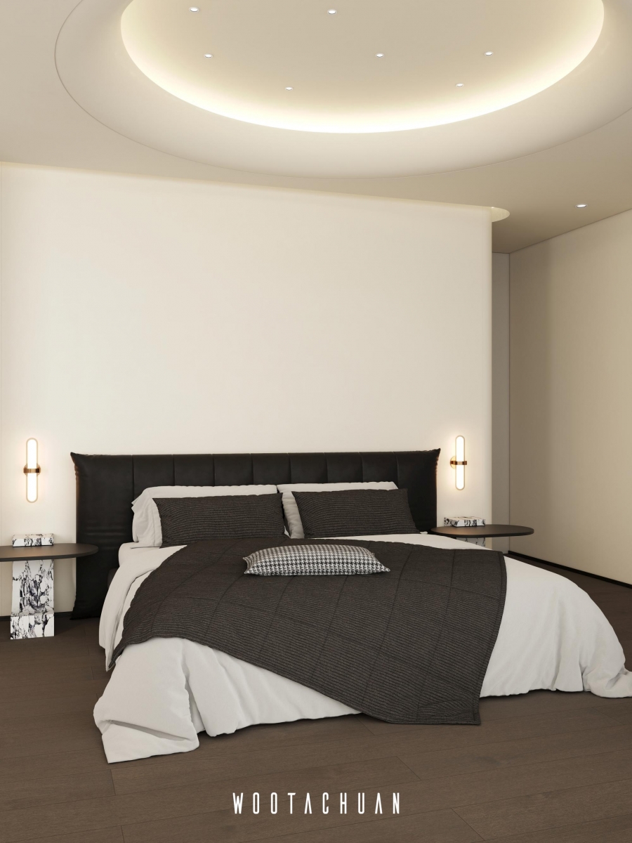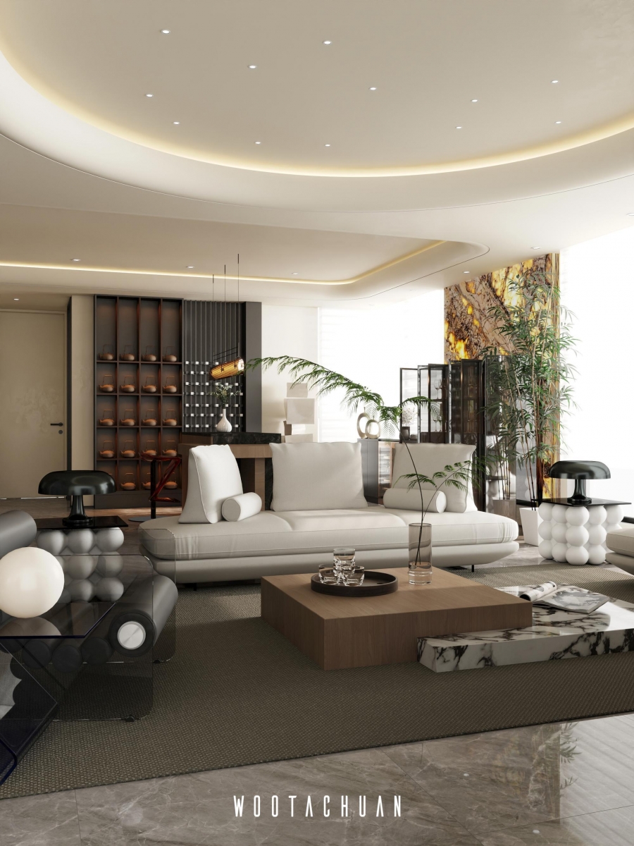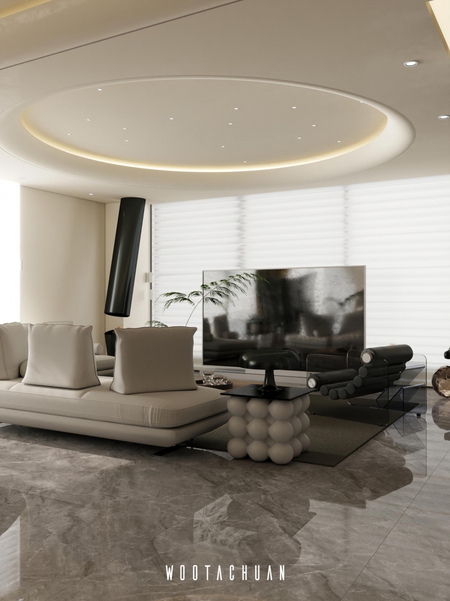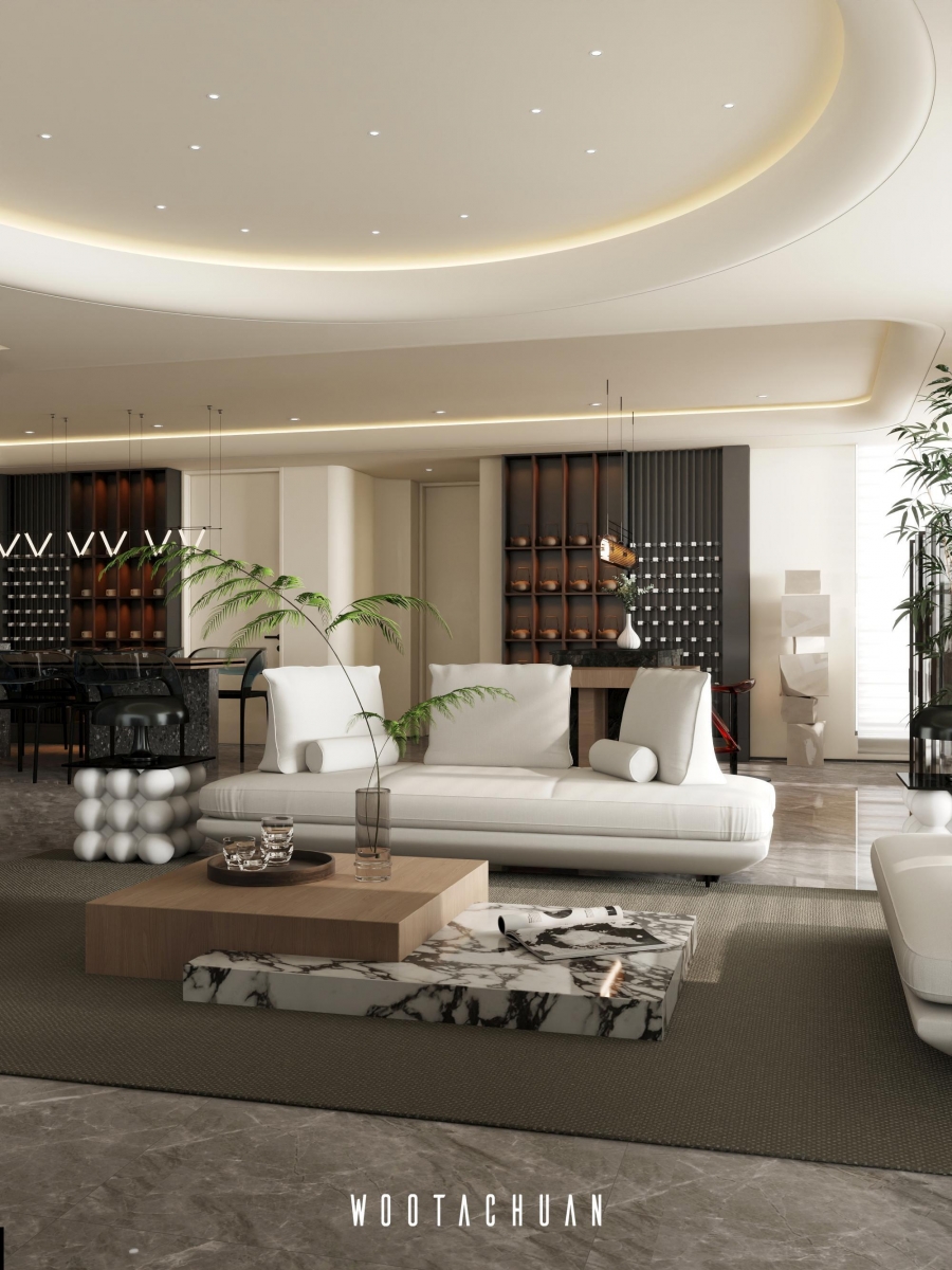 天花板設計採⽤⾯加⼯造型 融入 「天圓地⽅」 的概念