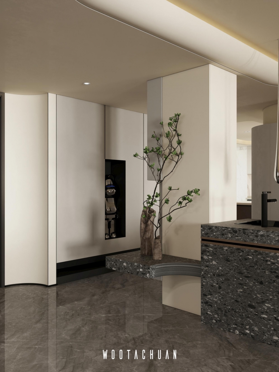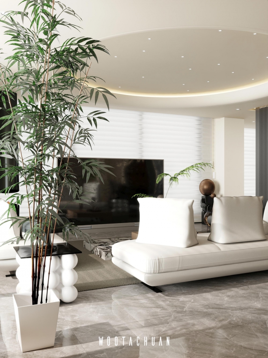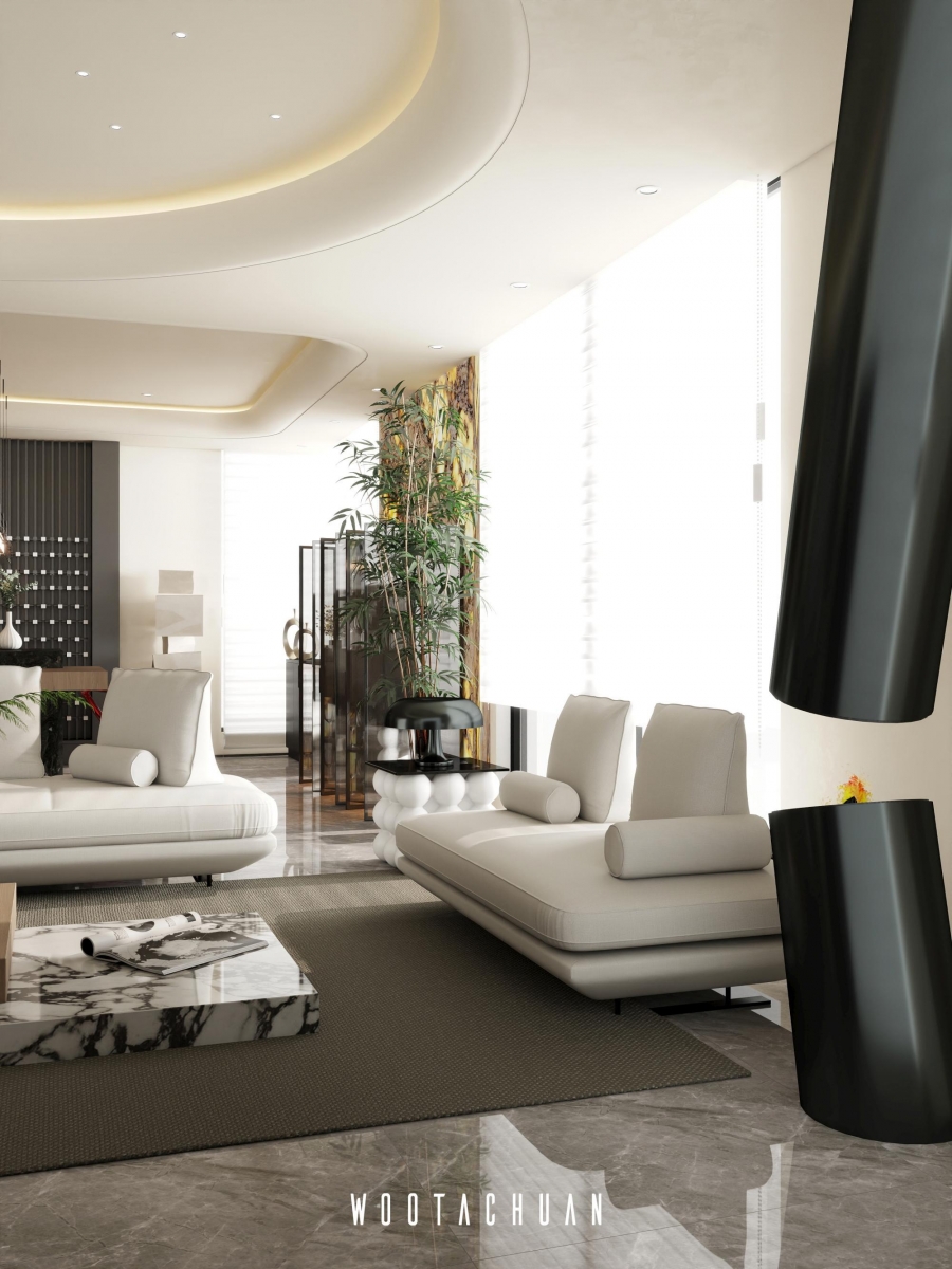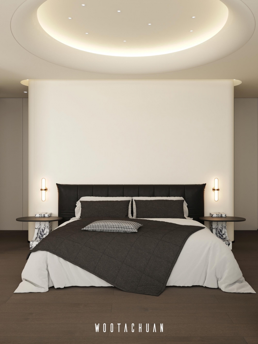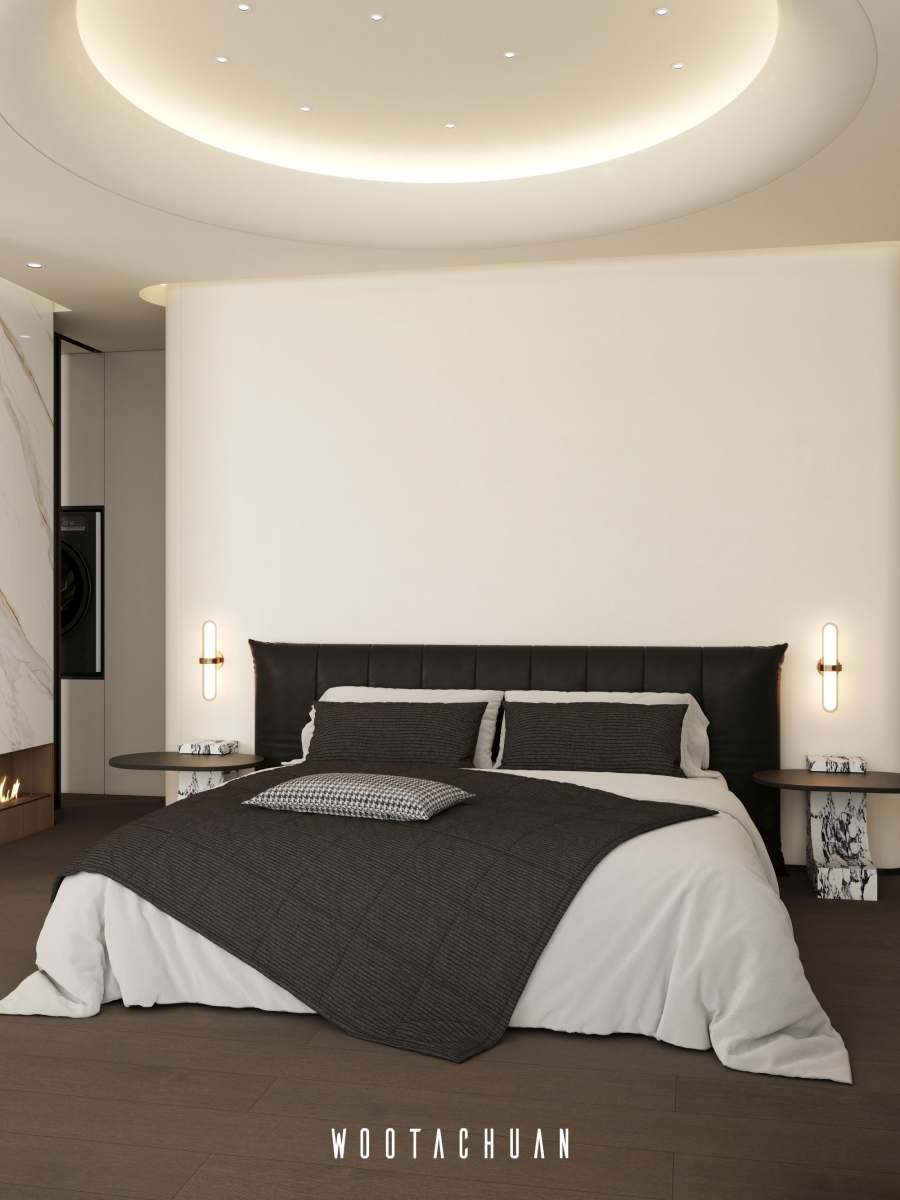 天花板設計採⽤⾯加⼯造型 融入 「天圓地⽅」 的概念