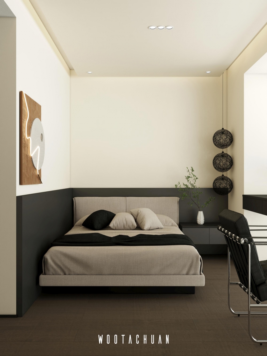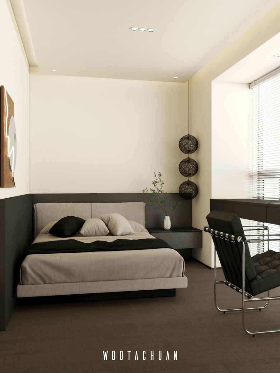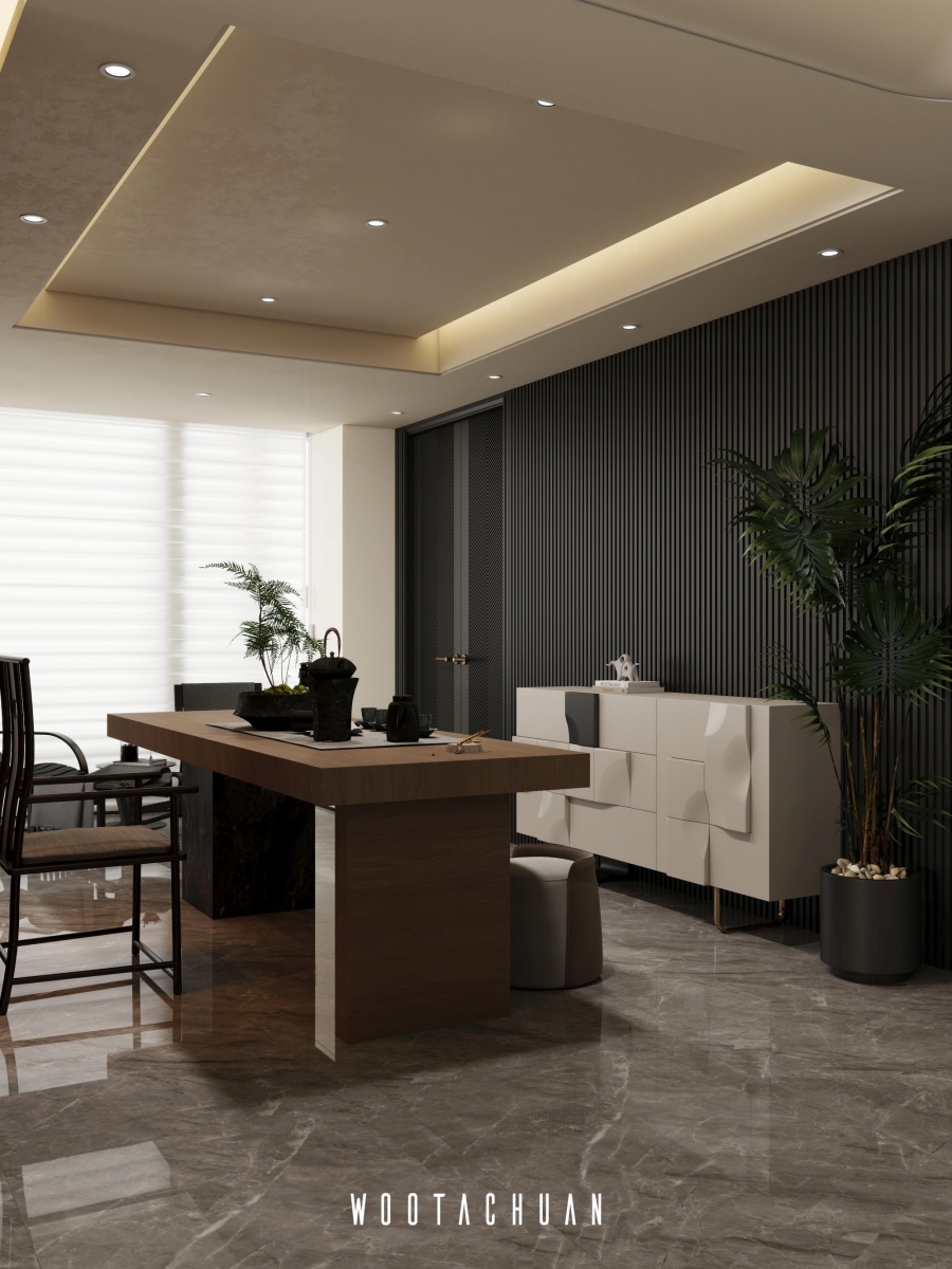 設計上 我們以極簡為基調 搭配深柚⽊的元素 營造穩重且⾃然的空間氛圍 。