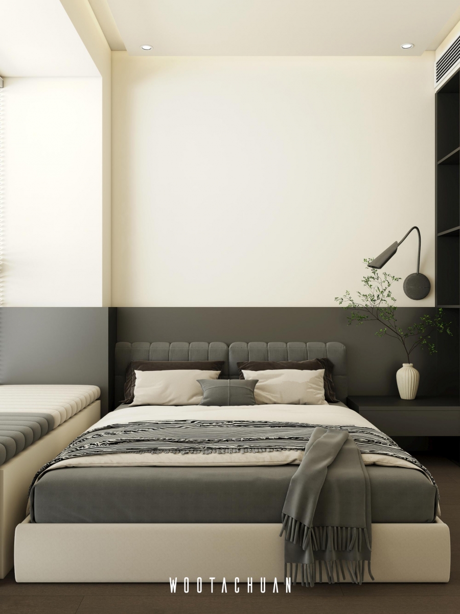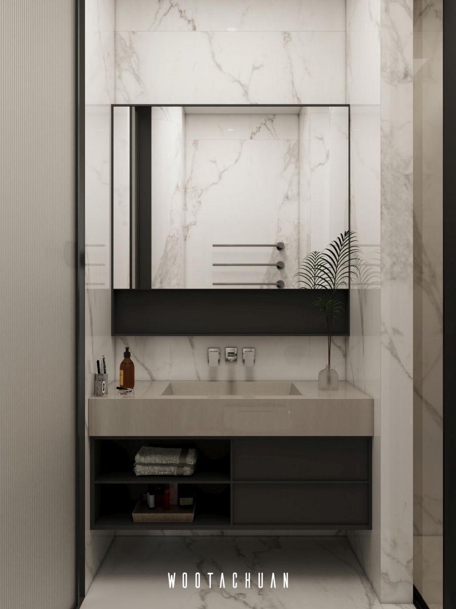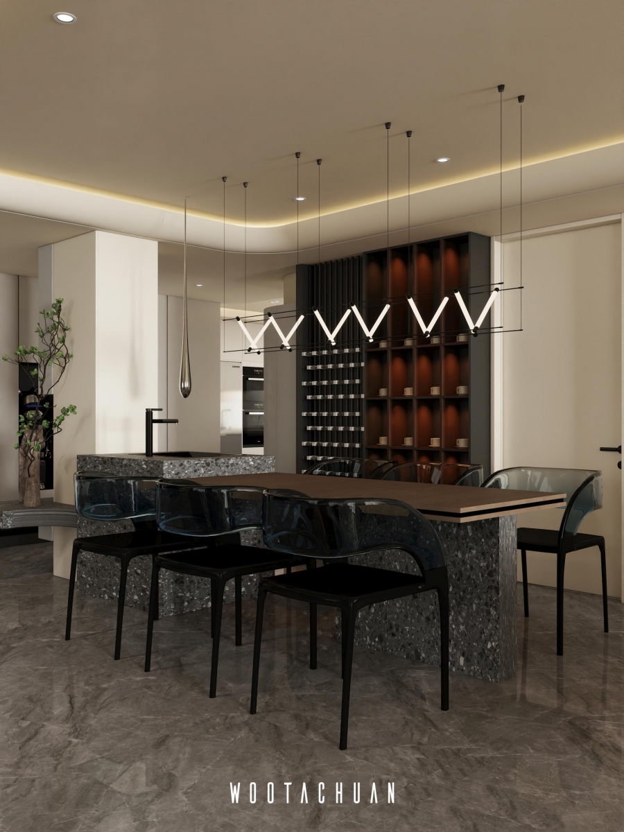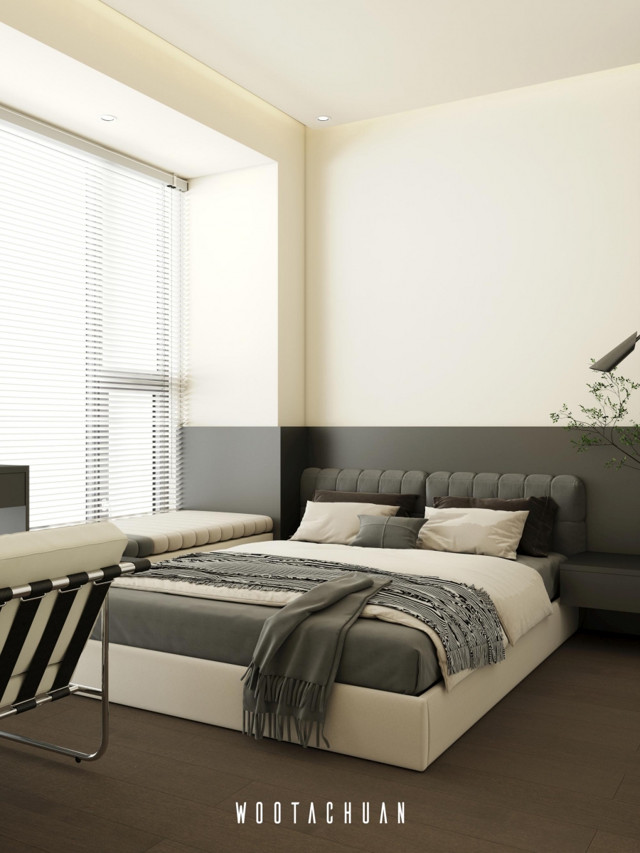 設計上 我們以極簡為基調 搭配深柚⽊的元素 營造穩重且⾃然的空間氛圍 。