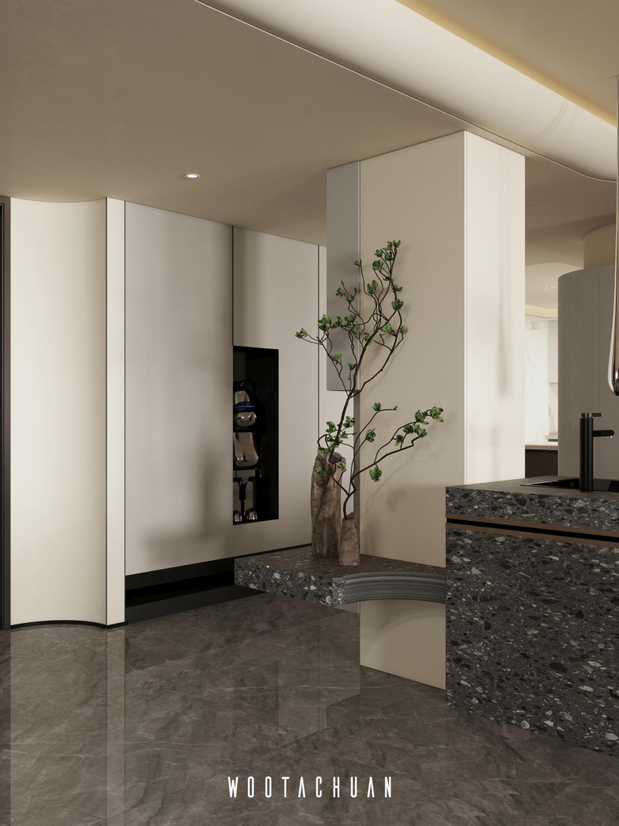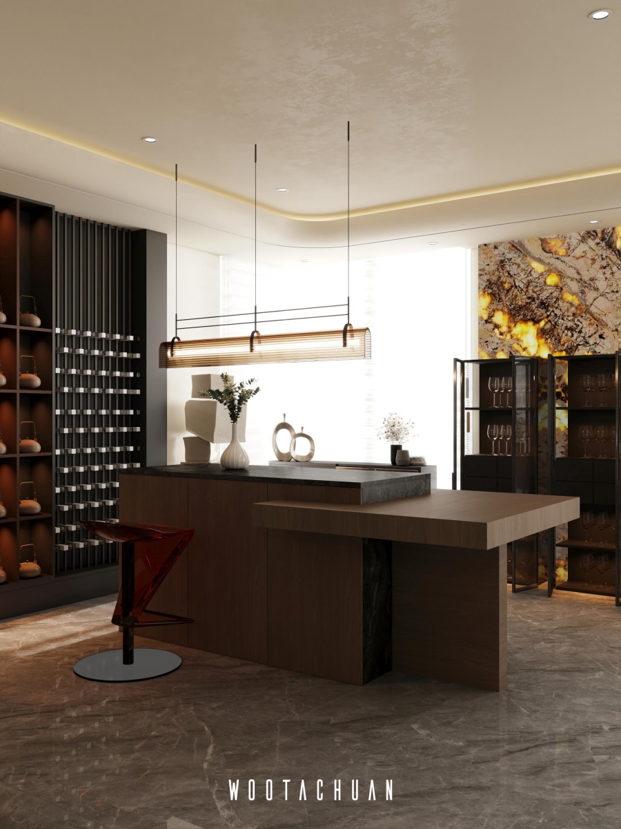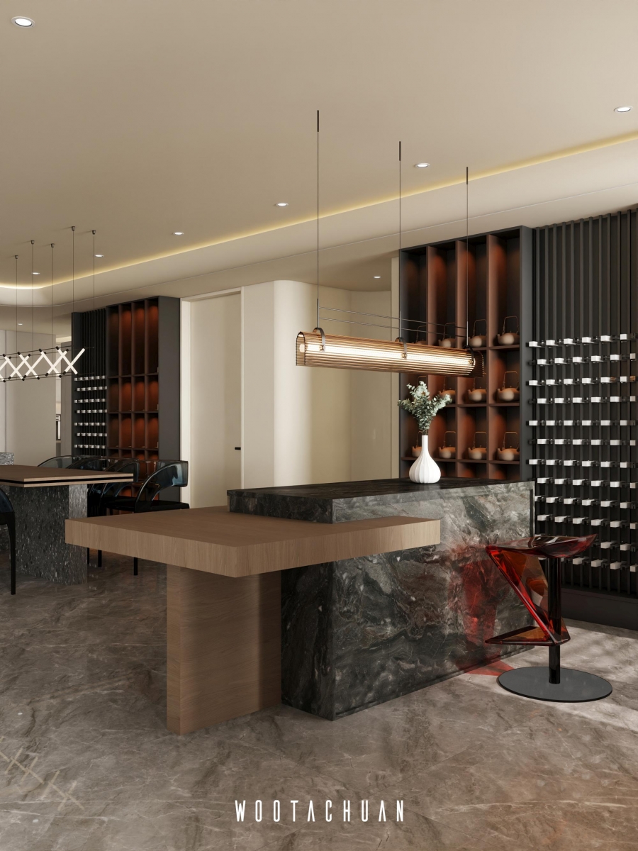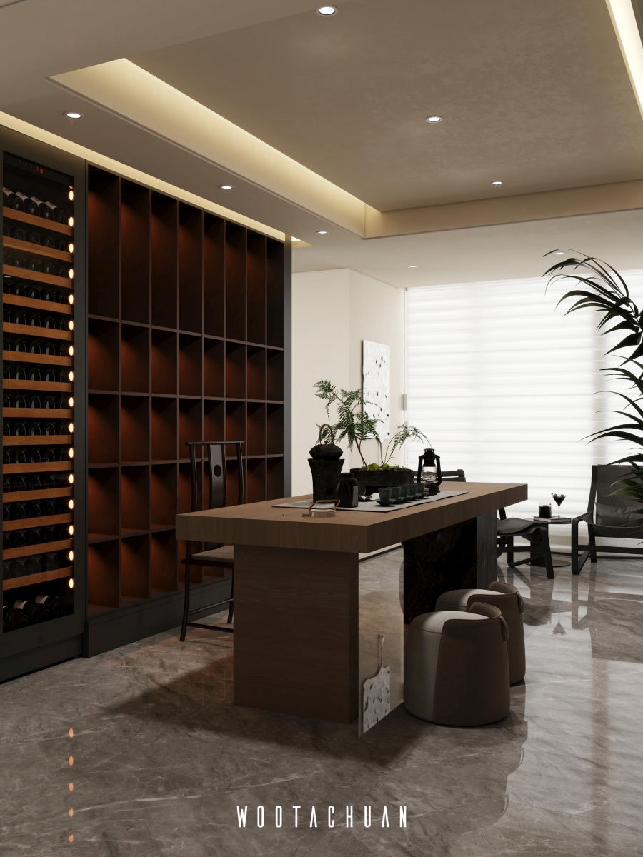 提供屋主⾃由放鬆的氛圍 。 茶室則融合酒櫃功能 成為⼀個多⽤途的休閒空間
